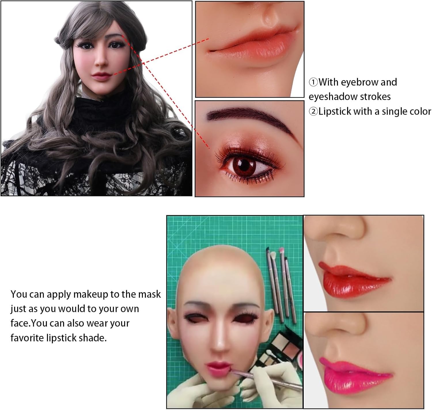 【Materia】Materiale: viene utilizzato materiale in silicone medico morbido, che non provoca allergie o disagio 【Design】 Il foro per l'occhio è vuoto, puoi guardare attraverso il foro per l'occhio e la bocca può essere aperta per parlare, mangiare e bere. E la cosa più realistica è che le sopracciglia vengono perforate manualmente 【Resiliente】La maschera in silicone si adatta alla tua vera bocca, può truccare la maschera in silicone come un vero volto femminile, eccelle nell'elasticità, può respirare, può parlare, può sentire 【Adatto per】 Applicazione: Halloween, Natale, scherzi, uomini travestiti da donne, feste 【Nota】Tipo: con trucco; La maschera può essere allungata 1-2 volte, da un lato, per garantire che non possa essere facilmente strappata quando la si indossa, dall'altro, per rendere la maschera come una seconda pelle vicino al viso, in modo da potersi muovere liberamente