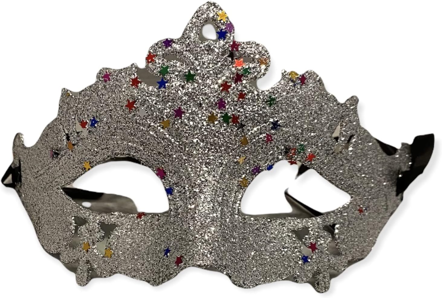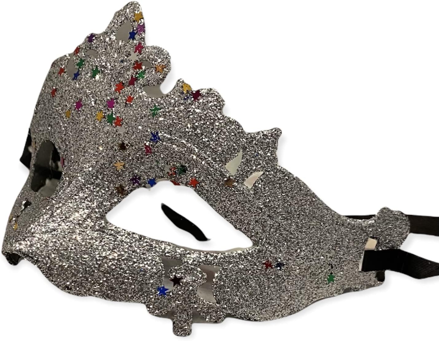 La maschera è realizzata in plastica PVC di alta qualità, la parte anteriore della maschera è in colore glitter con l'aggiunta di stelle colorate effetto metallizzato. La maschera è taglia unica per adulti e uomini e può essere regolata manualmente utilizzando le cinghie su entrambe le estremità. Design comodo, leggero e universale. Nessuno sbiadimento della vernice, nessuna colla in eccesso e nessuno sbiadimento. L'interno della maschera è liscio per non graffiare la pelle. Maschera perfetta per carnevale, feste in maschera, feste a tema, costumi alla moda, eventi privati, locali notturni. Le nostre maschere sono eleganti, sofisticate e assolutamente stupende per farti sembrare un re e una regina. Sarai misterioso, sexy ed elegante. Un prodotto indispensabile per ogni evento di carnevale. Prodotto distribuito da GMM STORE