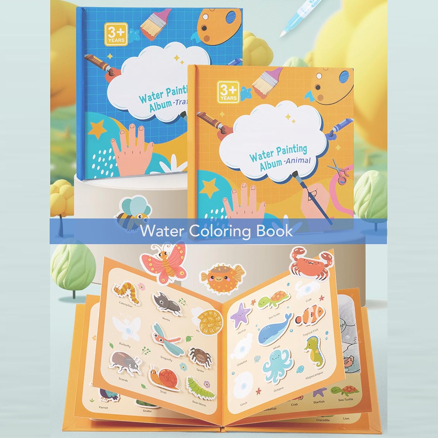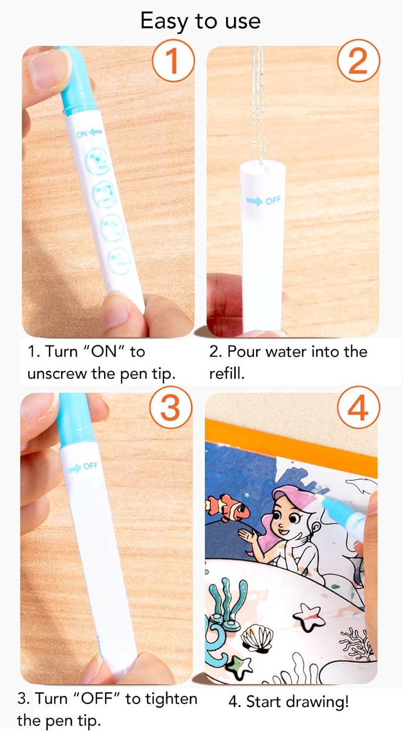 Riutilizzabile: aggiungi semplicemente acqua per rivelare colori vibranti! Questo set di pittura ad acqua comprende pagine e adesivi riutilizzabili per garantire ore di divertimento pulito e fantasioso, ideale per la casa e i viaggi. Design di lunga durata e di sicurezza per bambini: i libri di doodle sono realizzati con pagine spesse e resistenti alla lacrime che impediranno le fuoriuscite e resisteranno a un gioco infinito, rendendoli fantastici per le mani giovani e curiose. Supporta l'apprendimento precoce: il nostro giocattolo educativo per l'apprendimento precoce è progettato per coinvolgere i bambini nell'apprendimento pratico, promuovendo la coordinazione per gli occhi a mano, il riconoscimento del colore e le capacità narrative. Tutto senza schermo! Tema unico e storie infinite: The Water Drawing Book ha un tema unico, il tema unico consente ai bambini di esplorare e creare le proprie storie, incoraggiando la curiosità e il pensiero innovativo. Penna dell'acqua facile da usare: il giocattolo educativo del libro di pittura ad acqua include una penna d'acqua riutilizzabile e spessa che è facile da tenere per le mani piccole. Basta riempire, rivelare e ripetere per il gioco .