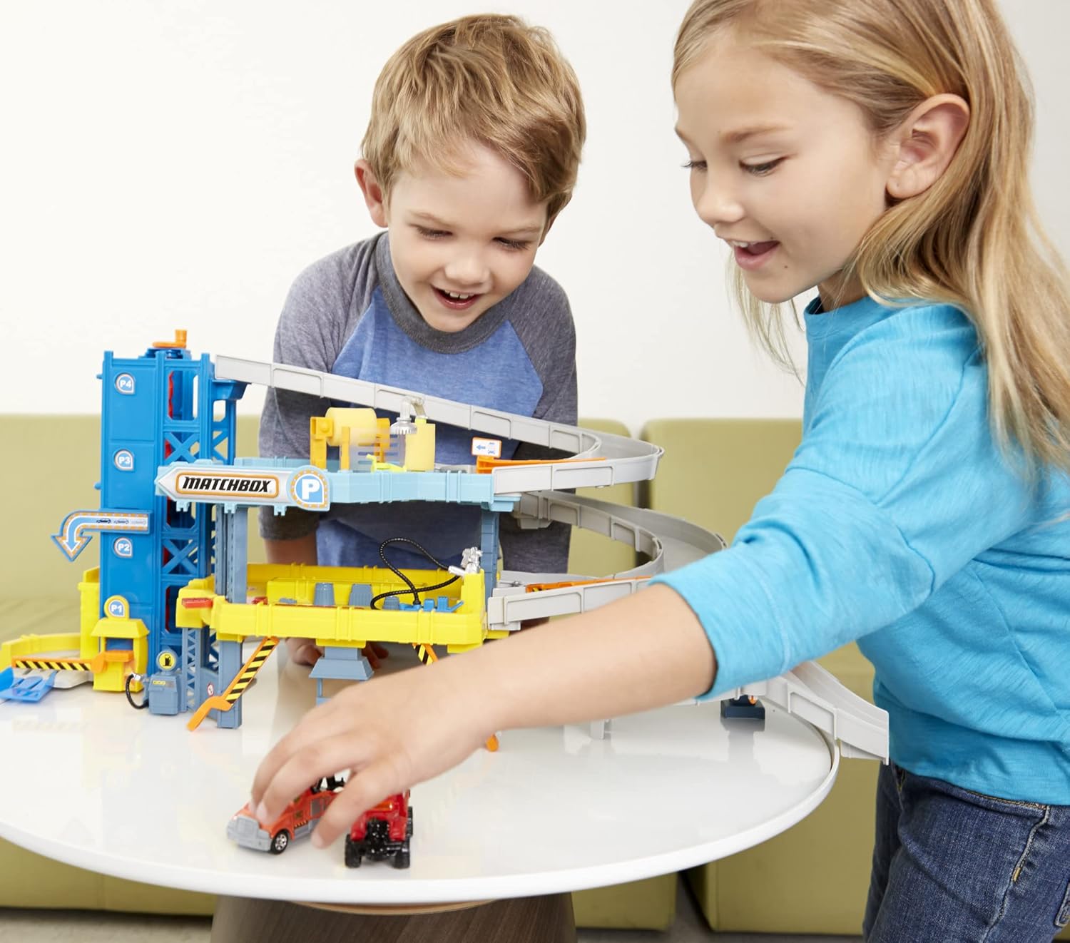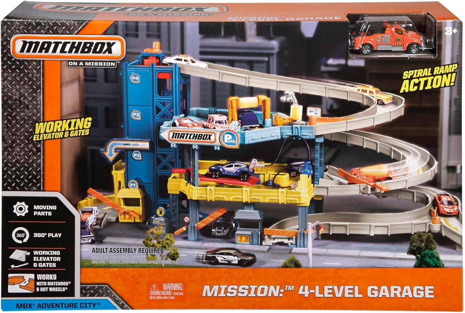 Un negozio unico per avventure reali! Quattro piani di attività che includono una rampa a spirale e un ascensore funzionante. Include un auto lavaggio per 'lavare' le auto. Stazione di servizio per 'riparare' i veicoli Matchbox. Include un rimorchio Matchbox per divertirti sin da subito.