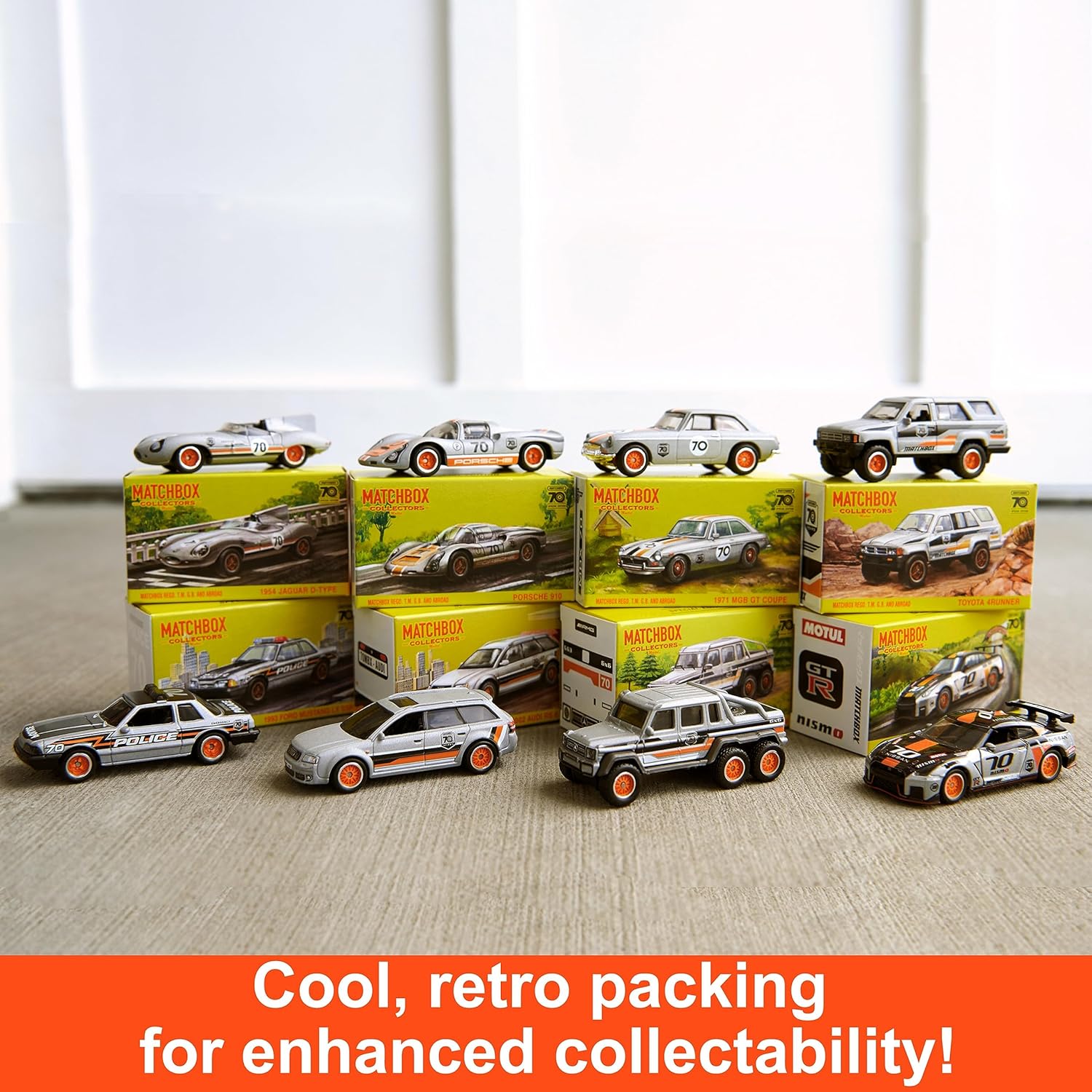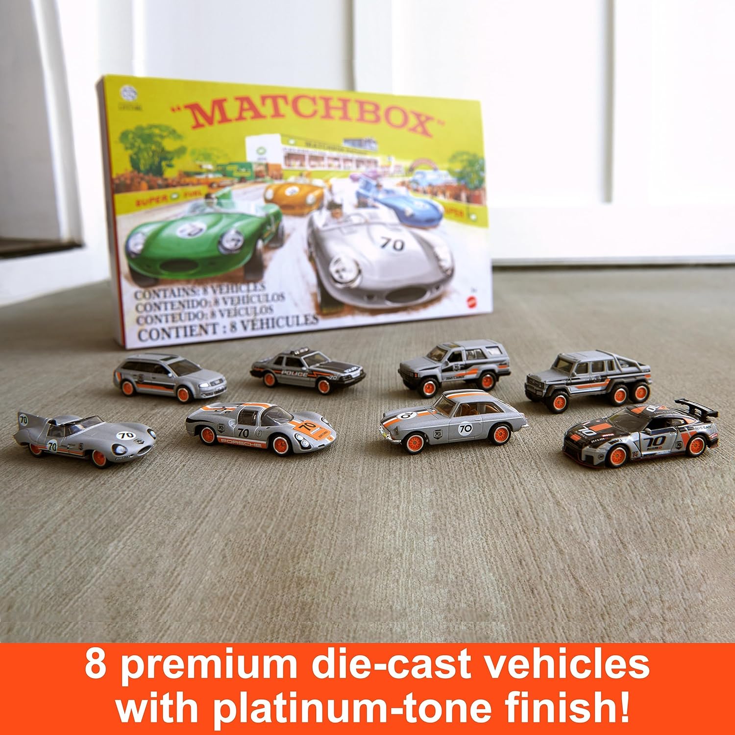 Creato per i collezionisti di Matchbox per eccellenza, questo assortimento per il 70° anniversario comprende 8 veicoli Matchbox premium in scala 1/64 in una confezione commemorativa. Ogni auto Matchbox è dotata di decorazioni dettagliate di qualità, telaio in metallo e pneumatici True Grip. Alcuni hanno anche un elemento mobile, come una portiera, un bagagliaio o un cofano che si apre e si chiude. Questa scatola riunisce 8 veicoli in metallo, di cui 1 esclusivo, pensato per i collezionisti. Tutti hanno una speciale finitura in platino del 70° anniversario, oltre a caratteristiche estremamente dettagliate e realistiche. La scatola sigillata premium presenta design classici che onorano la tradizione Matchbox. I collezionisti adoreranno questo cofanetto premium, perfetto per il divertimento o l'esposizione.