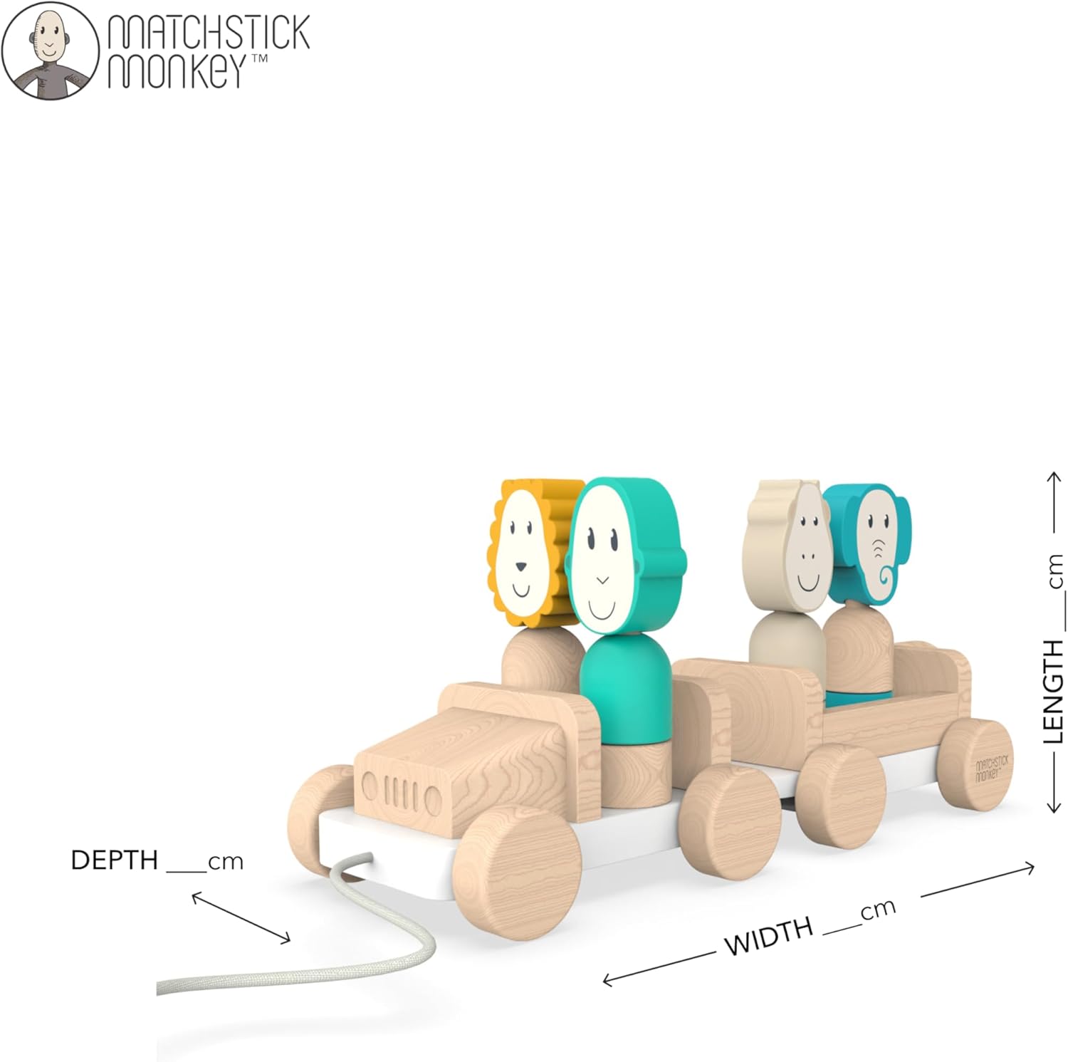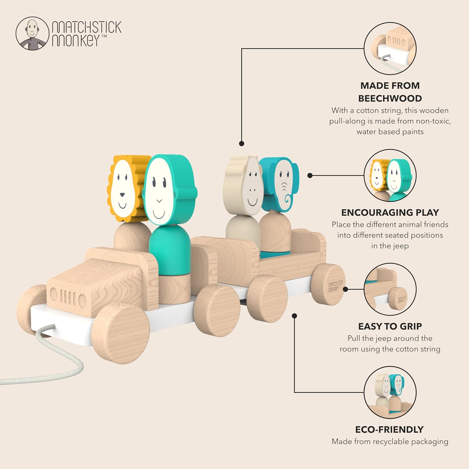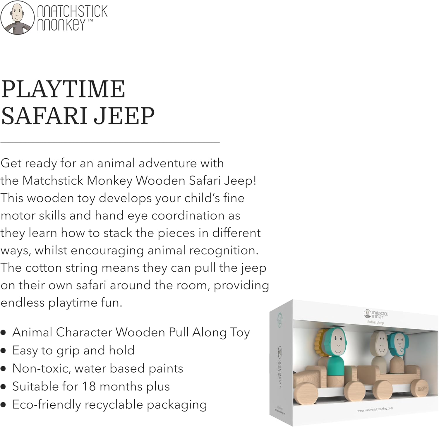 Divertimento infinito: preparati per un'avventura animale con la jeep Safari in legno Matchstick Monkey Sviluppa la coordinazione: questo giocattolo in legno sviluppa le capacità motorie e la coordinazione occhio-mano del tuo bambino mentre impara a impilare i pezzi in modi diversi, incoraggiando il riconoscimento degli animali. Alta qualità: la corda di cotone significa che possono tirare la jeep nel loro safari in giro per la stanza, fornendo divertimento senza fine. Da 18 mesi: realizzato in legno di faggio e utilizzando vernici atossiche a base d'acqua, questo giocattolo impilabile in legno è adatto per bambini dai 18 mesi in su.