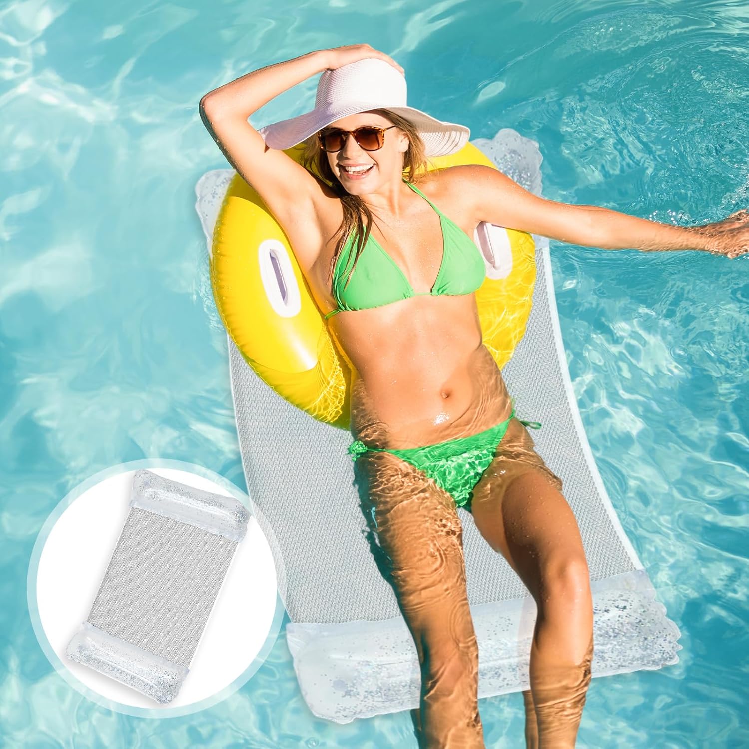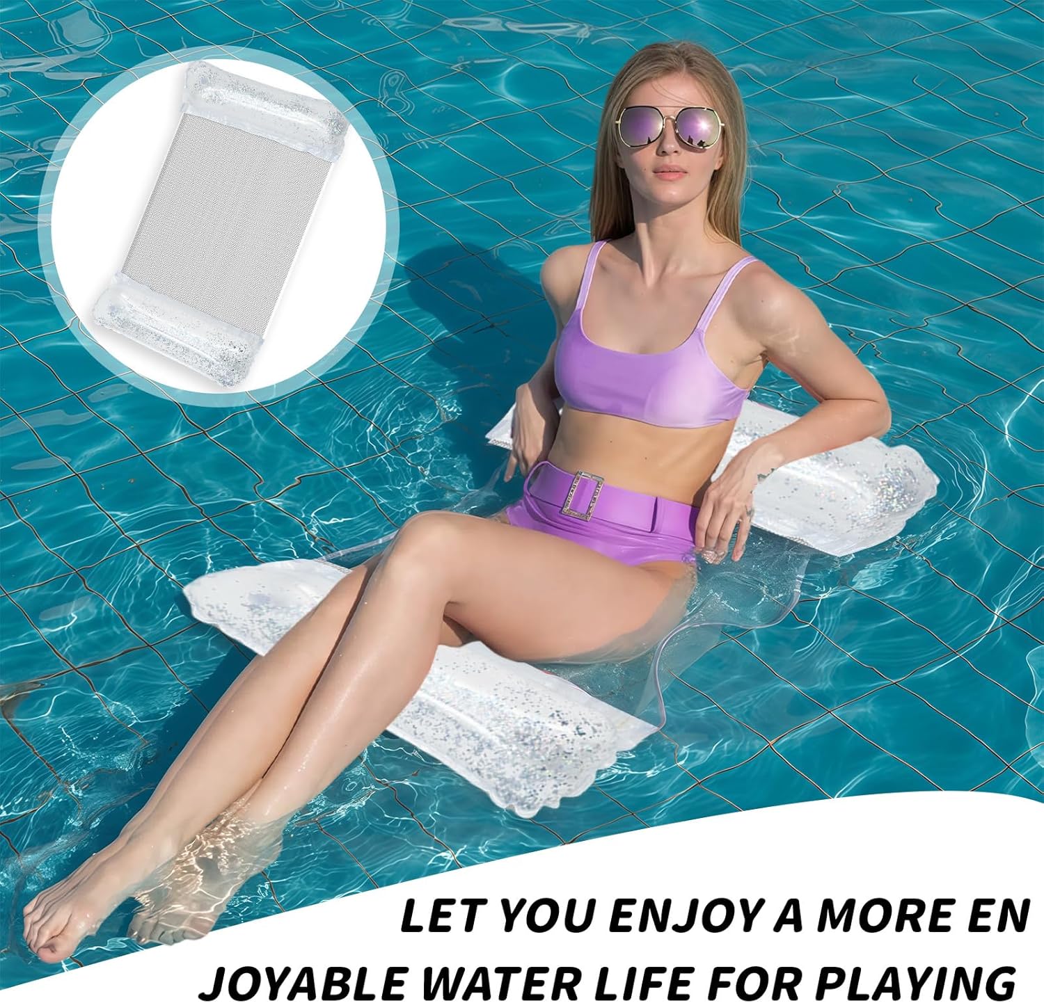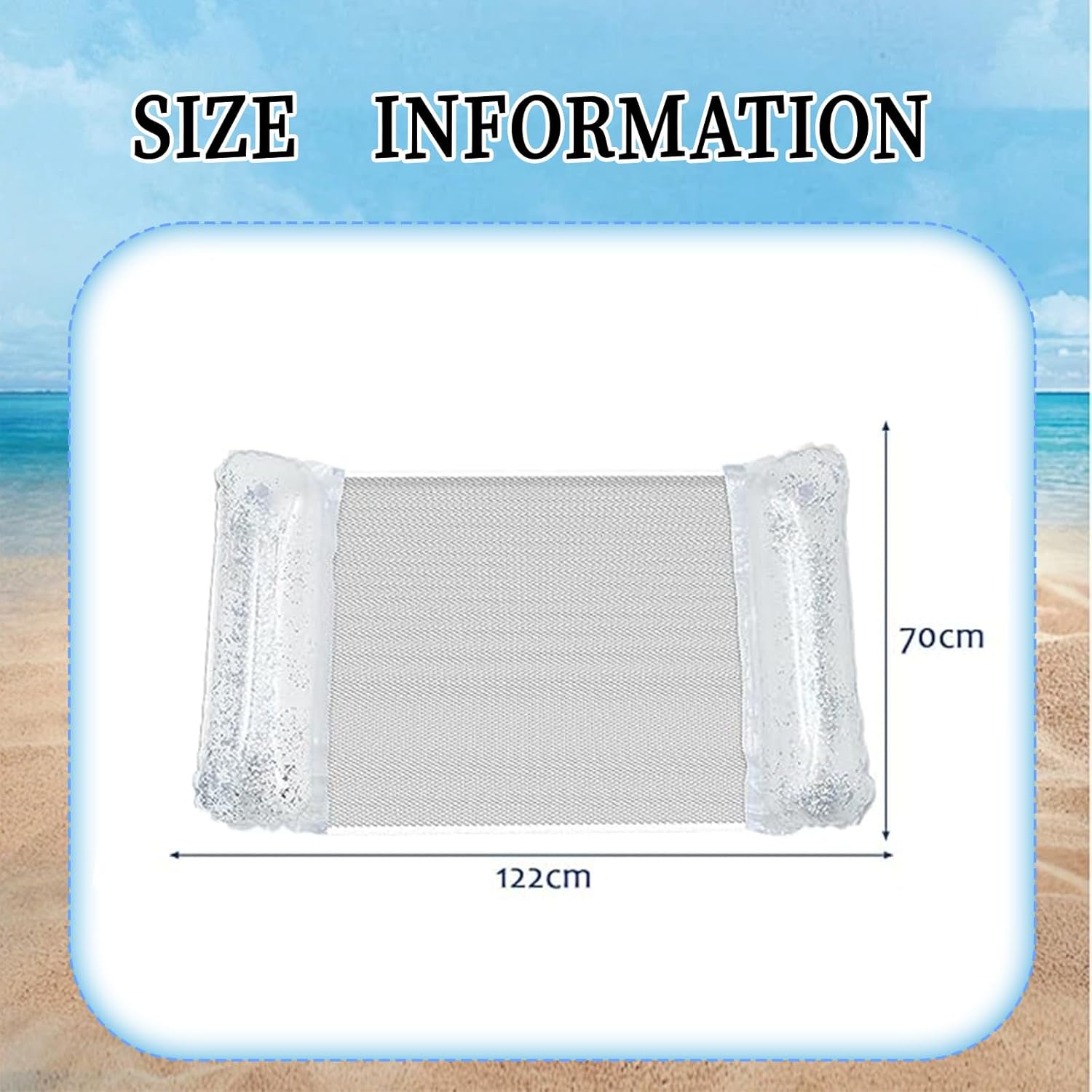 Amaca glitterata: diventa la protagonista di ogni festa. Il design trasparente con particelle scintillanti di glitter rende questa amaca acquatica l'accessorio definitivo per le feste in piscina. Pur essendo un pezzo unico, funge da set completo di accessori per piscina per il massimo divertimento ed è un must assoluto per indimenticabili giornate estive. Grande capacità di carico: grande capacità di carico extra potente e grande capacità di carico fino a 150 kg. La sostenibilità incontra il design. Questo materasso gonfiabile per piscina è realizzato in PVC a 3 strati antistrappo con rivestimento anti-UV. La struttura robusta la rende l'amaca da piscina perfetta per adulti e bambini. Una scelta affidabile che ti renderà felice per molte estati. Cuscino galleggiante ergonomico: goditi un lussuoso relax sulla nostra amaca acquatica con rete. Progettato come un letto gonfiabile in rete ad acqua, la morbida superficie per dormire in rete garantisce un raffreddamento perfetto, mentre i poggiapiedi ergonomici sostengono perfettamente il tuo corpo. Perfetto per ore di abbronzatura e relax in acqua. Gonfiaggio veloce: grazie all'innovativa valvola, questo gioco acquatico si gonfia e sgonfia in 90 secondi. Il design leggero e pieghevole rende il trasporto e lo stoccaggio un gioco da ragazzi. Perfetto per le vacanze, le gite in spiaggia o la visita spontanea in piscina. Il tuo compagno ideale per i viaggi. Multifunzione: goditi la pura flessibilità con il nostro materasso gonfiabile per piscina. Che si tratti di una rilassante amaca da piscina, di un comodo lettino, di un drifter o di una sella ad acqua, questo giocattolo gonfiabile multifunzionale si adatta ad ogni stato d'animo e trasforma ogni giornata in acqua in una nuova avventura piena di relax e gioco.