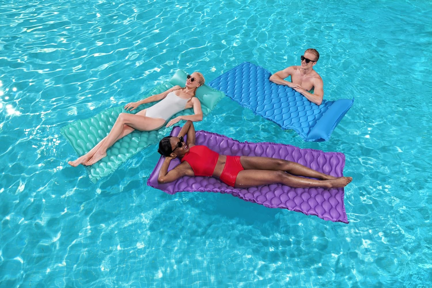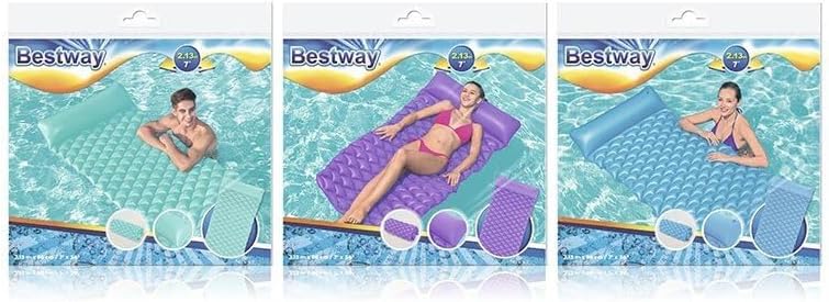 Dimensioni: 213 x 86 cm Assortiti in 3 colori, cuscino integrato, struttura a nido d'ape PVC resistente Gonfia rapidamente, facile da trasportare e riporre Contenuto: 1 materasso ad aria, 1 toppa di riparazione