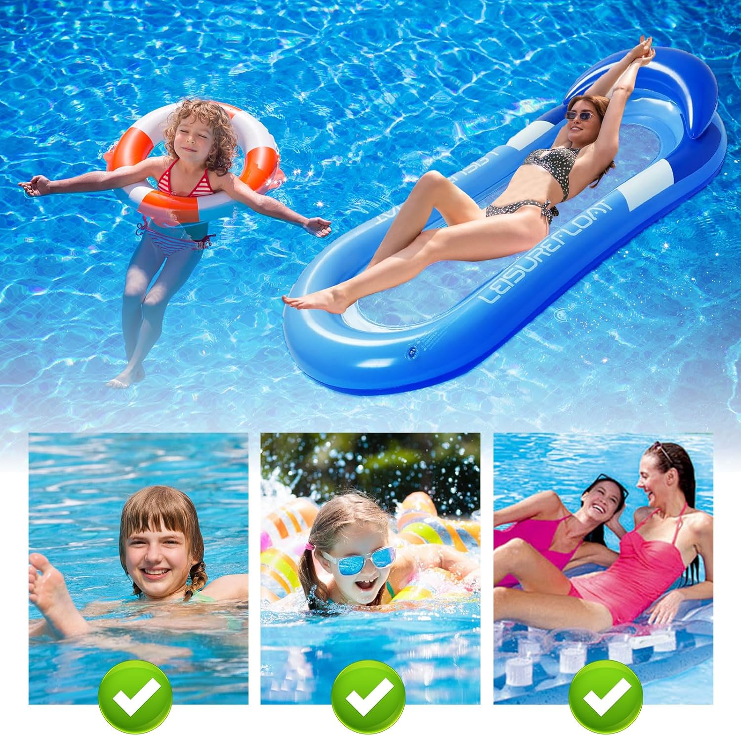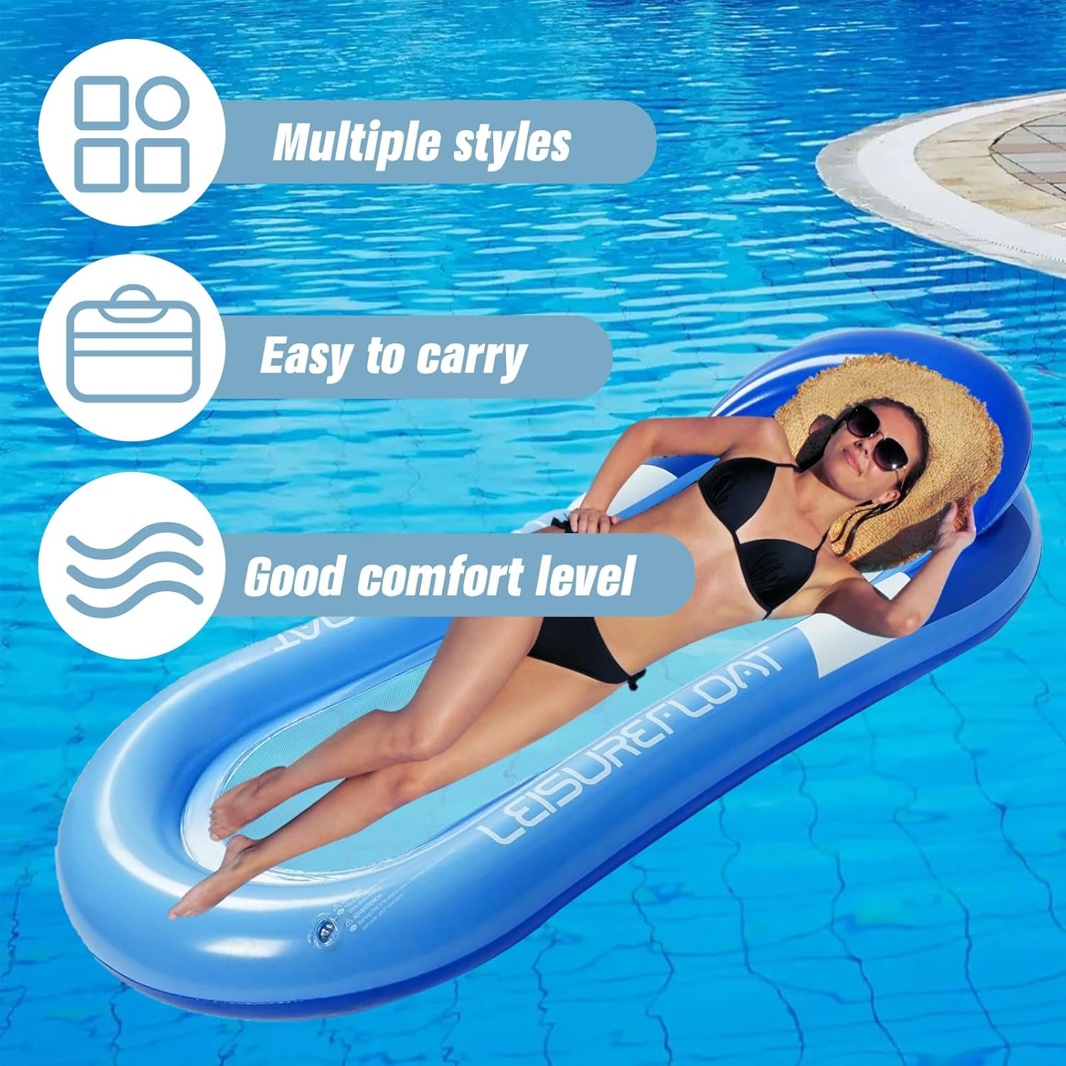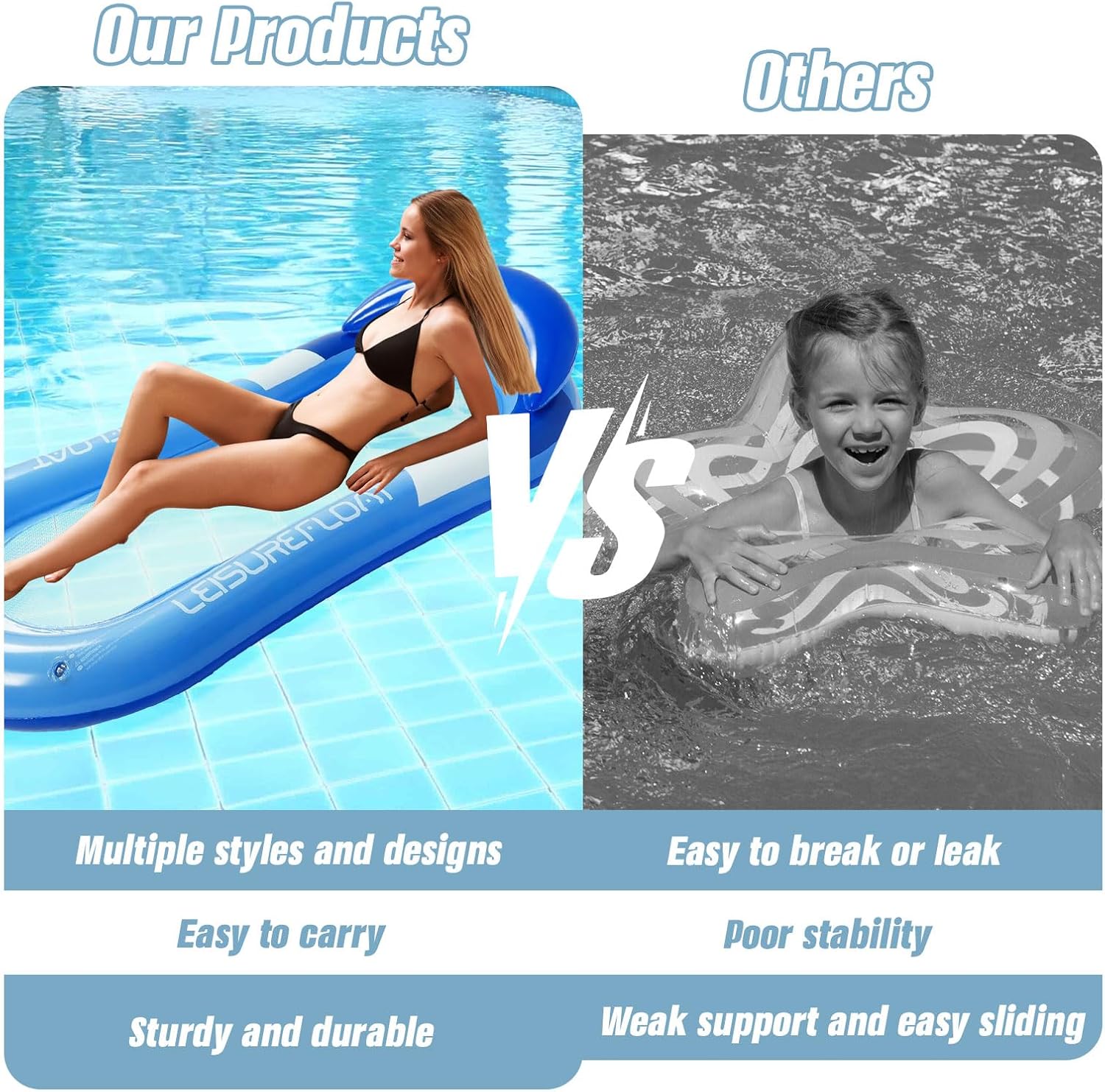 【Materasso gonfiabile per piscina】 Il materasso gonfiabile per piscina è dotato di un morbido poggiatesta regolabile, si adatta alla curva del collo e distribuisce efficacemente la pressione sulla testa. Sia che vi stendiate sulla schiena per guardare le stelle o che facciate un pisolino con gli occhi chiusi, potrete godervi la sensazione di sostegno, come una nuvola, senza alcuna pressione e quindi rilassarvi ancora meglio. 【Materiale di Alta Qualità】 Il materasso gonfiabile per bambini è realizzato in PVC di alta qualità, ha un rivestimento anti-UV sulla superficie, resistente allo strappo e all'invecchiamento ed è morbido come la pelle; Grazie ai bordi rinforzati e ad una portata di 200 kg, tutta la famiglia può condividere il letto senza preoccupazioni. 【Design del prodotto】 Design dell'airbag indipendente a doppio strato dell'amaca ad acqua. Lo strato superiore è morbido e delicato sulla pelle, mentre gli airbag rinforzati nello strato inferiore migliorano la stabilità di galleggiamento. Può rimanere stabile anche quando il contenuto della piscina fluttua. È dotato di una superficie strutturata antiscivolo che garantisce sicurezza e tranquillità. 【Gonfiaggio rapido】 La valvola dell'aria a due vie incorporata nel lettino gonfiabile della piscina, compatibile con la maggior parte delle pompe ad aria e può essere completamente gonfiata in 3 minuti. Il design del raccordo di drenaggio accelera il drenaggio dell'acqua. Una volta riposto, può essere facilmente riposto nello zaino. può essere portato con sé in qualsiasi momento e non costituisce un peso durante i viaggi all'estero. 【Scenari multipli】 Materasso ad aria per piscina Non solo adatto per piscine, ma può anche essere utilizzato come supporto per campeggi in cortile; Il cuscino del poggiatesta con cuscino d'aria diventa immediatamente galleggiante; può essere regolato liberamente per soddisfare le esigenze di diversi scenari, sdraiato, mezzo seduto fluttuante puramente, può essere adattato in modo flessibile alle preferenze personali.