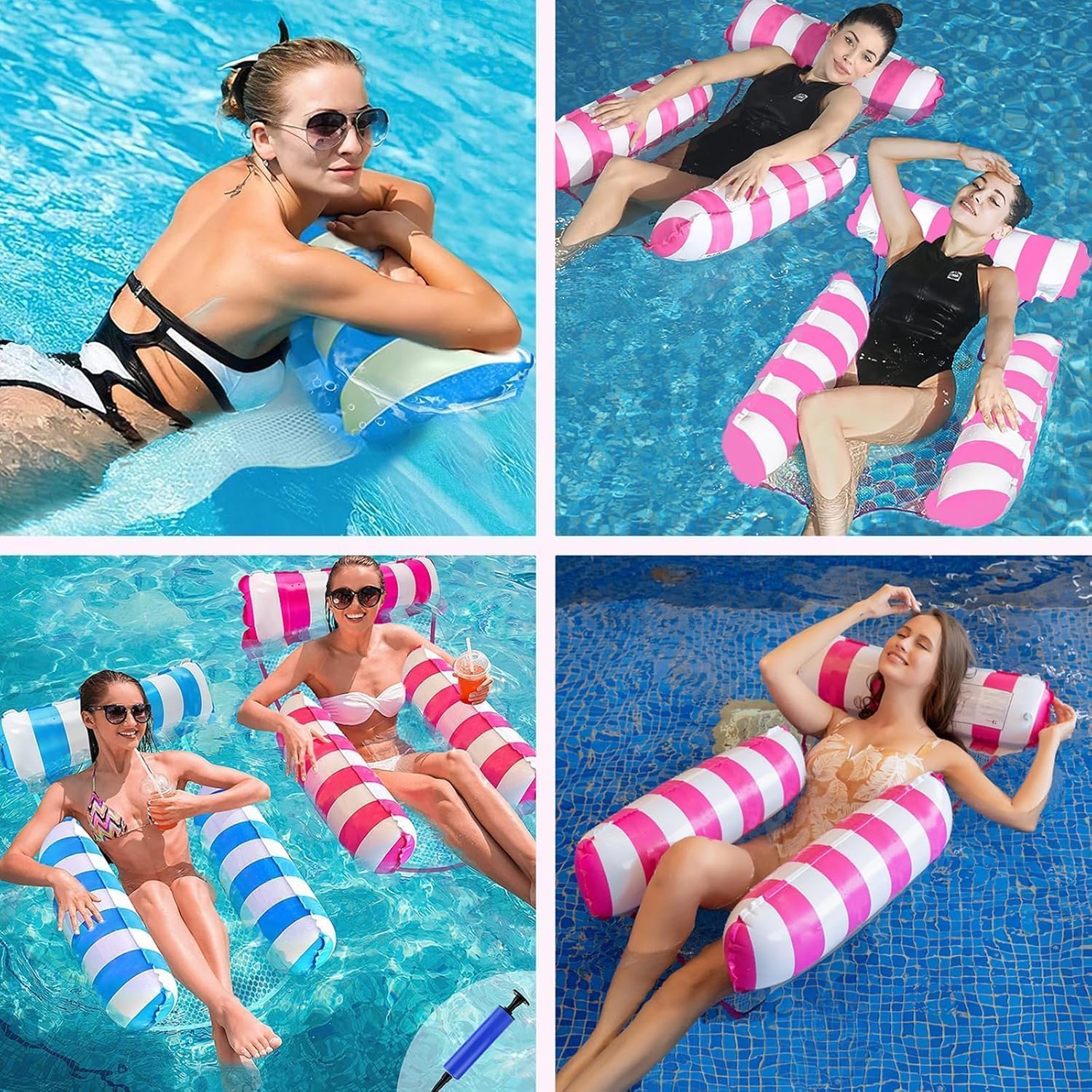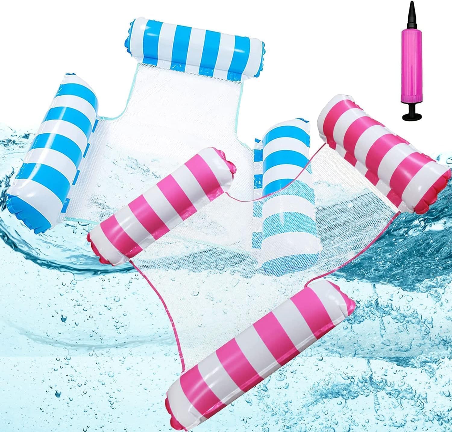 【Gonfiaggio facile】 Utilizzando una pompa, aprire la tasca galleggiante del lettino, inserire la pompa, pompare su e giù, quindi chiudere rapidamente la tasca e arrotolarla il più lontano possibile fino a quando non può più essere arrotolata. È così semplice, puoi ottenere una sedia color caramello molto comoda. Poltrona lounge galleggiante: questa poltrona lounge galleggiante è dotata di quattro grandi cuscini gonfiabili per fornire una maggiore galleggiabilità e un supporto più confortevole, permettendoti di goderti l'acqua nella posizione più rilassata. Il set comprende 2 amache galleggianti per piscina (rosa e azzurro) e una pompa ad aria. Ideale per prodotti gonfiabili per piscine. Usi multipli: il lettino galleggiante 4 in 1 può essere utilizzato come poltrona, amaca, sella e galleggiante. Se vuoi rilassarti e distenderti a bordo piscina, usa la nostra amaca ad acqua. Se vuoi goderti l'acqua o conversare, questa poltrona lounge galleggiante è la scelta migliore. Materiale di alta qualità: questa poltrona lounge galleggiante è realizzata in materiale PVC di alta qualità, sicuro ed ecologico, durevole, non facile da perdere, in grado di sopportare carichi pesanti, il cuscino del sedile è realizzato in rete con buona permeabilità all'acqua, che può mantenerti fresco. Facile da riporre, basta sgonfiarlo e piegarlo semplicemente per riporlo. Relax: Se vuoi trascorrere il tuo tempo libero a bordo piscina, dai un'occhiata ai nostri lettini gonfiabili. Morbidi cuscini galleggianti, robusto sedile centrale in rete e comodo poggiapiedi. È come una poltrona lounge per rilassarsi nella sabbia e nell'acqua. Il tessuto morbido è così comodo che puoi galleggiare sull'acqua, prendere il sole e rilassarti.