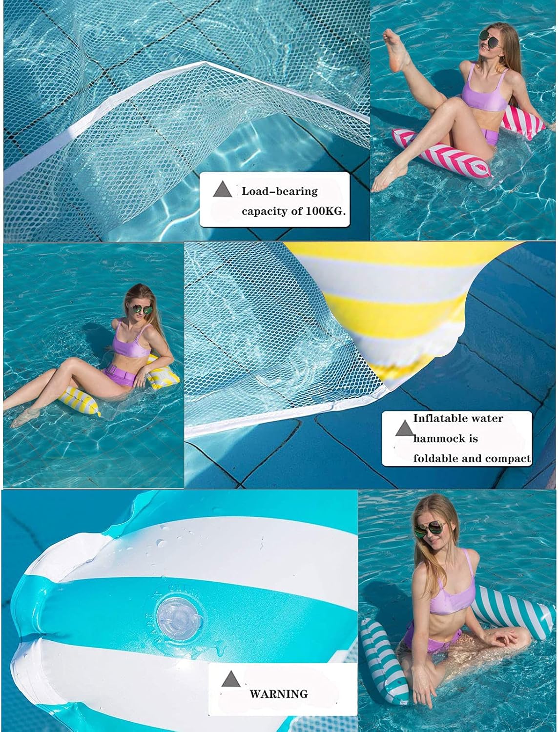 SUPER QUALITÀ: la nostra amaca ad acqua è realizzata in PVC resistente e non tossico e rete intrecciata di alta qualità. Può fornire molto supporto e molto conforto. La connessione è saldata senza soluzione di continuità. L'ottima tenuta all'aria ti consente anche di rimanere in acqua per un'intera giornata senza preoccuparti che il sacco gonfiabile possa perdere. Amaca gonfiabile multifunzionale 4 in 1: design 4 in 1, puoi trasformare l'amaca ad acqua in un'amaca, una sedia, un vagabondo o una sella sportiva. Puoi goderti il divertimento dei giochi acquatici in estate. Comfort e relax: il lettino galleggiante in piscina è ergonomico e ti dà una sensazione confortevole e rilassata. A differenza delle normali sdraio, potrete sdraiarvi o sedervi sull'acqua. Quando sei sdraiato sull'acqua puoi divertirti, prendere il sole e giocare! Facile da trasportare e riporre: a differenza delle normali amache ad acqua, puoi gonfiarle e sgonfiarle facilmente con una pompa ad aria. Quando non ne hai bisogno, può essere piegato molto piccolo, puoi portarlo con te quando viaggi. Il regalo estivo perfetto: perfetto per feste in piscina e divertimento in spiaggia. Il miglior regalo di compleanno, regalo estivo. In caso di ulteriori problemi, non esitare a contattarci e il nostro amichevole team di assistenza clienti è qui per aiutarti.