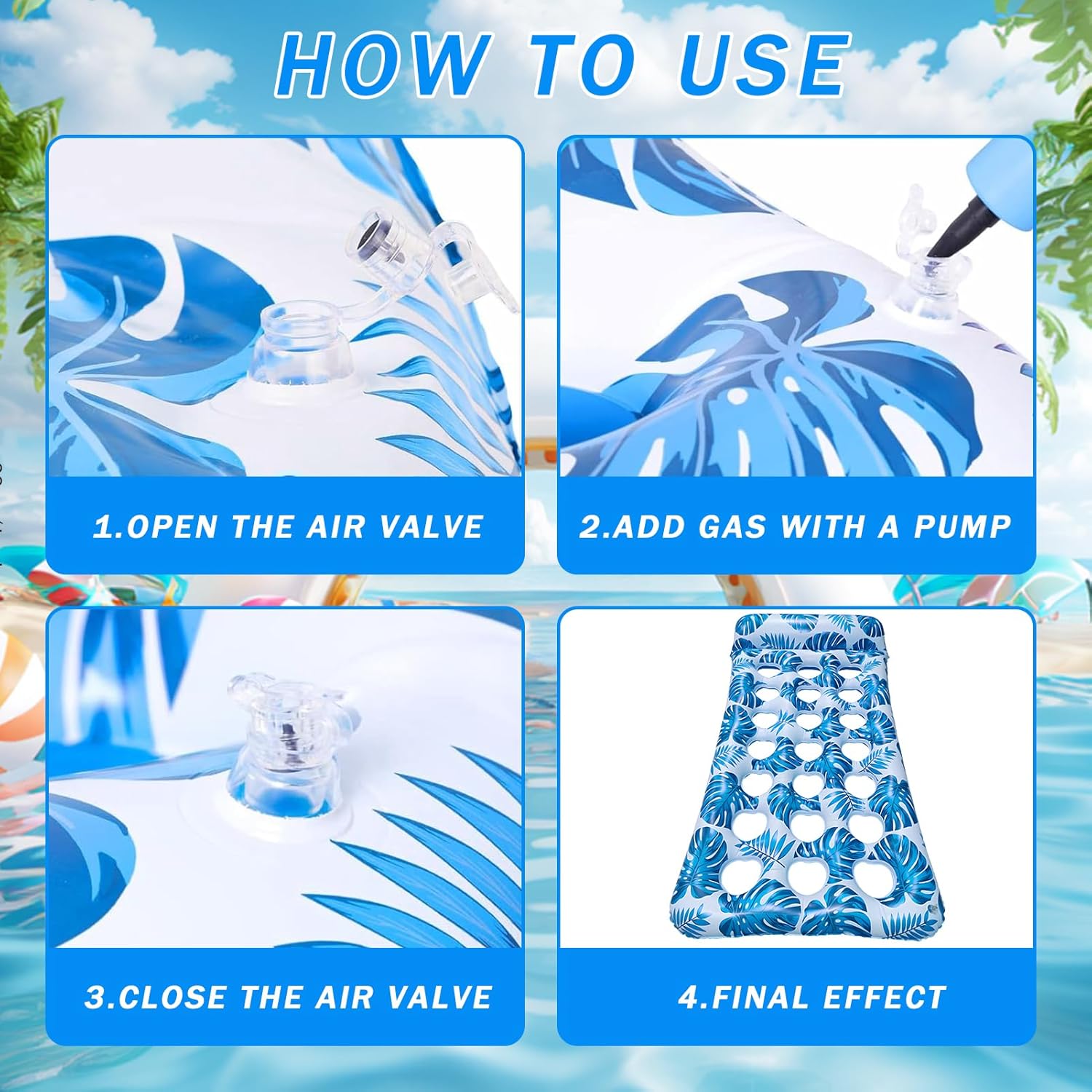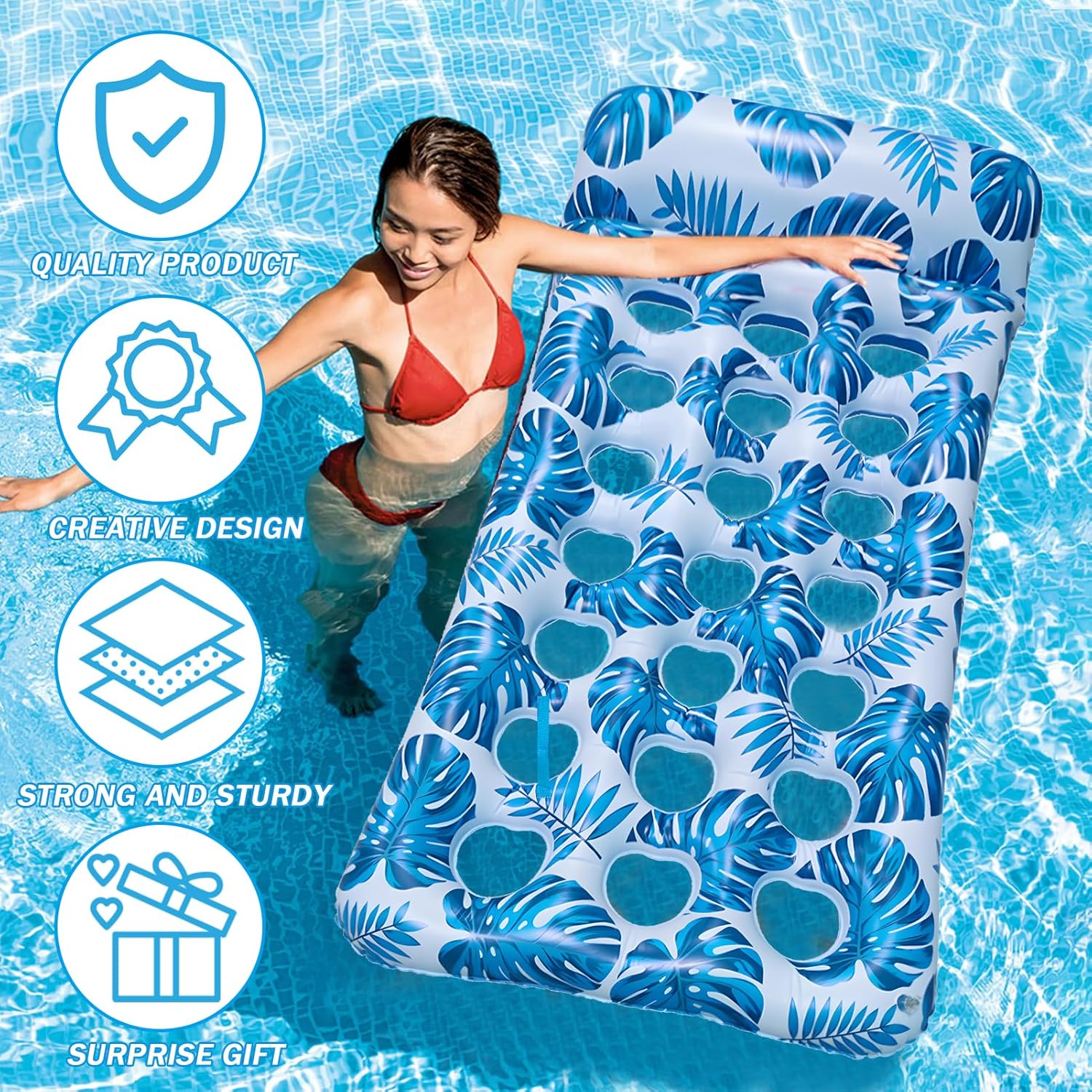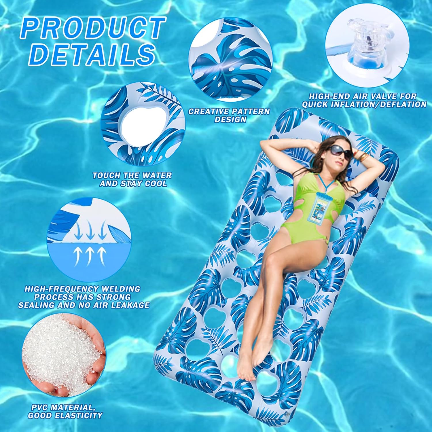 Divertenti galleggianti per piscina: il design ergonomico di questo galleggiante gonfiabile per piscina offre molto supporto, i fori di raffreddamento ti aiutano a rimanere fresco quando entri in stretto contatto con l'acqua, ideale per l'uso in piscina. 【Materiale robusto】 La zattera per piscina con cuscini è realizzata in materiale PVC ecologico e durevole, morbido e confortevole, può essere utilizzato ripetutamente, con buona resistenza alla pressione, resistenza all'usura, durevole e resistente alle temperature estive. 【Portatile e leggero】 Il nostro materasso galleggiante per piscina è leggero e può essere compresso e piegato, quindi puoi portarlo con te quando viaggi, con una capacità di carico fino a 300 libbre, ideale per gli adulti. 【Design confortevole】 La zattera per letto galleggiante ad aria porosa ha un comodo poggiatesta ergonomico, come un letto normale, anche se non è adatto per nuotare, puoi giocare con giochi acquatici. 【La migliore scelta estiva】 Il letto galleggiante gonfiabile è perfetto per la piscina, la spiaggia, il lago, la deriva, le vacanze e i colori vivaci sono più facili da riconoscere per i bambini, il miglior regalo di compleanno e regalo estivo.