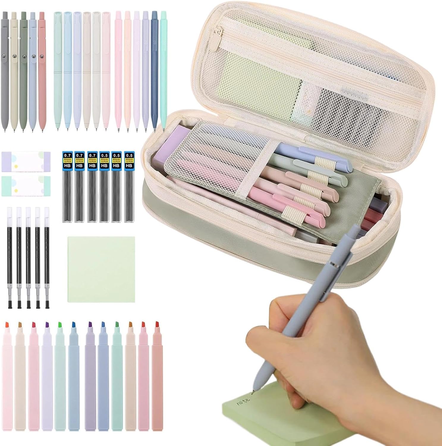 Soluzione archiviazione efficiente: Questo portapenne completo incorpora un design di archiviazione a strati e scomparti con tasche in rete per mantenere ordinato lo spazio di studio, offrendo ampio spazio per cancelleria e che migliorano la concentrazione in classe o negli uffici domestici durante lo svolgimento efficiente e attività Durata prolungata degli strumenti: Progettata per un utilizzo intensivo, include opzioni ricaricabili come mine per matite e refill per penne a , migliorando la longevità del prodotto e supportando esperienze di scrittura e disegno senza interruzioni a scuola. Chiarezza Potenziata: I materiali scolastici aesthetic garantiscono prestazioni di scrittura fluide grazie alla tecnologia 'inchiostro gel anti sbavature, creando appunti leggibili per compiti o brainstorming con la vivacità aggiuntiva di penne colorate ed evidenziatori Scelta motivazionale regalo: Questo astuccio estetico fonde estetica accattivante e funzionalità pratica, funzionando come set regalo per il ritorno a scuola che motiva gli studenti con look rinfrescante e soluzioni di organizzazione per la cancelleria in modo ordinato e ispiratore Flusso di Lavoro Ottimizzato: Il set di materiale scolastico estetico da 44 pezzi unisce strumenti di scrittura, marcatura e organizzazione appunti per garantire efficienza e accesso immediato, offrendo un kit studio pratico e stilistico ideale per organizzare note ed eccellere nell'apprendimento