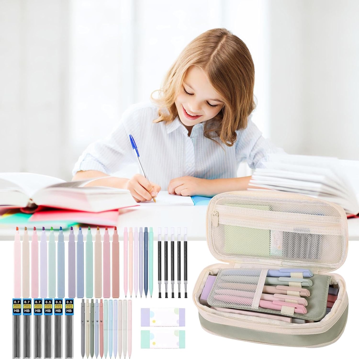 Organizzazione scrivania ottimizzata: Progettato con layout di archiviazione a livelli e scomparti con tasche in rete, questo portapenne completo garantisce il mantenimento di spazio di studio ordinato ospitando vari oggetti, creando una soluzione integrata che supporta la produttività durante esami o progetti creativi Strumenti di scrittura ricaricabili: Grazie ai componenti ricaricabili come mine per matite e refill per penne a , School Stuff for Girls garantisce una lunga durata, ideale per le attività in classe e i compiti senza interruzioni o costi aggiuntivi. Chiarezza Potenziata: I materiali scolastici aesthetic garantiscono prestazioni di scrittura fluide grazie alla tecnologia 'inchiostro gel anti sbavature, creando appunti leggibili per compiti o brainstorming con la vivacità aggiuntiva di penne colorate ed evidenziatori Regalo per studenti: L'astuccio estetico funge da set regalo per il ritorno a scuola, con design colorati che ispirano motivazione accademica, offrendo una selezione di cancelleria pratica per studenti che necessitano incoraggiamento durante il percorso di apprendimento con stile e funzionalità Soluzione Multifunzionale: Combinazione di strumenti essenziali per scrivere, evidenziare e organizzare appunti in un set cancelleria estetico da 44 pezzi, che crea un kit studio completo per migliorare la produttività quotidiana degli studenti con accesso immediato a tutti gli strumenti necessari
