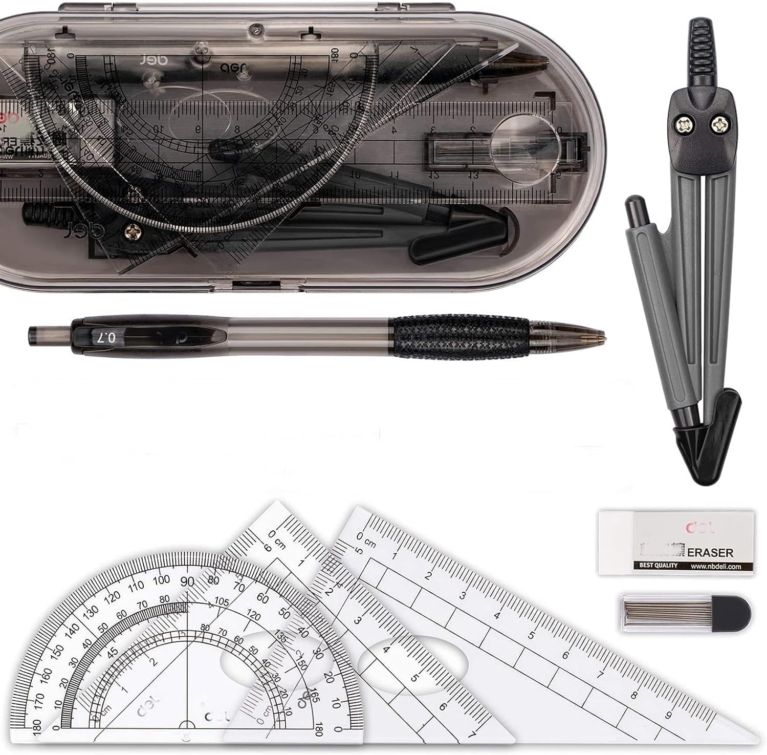 Il compasso matematico è facile da impugnare, con controllo superiore e facile da cambiare il raggio del cerchio e si blocca sempre in posizione per ottenere i cerchi desiderati. Kit di strumenti per il disegno della geometria per studenti di diversi ordini di scuola. Contenuto dell'imballaggio (8 pezzi in totale): 1 * Scatola infrangibile 、1 * Bussola grafica 、2 * Righelli triangolari 、1 * Righello dritto 、1 * Goniometro 、1 * Matita meccanica 、1 * Ricariche per matite 、1 * Gomma. Materiale: plastica, dimensione della cassa: 6,9 x 3 x 1,1 pollici (17,5 x 7,5 x 2,8 cm). La testa del compasso dal design ergonomico è comoda da tenere.
