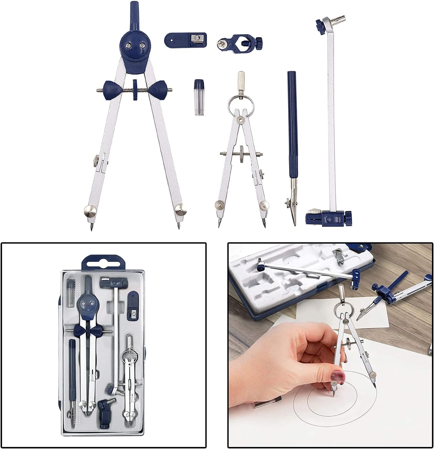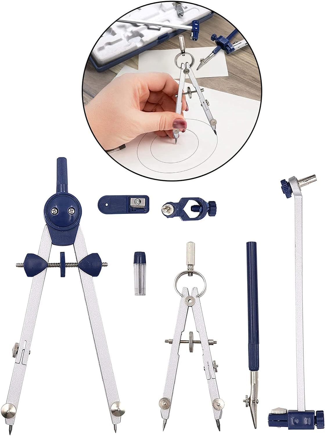 Il compasso matematico è facile da impugnare, con controllo superiore e facile da cambiare il raggio del cerchio e si blocca sempre in posizione per ottenere i cerchi desiderati. Compass Math Set, è una bussola in metallo. dotato di una rotella di regolazione e di una trave di estensione con meccanismo di bloccaggio automatico, che consente di impostare e mantenere con precisione la dimensione del cerchio desiderata. Con adattatore universale e asta di prolunga. Per matematica, geometria, arte, disegno e disegno. Ruotando la parte centrale della vite per regolare il compasso di apertura e chiusura. Puoi impostare con precisione la dimensione del cerchio che ti serve e tenerlo. La trave di estensione per disegnare cerchi di grandi dimensioni, ottima per chi ha bisogno di cerchi grandi. Include anche una piccola penna che può essere utilizzata nel manico o separatamente. La testa del compasso dal design ergonomico è comoda da tenere.