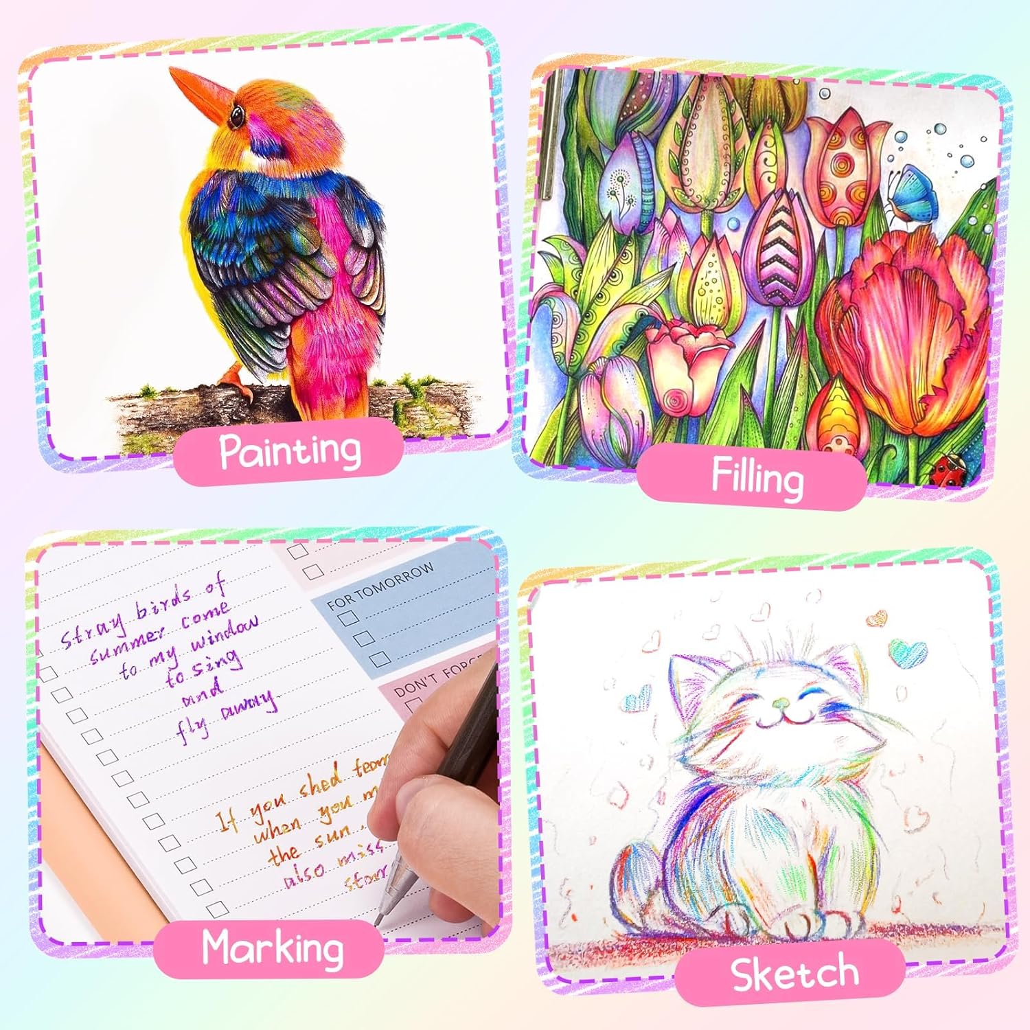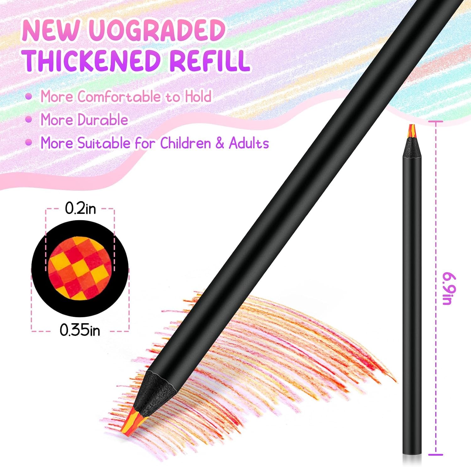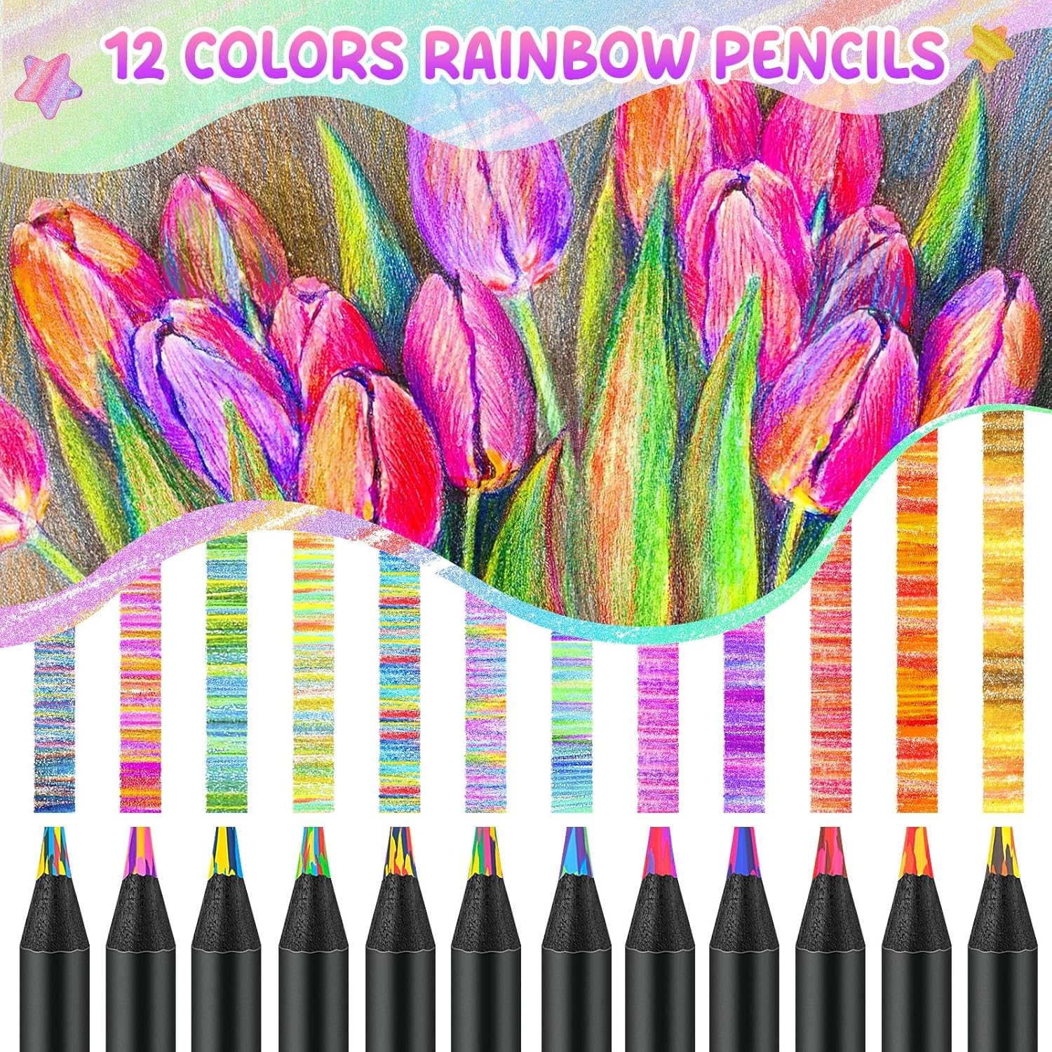 [Regalo creativo per bambini e adulti] Questo set di matite arcobaleno con 12 combinazioni di colori uniche è ideale come regalo per la scuola, il compleanno, il Natale o il compleanno dei bambini. [Effetto colore magico] Ogni nucleo della penna combina diversi colori: con una sola penna puoi creare una varietà di transizioni di colore e sfumature emozionanti durante il disegno. [Extra spesso e durevole] I nuclei colorati spessi 0,5 cm e il robusto manico in legno nero garantiscono stabilità, comfort e una lunga durata - ideale per le mani dei bambini piccoli. [Multiuso] Perfetto per libri da colorare, schizzi, progetti fai-da-te, artigianato e disegno creativo - per casa, scuola o lezioni d'arte. [Sicuro e pronto all'uso] Pre-affilato e pronto all'uso. Il materiale resistente è liscio, privo di schegge e adatto ai bambini.