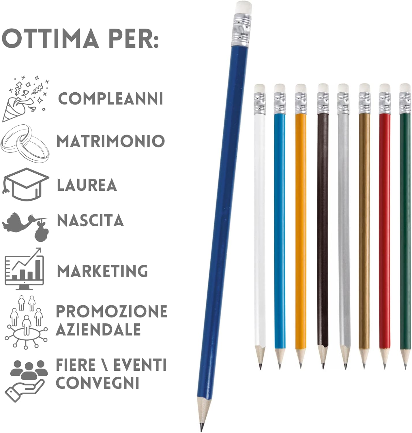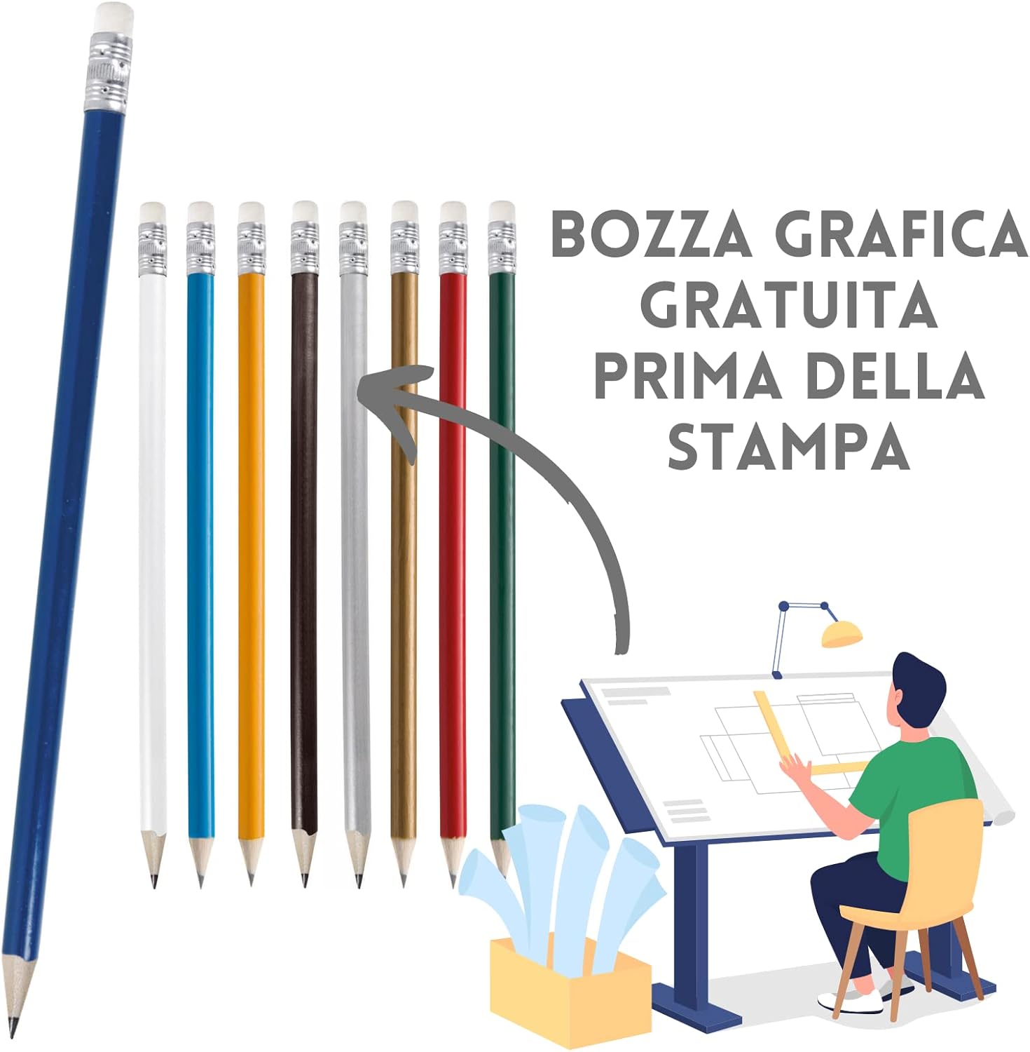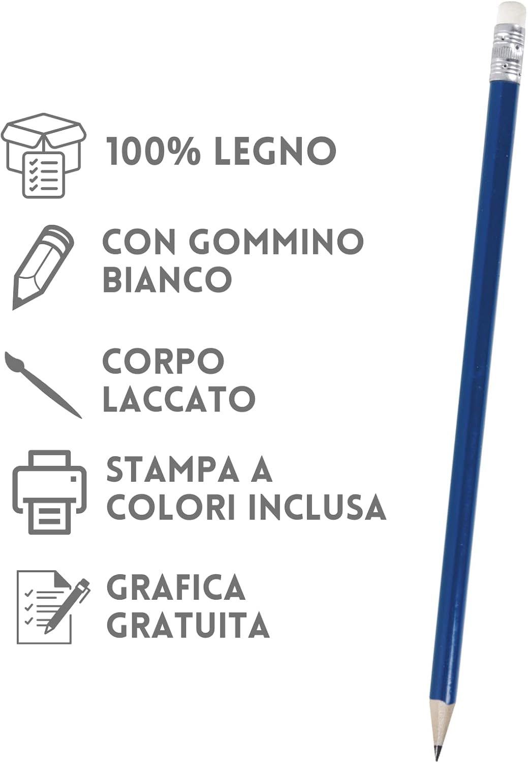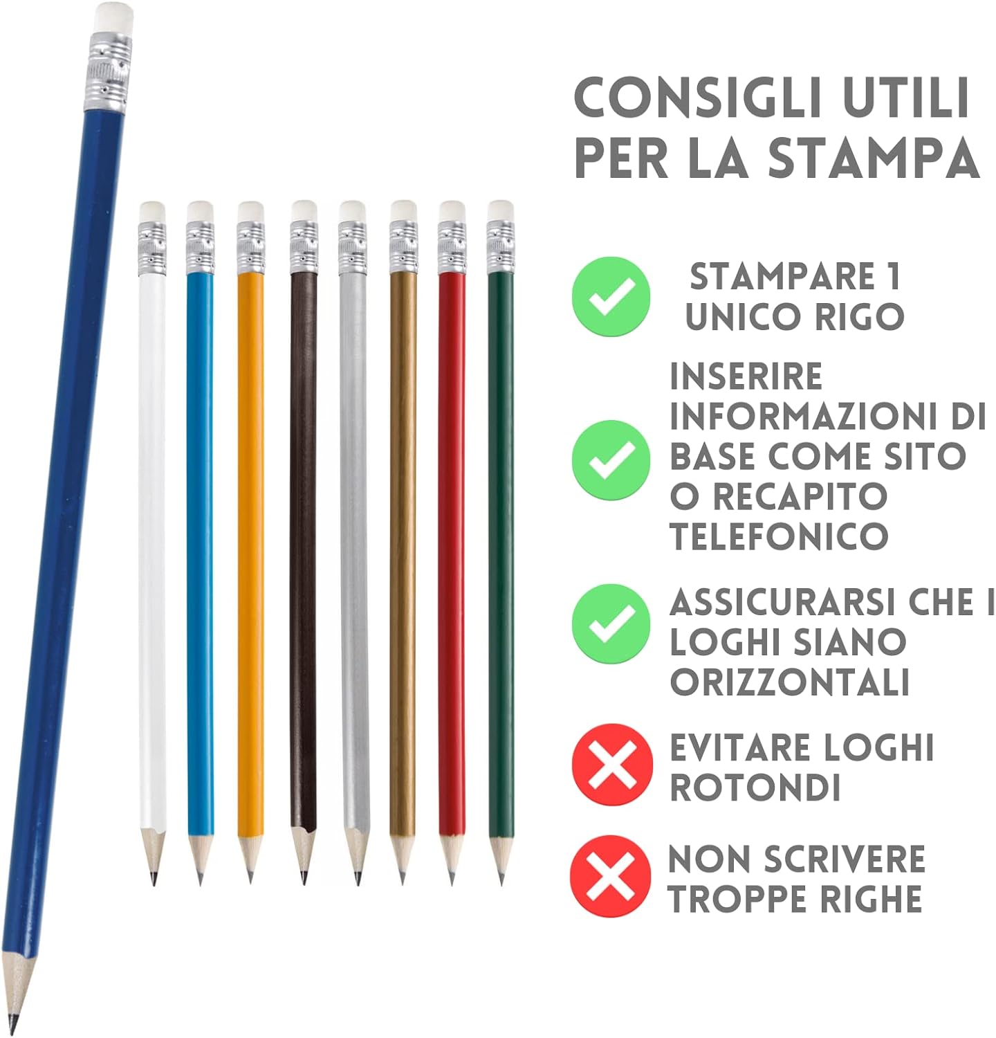 [ GADGET PERSONALIZZATO ] le matite personalizzate sono un ottimo ed economico gadget personalizzato per ogni occasione! [ PER EVENTI ] ottime come gadget ricordo per i tuoi eventi più importanti [ COMPLEANNI E RICORRENZE ] ideale per compleanni, ricorrenze e matrimoni [ PROMUOVI IL TUO BRAND] lLa matita personalizzata è anche un gadget promozionale molto economico per promuovere la tua azienda ed il tuo brand [ IL PRODOTTO ] matite il legno con gommino e personalizzazione inclusa a colori, per personalizzare clicca su "personalizza ora" alla tua destra [ ACQUISTA ORA, SIAMO AL TUO FIANCO ] siamo sempre a disposizione per consigliarti, aiutarti e rispondere a tutte le tue domande con la formula soddisfatti o rimborsati!