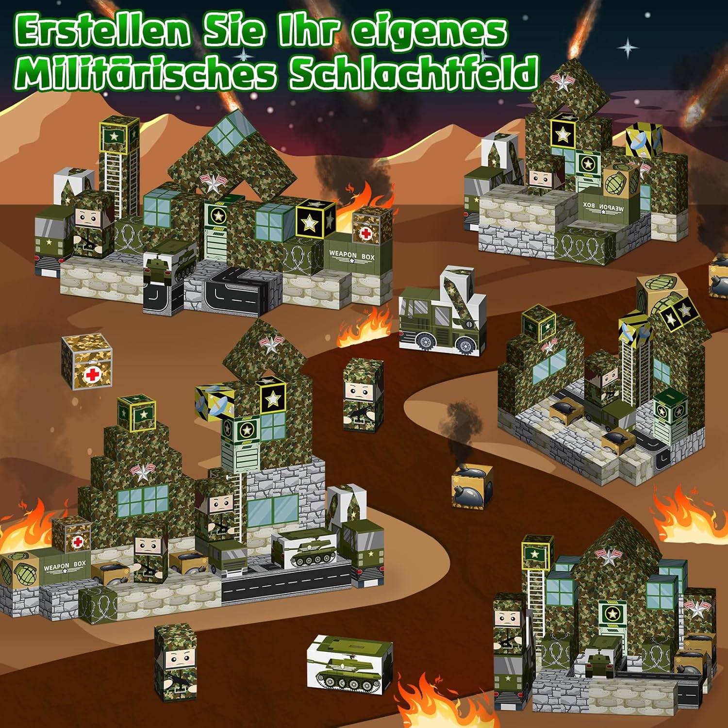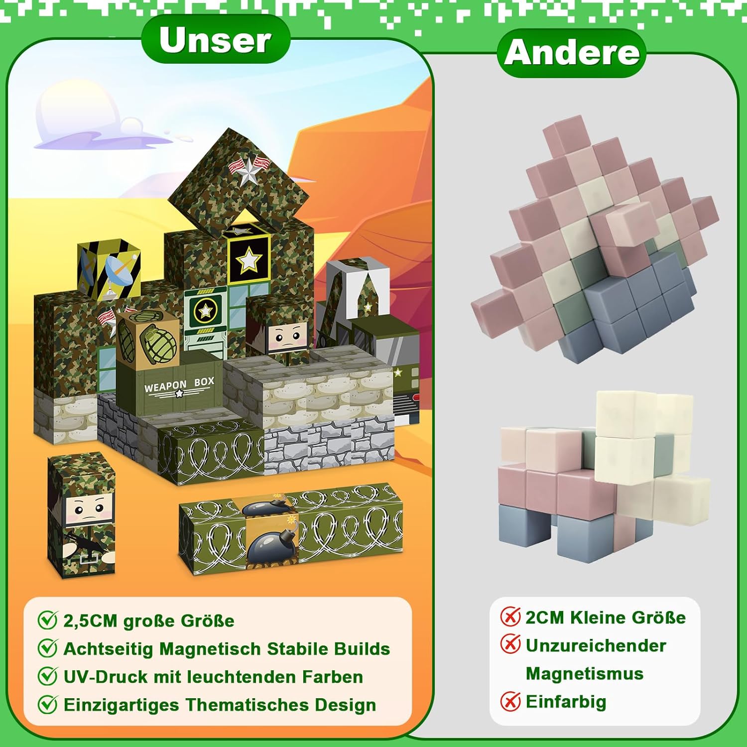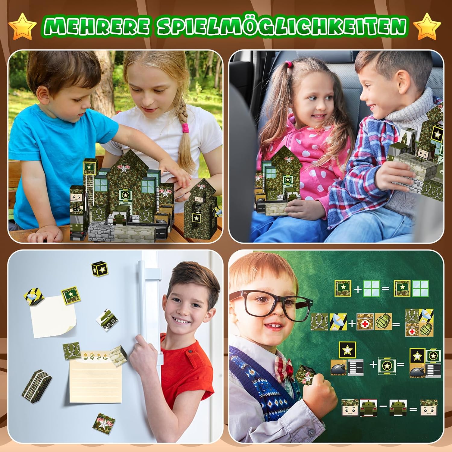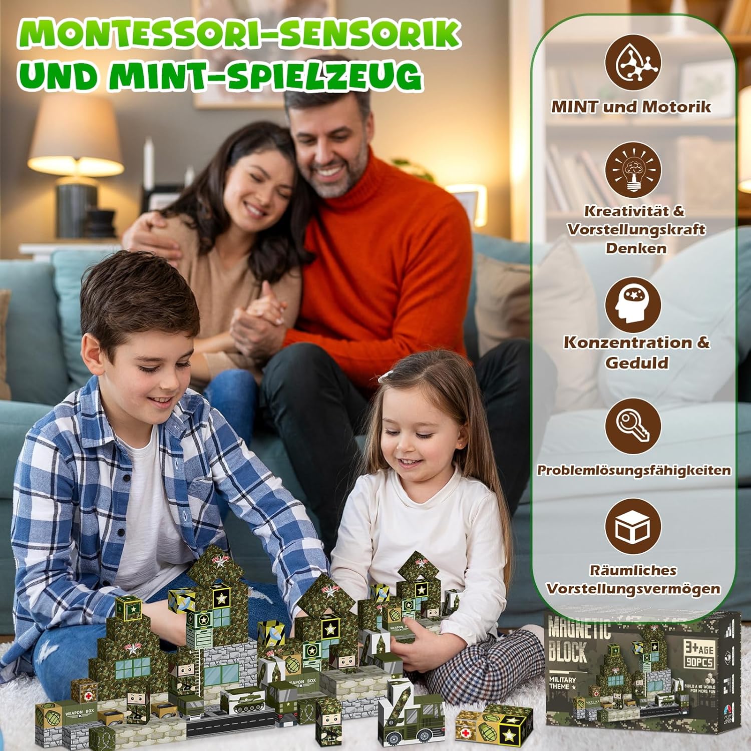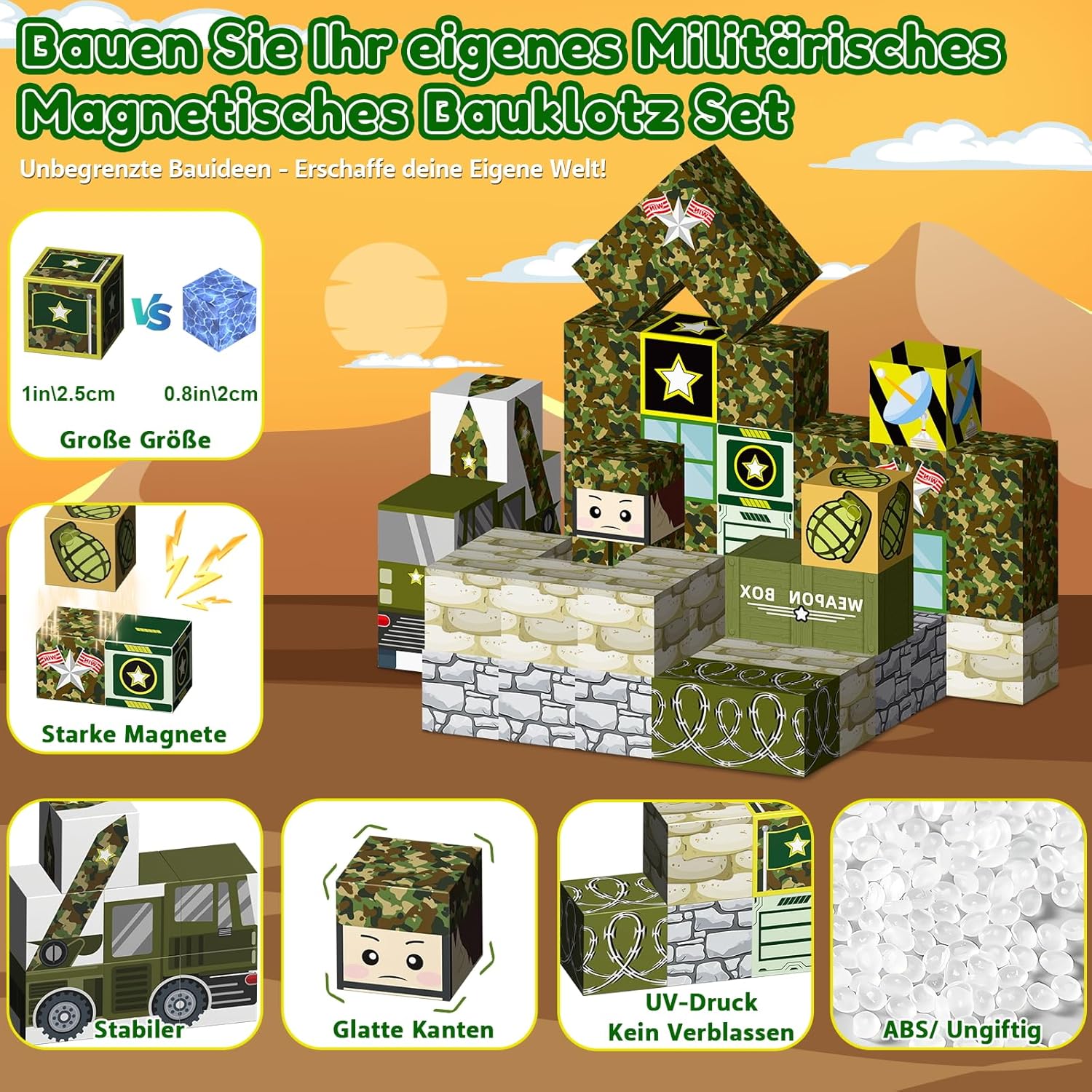 Kit di costruzione magnetica a tema militare: set di 90 blocchi magnetici, ciascuno con lato di 1 pollice di lunghezza, 8 blocchi magnetici, compatibili con blocchi magnetici standard da 1 pollice, offrono a tuo figlio una moltitudine di possibilità creative. Fai da te: le possibilità di costruzione e progettazione con i blocchi magnetici sono infinite e rendono ogni momento di gioco una nuova esperienza. I blocchi magnetici sono realizzati con materiali sicuri: il motivo superficiale dei blocchi magnetici è stampato con stampa UV avanzata, il motivo può essere impermeabile, il che può impedire che il motivo sbiadisca, i bordi e gli angoli sono lisci, non graffiano le mani e garantiscono sicurezza, a differenza di altri blocchi, i nostri blocchi magnetici sono realizzati in plastica ABS ecologica di alta qualità, i blocchi magnetici sono resistenti alla caduta e possono essere riutilizzati. I blocchi magnetici migliorano le capacità di pensiero: i blocchi magnetici STEM insegnano a ispirare il tuo bambino con le meraviglie del magnetismo, della struttura e della creatività. I ricchi disegni e figure attirano l'attenzione dei bambini, che possono costruire e trasformare il loro mondo per ore. I bambini sono incoraggiati a esplorare abilità come la formazione strutturale, il pensiero e la risoluzione dei problemi, il pensiero spaziale e le capacità motorie. Regali magnetici creativi per bambini: mattoncini magnetici per diverse fasce d'età, mattoncini magnetici sono versatili e offrono intrattenimento infinito per neonati e bambini dai 3 ai 10 anni alla ricerca di nuove sfide. Adatto come regalo di compleanno, regalo di festa, regalo di Pasqua e regalo di Natale per bambini. Piacevole esperienza di acquisto - Servizio di risposta 24 ore su 24: il kit di blocchi magnetici viene fornito con una borsa per il trasporto all'aperto e per lo stoccaggio a casa. Ci prendiamo cura di tutte le domande sulla qualità del prodotto e sul servizio per offrire ai nostri clienti un'esperienza di acquisto ottimale. Servizio di risposta 24 ore su 24, puoi acquistare con fiducia.