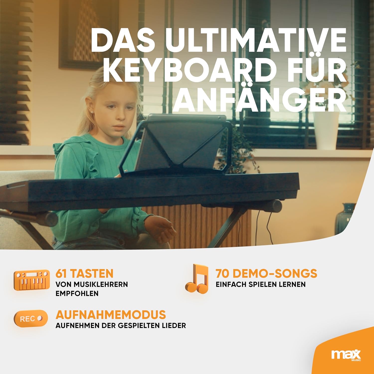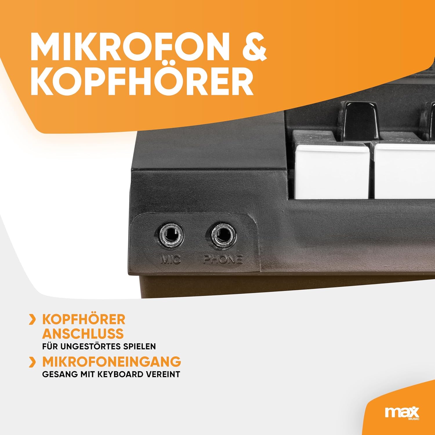 Tastiera a 61 tasti per bambini dai 6 anni in su: il MAX KB15 è un pianoforte elettrico versatile: tastiera per bambini ideale per principianti ed esperti. Flessibilità di un moderno pianoforte elettrico con connessione USB-C. Lunga durata di riproduzione e funzione di registrazione: con una potente batteria, la tastiera per bambini offre fino a 8 ore di riproduzione. La funzione di registrazione ti consente di catturare le tue creazioni e riprodurle in qualsiasi momento. Ampia selezione di suoni e ritmi: il set di tastiere dispone di 16 suoni e 10 ritmi, dai toni classici ai ritmi moderni. Con il microfono incluso non solo puoi suonare ma anche cantare. Perfetto per karaoke o spettacoli di canto per accompagnare la tua musica con la voce. Altoparlanti Duo per un suono chiaro e jack per cuffie per esercitarsi in silenzio, ideali per principianti e musicisti esperti di EPiano.