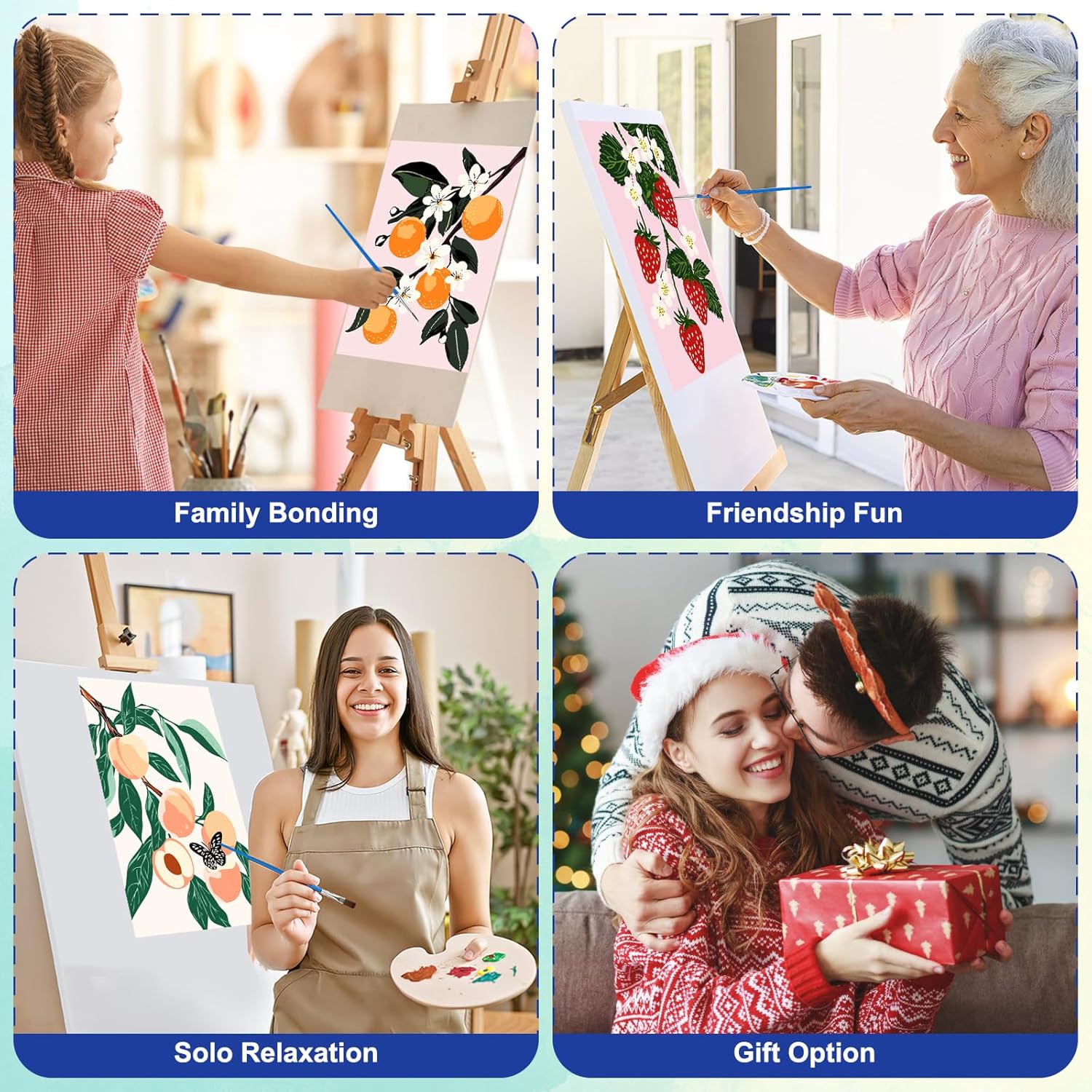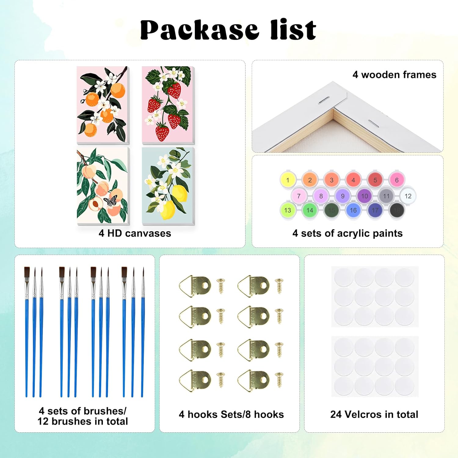Goditi ore di divertimento creativo: questo kit di pittura con i numeri per bambini fornisce istruzioni di pittura facili da seguire in sezioni numerate in modo intuitivo. Dipingere con i numeri può coltivare la pazienza e la percezione del colore dei bambini e promuovere l'esplorazione del colore e la creatività. Tela di alta qualità e codifica chiara: questo set di pittura a olio per bambini presenta una tela con resa cromatica ad alta definizione con numeri incisi al laser per una chiara visibilità. La tela resistente e di alta qualità assorbe la vernice acrilica in modo uniforme senza sbavature, garantendo un processo di verniciatura fluido. Divertente e facile da usare Dipingi con i numeri, non è necessario mescolare i colori. Ogni vernice acrilica è numerata e pronta all'uso. Ogni barattolo numerato corrisponde a un'area di tela corrispondente per dipingere in modo semplice e senza problemi Kit iniziale completo: il simpatico kit di pittura con i numeri per bambini include quattro tele prestampate con cornici, 12 pennelli, quattro set di colori acrilici abbinati, otto ganci e 24 paia di chiusure in velcro. Contiene tutto ciò di cui hai bisogno per creare, così puoi iniziare il tuo viaggio artistico fin da subito. Opere d'arte per ogni stanza e regalo perfetto: una volta completato il dipinto, può diventare una decorazione perfetta per uffici, soggiorni, camere da letto e sale da pranzo, aggiungendo personalità a qualsiasi stanza. I dipinti ad olio per bambini sono la scelta perfetta per attività familiari genitore-figlio, feste di compleanno, regali di Natale o altre festività