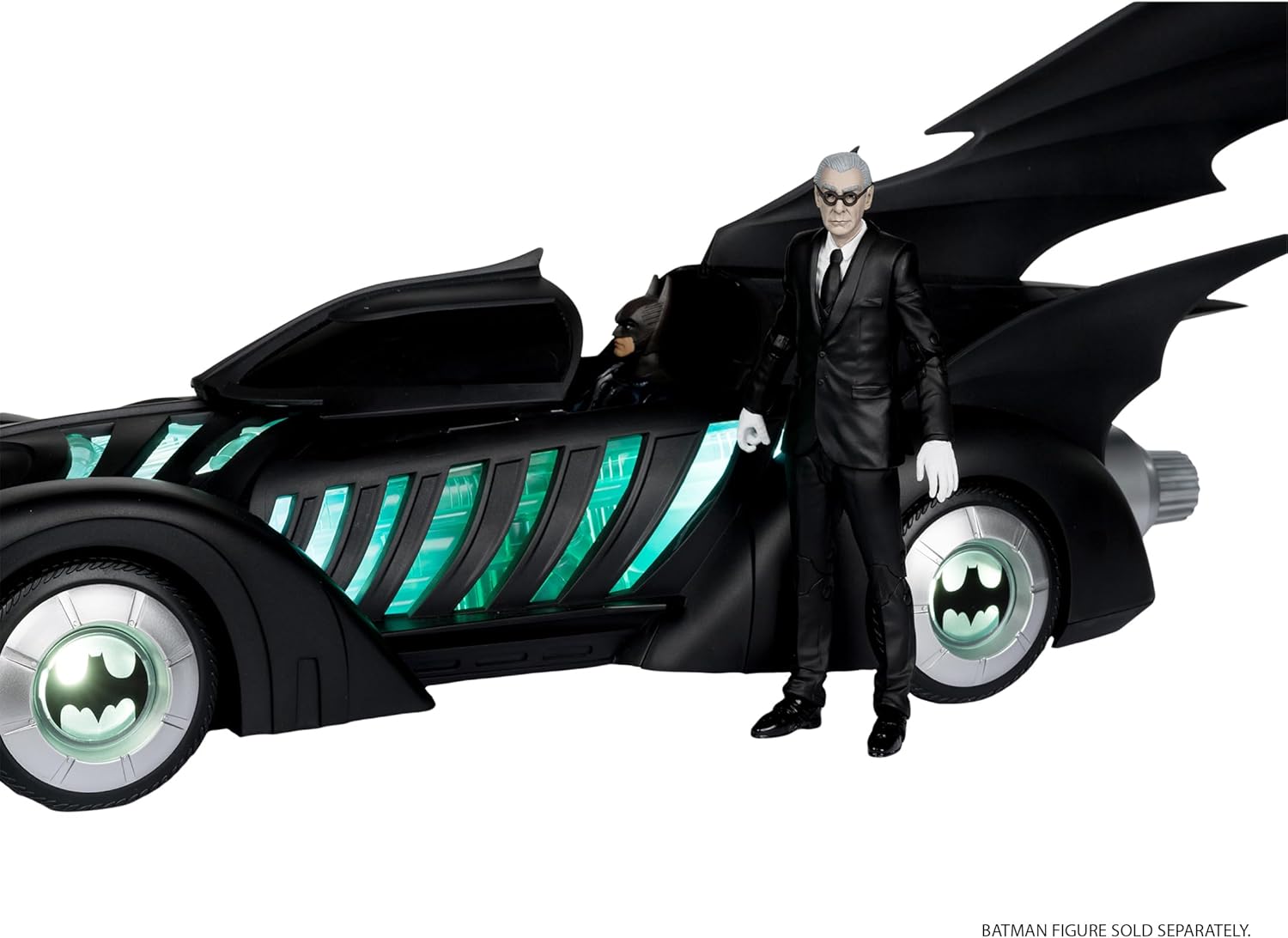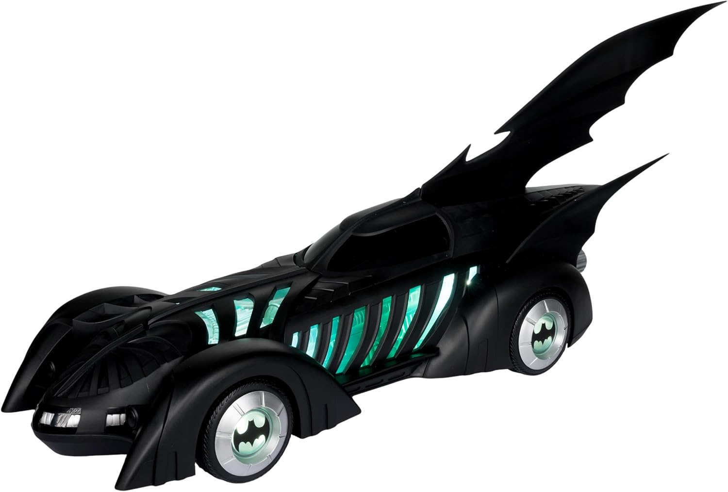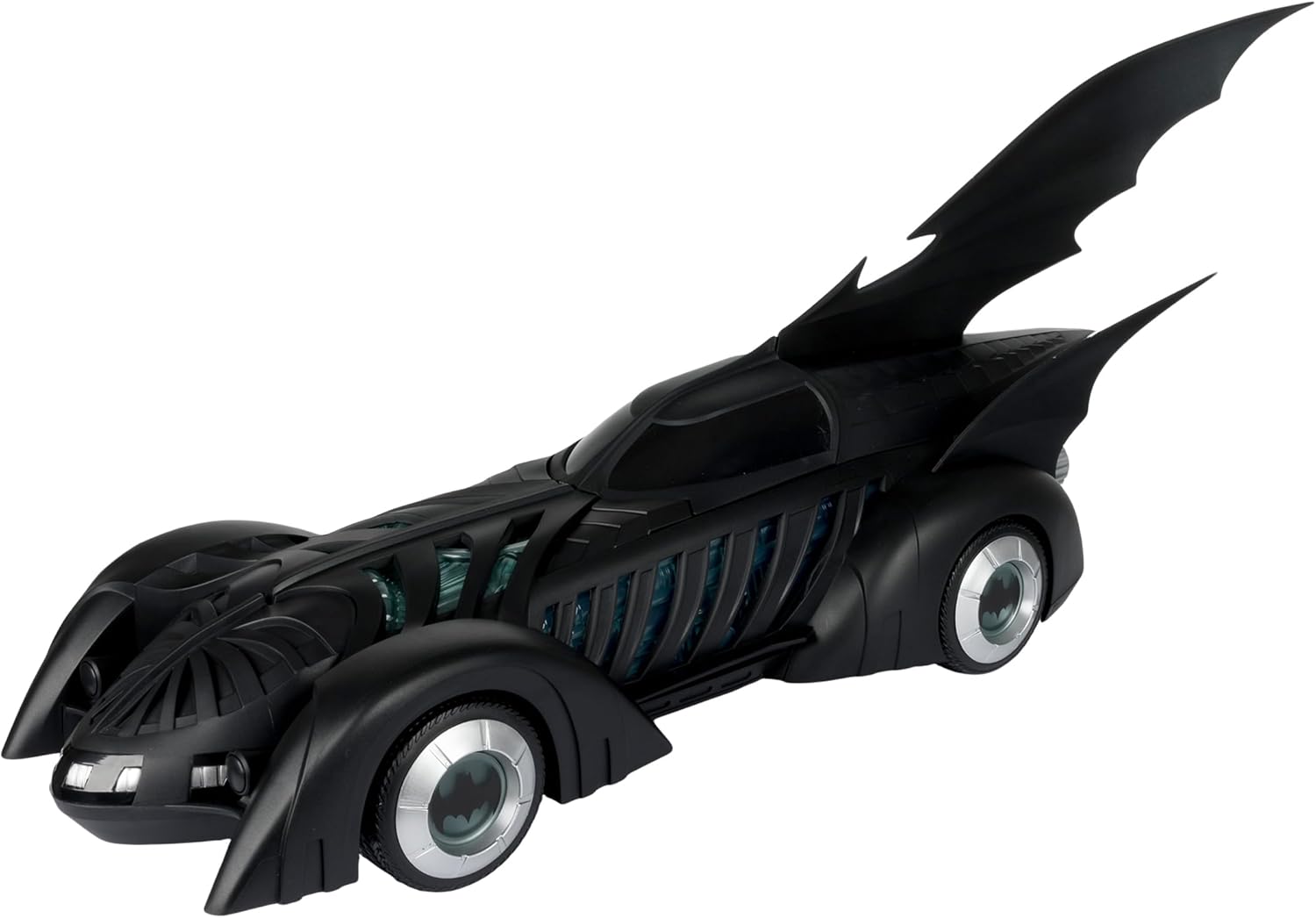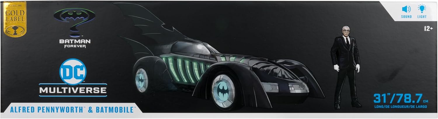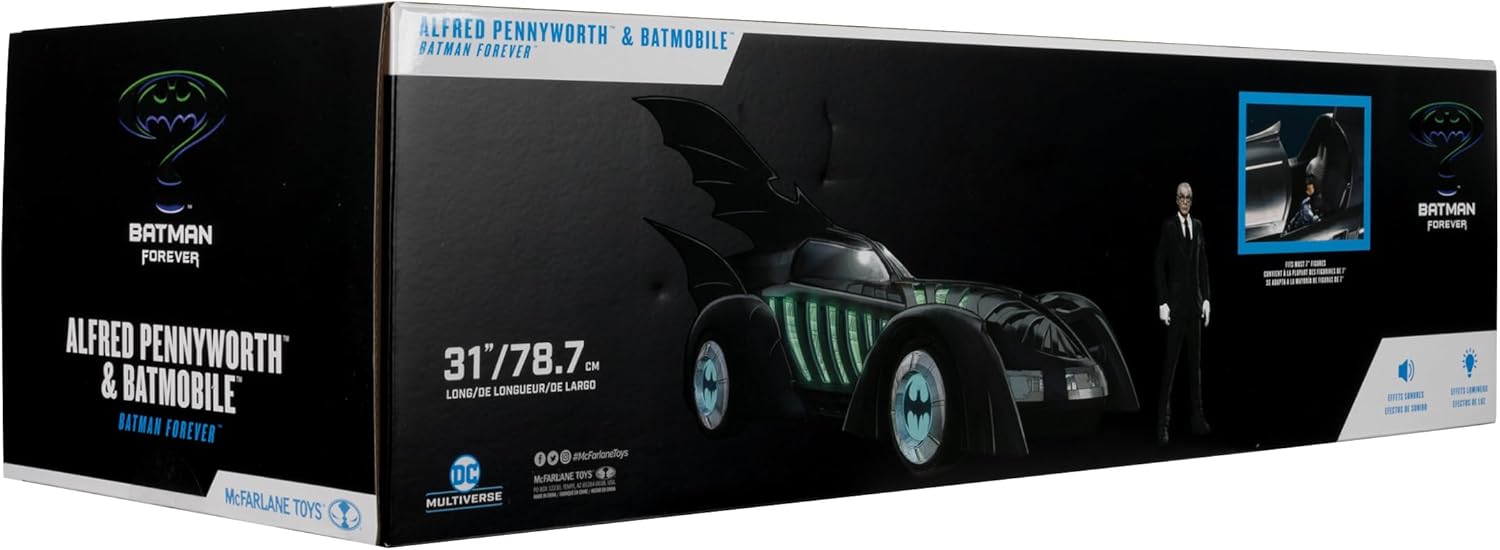 BATMOBILE e ALFRED PENNYWORTH nel film teatrale BATMAN FOREVER Include veicolo BATMOBILE e action figure ALFRED PENNYWORTH, base espositiva, carta d'arte da collezione Alfred progettato con Ultra Articulation con un massimo di 22 parti mobili per una gamma completa di posa e gioco Batmobile dispone di luci e suoni. Il veicolo richiede 3 batterie AAA non incluse. * Figura Batman venduta separatamente