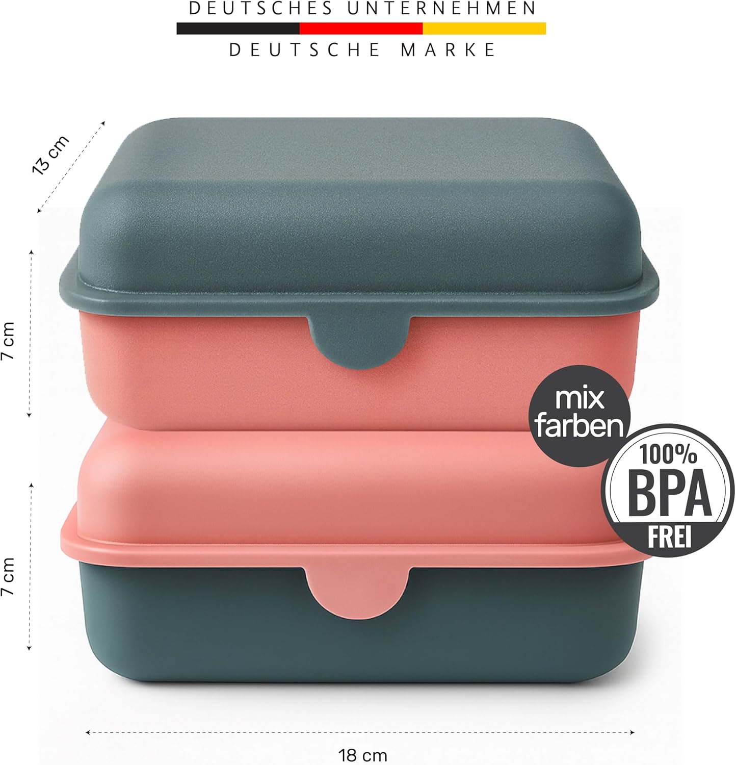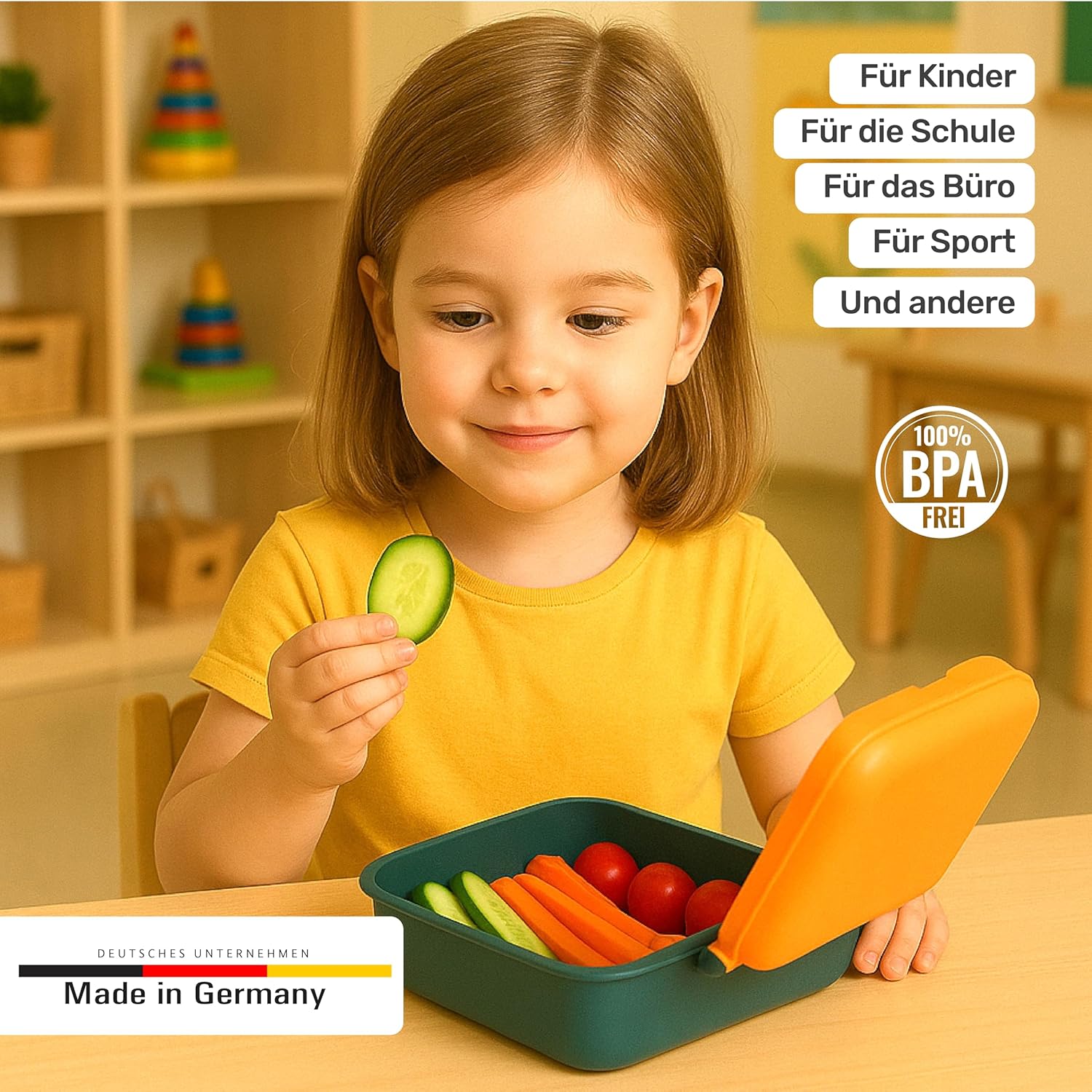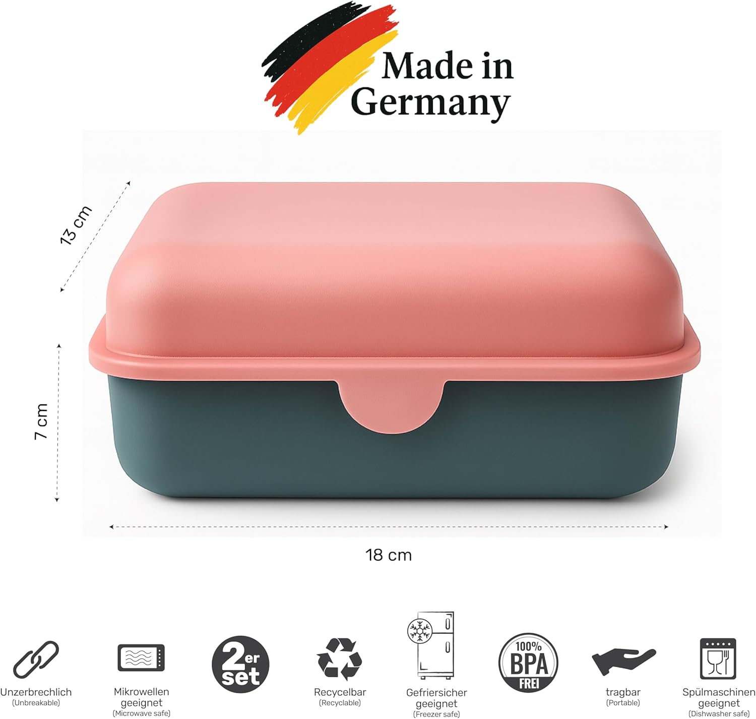 Versatile, robusto e durevole – Dimensioni compatte (13 x 18 x 7 cm) con capacità di 1200 ml – si adatta comodamente in qualsiasi borsa della scuola e offre spazio sufficiente per un pasto completo – ideale per bambini e adulti a scuola, asilo, ufficio, università, picnic o in viaggio. Lavabile in lavastoviglie e adatta al forno a microonde. Facile da pulire e adatto per riscaldare gli alimenti. Plastica premium e ingegneria tedesca: materiale durevole e senza BPA per la massima sicurezza e durata nell'uso quotidiano. Sicuro per il congelatore e adatto come contenitore – utilizzabile anche per conservare in freezer – ideale per pasti o avanzi preparati. Con coperchio intercambiabile – Coperchio flessibile combinabile – ideale per famiglie o per organizzare più contenitori per il pranzo. Made in Germany – Qualità di cui ci si fida – Progettato e realizzato in Germania con la massima cura, precisione e affidabilità.