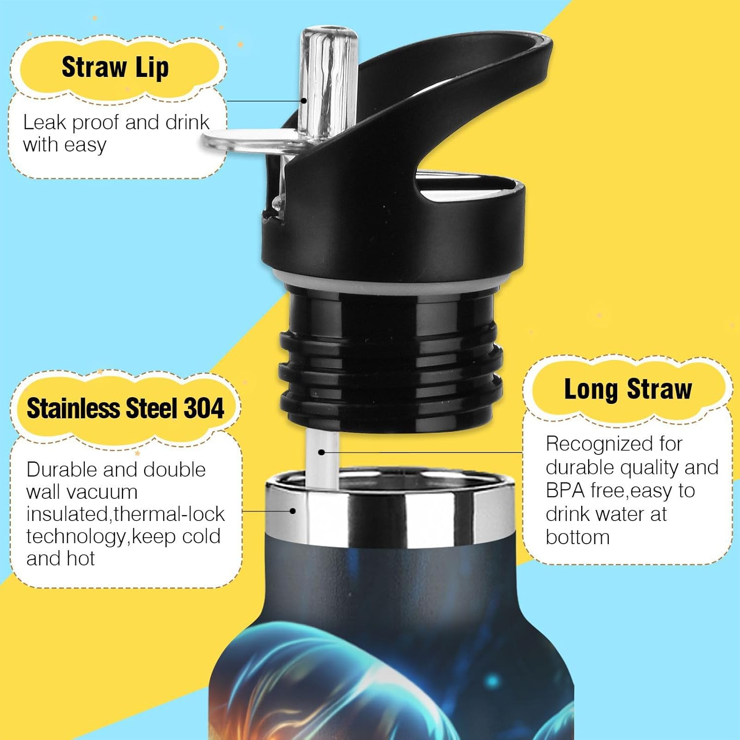 1. Materiali Di Alta Qualità e Utilizzo Sicuro: Realizzati in acciaio inossidabile 304 di alta qualità per uso alimentare, PP e silicone. Per garantire che le bevande del tuo bambino rimangano pure, sicure e prive di sostanze chimiche nocive. 2. Tecnologia Di Isolamento Avanzata: Presenta un isolamento sottovuoto a doppia parete con uno speciale strato termoisolante, che mantiene le bevande calde o fredde per lunghi periodi: fino a 10 ore per le bevande calde e 8 ore per quelle fredde. 3. Design Intuitivo: Include un'innovativa cannuccia pieghevole e una valvola di sfiato a prova di perdite, per garantire una bevanda fluida e senza fuoriuscite. Il design rimovibile consente una pulizia igienica completa. 4. Facile Da Trasportare: Dotato di un'impugnatura ergonomica allargata che può contenere comodamente due dita, consentendo ai bambini di trasportare facilmente e in sicurezza la propria bottiglia ovunque. 5. Ideale Per Tutte Le Stagioni e Attività: Progettato perfettamente per soddisfare le esigenze di idratazione dei bambini durante tutto l'anno, adatto per la scuola, lo sport, i picnic, le escursioni, i viaggi e l'uso quotidiano.