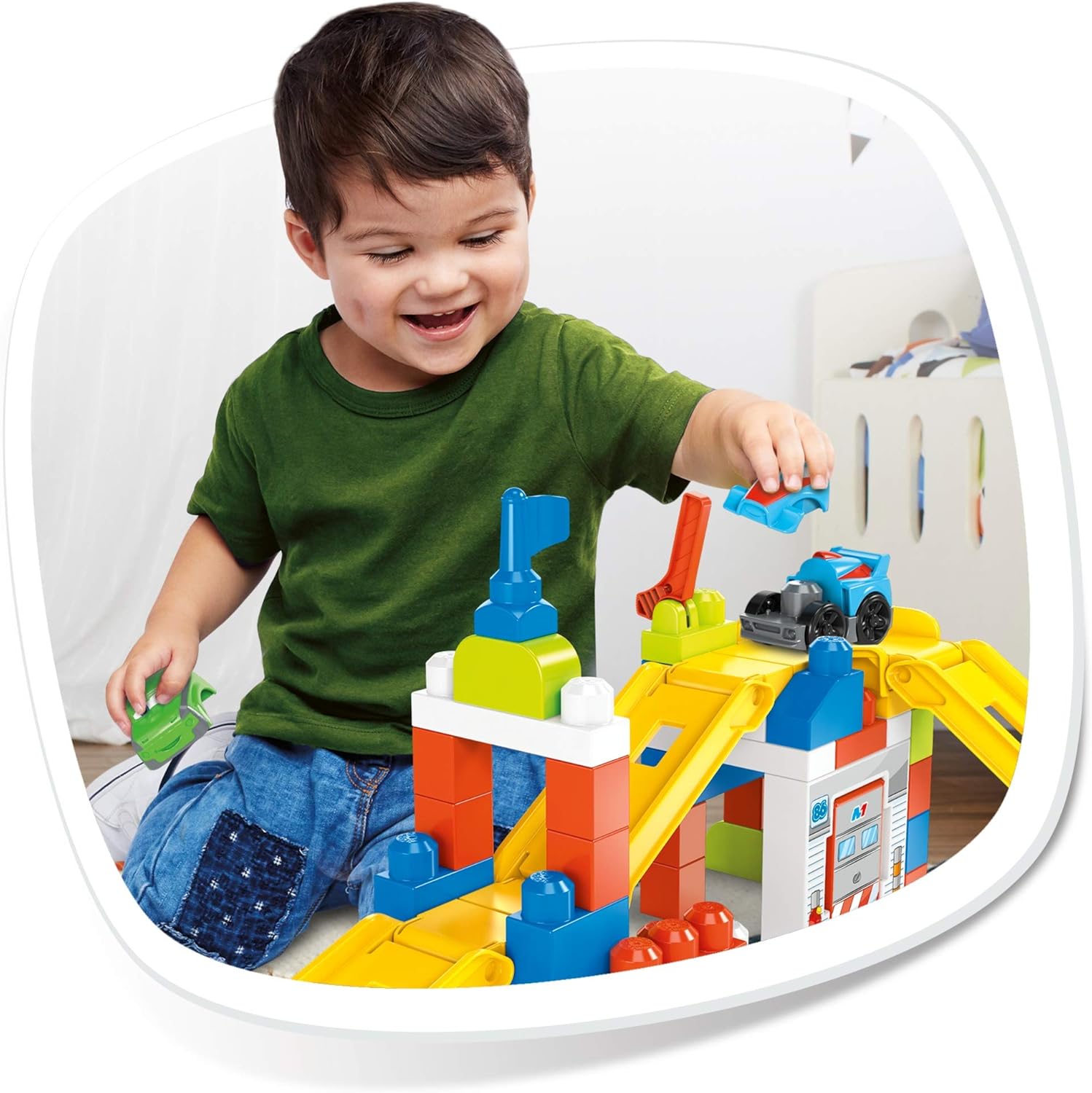 60 pezzi a tema di garage da corsa 2 pezzi di pista Porta del garage apribile e leva della linea di partenza Include 1 auto da corsa componibile con 3 pezzi e 2 pezzi extra per modificare il look dell'auto Pratico contenitore per riporre tutti i blocchi