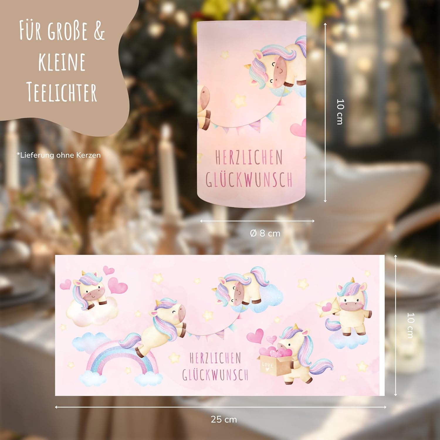 [Decorazione da tavolo per il compleanno dei bambini] I portacandele dal design elegante e amorevole sono perfetti come decorazione da tavolo per il compleanno dei bambini. Chi dà valore a una bella decorazione da tavolo per il primo compleanno dei bambini, amerà questo prodotto. [Perfetto per una festa con unicorni] Il portacandela può essere decorato con lumini o luci a LED e funge da decorazione da tavolo perfetta per il compleanno dei bambini [Istruzioni] Il portacandela si inserisce facilmente con due linguette (senza colla) e può essere utilizzato più volte. [Alta qualità premium] Le nostre fascette antivento prodotte in Germania sono realizzate in carta trasparente di alta qualità da 150 g/m2. Il motivo è stampato in modo nitido e dai colori intensi. Ogni stampa artistica è sottoposta ad un accurato controllo di qualità e viene spedita in confezione sicura. Dimensioni: aperto 25 cm x 10 cm, piegato: 10 cm di altezza, 8 cm di diametro. [Garanzia di soddisfazione al 100%] Siamo felici se lo sei. Se qualcosa non va bene, troveremo una soluzione insieme. La vostra soddisfazione è il nostro obiettivo principale.
