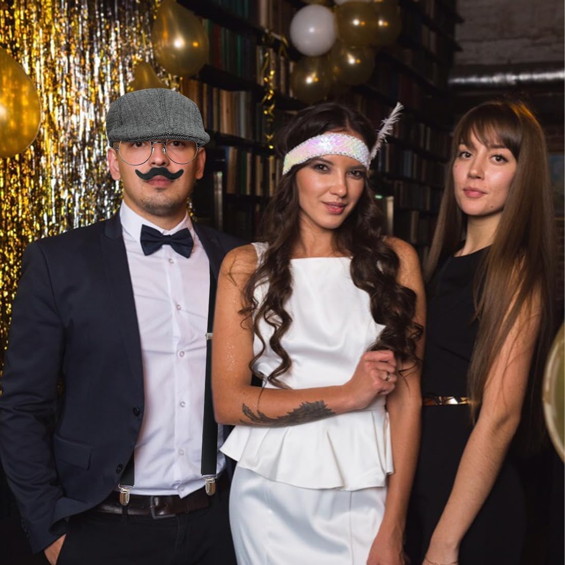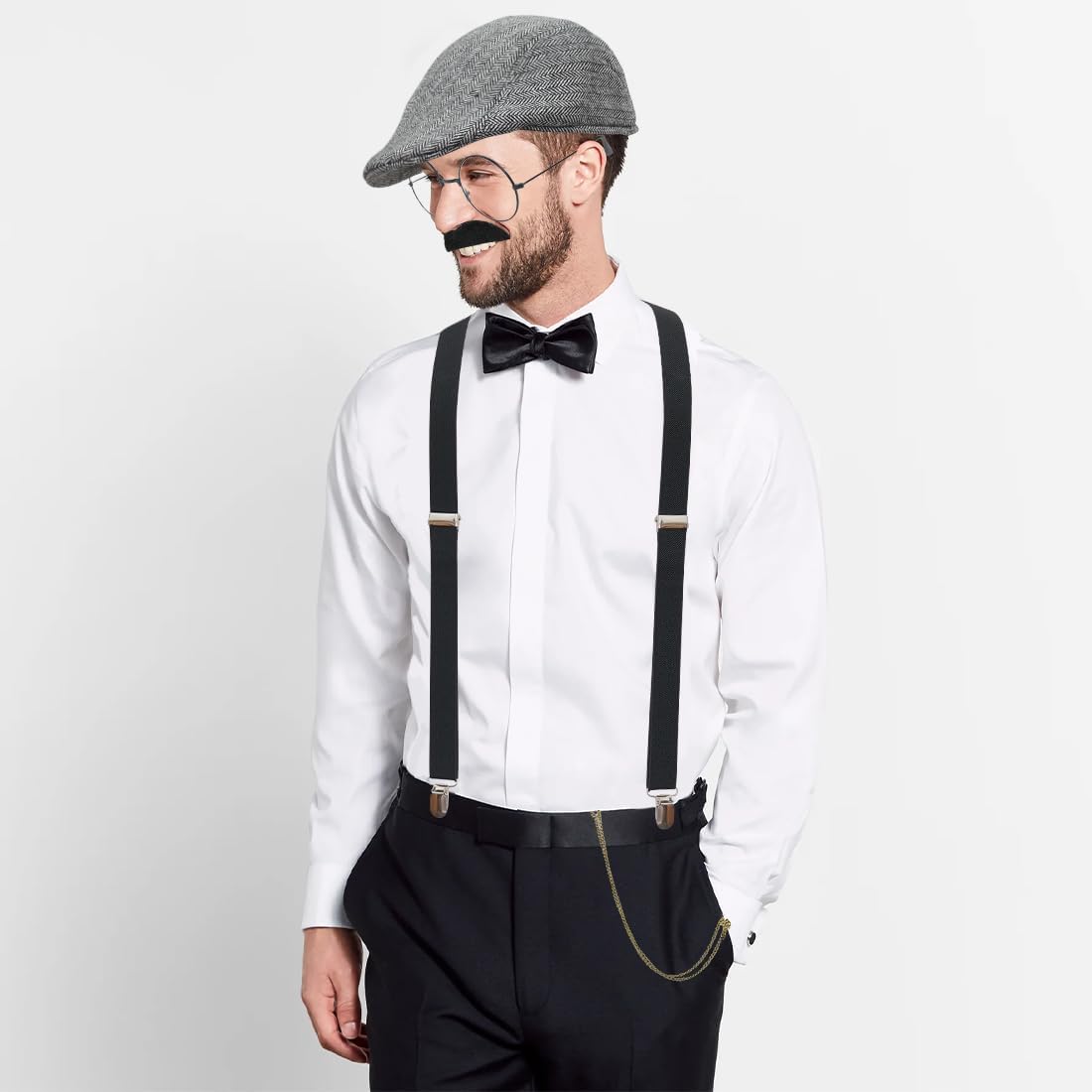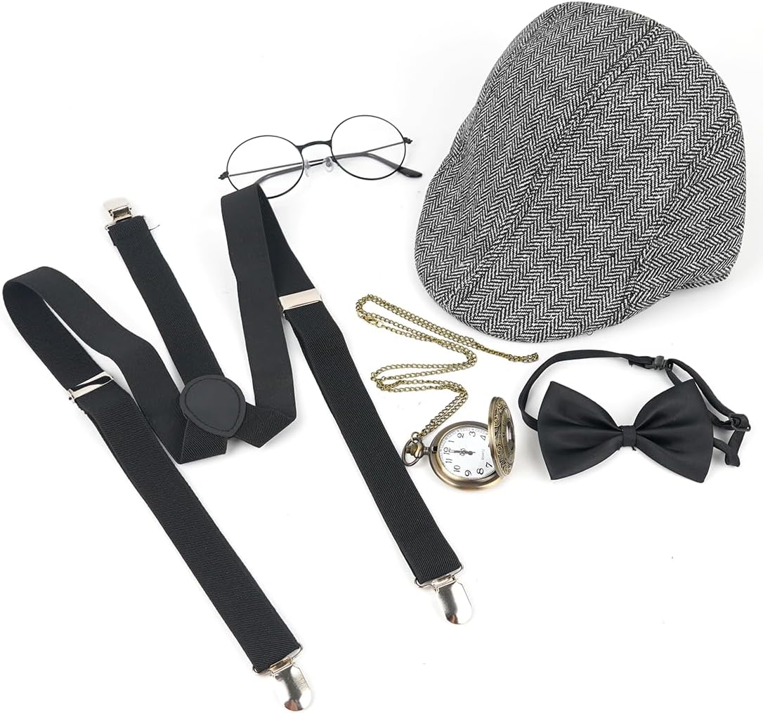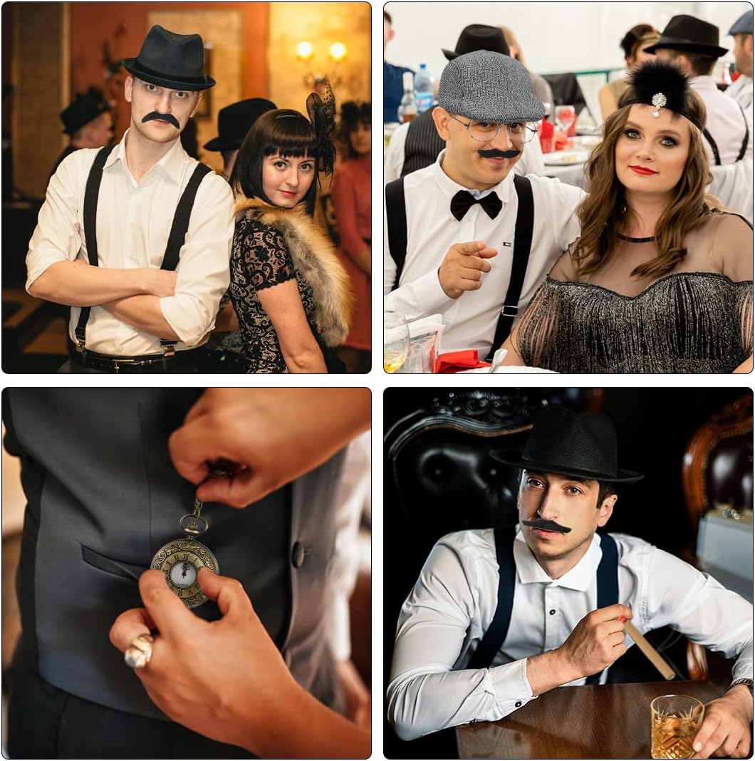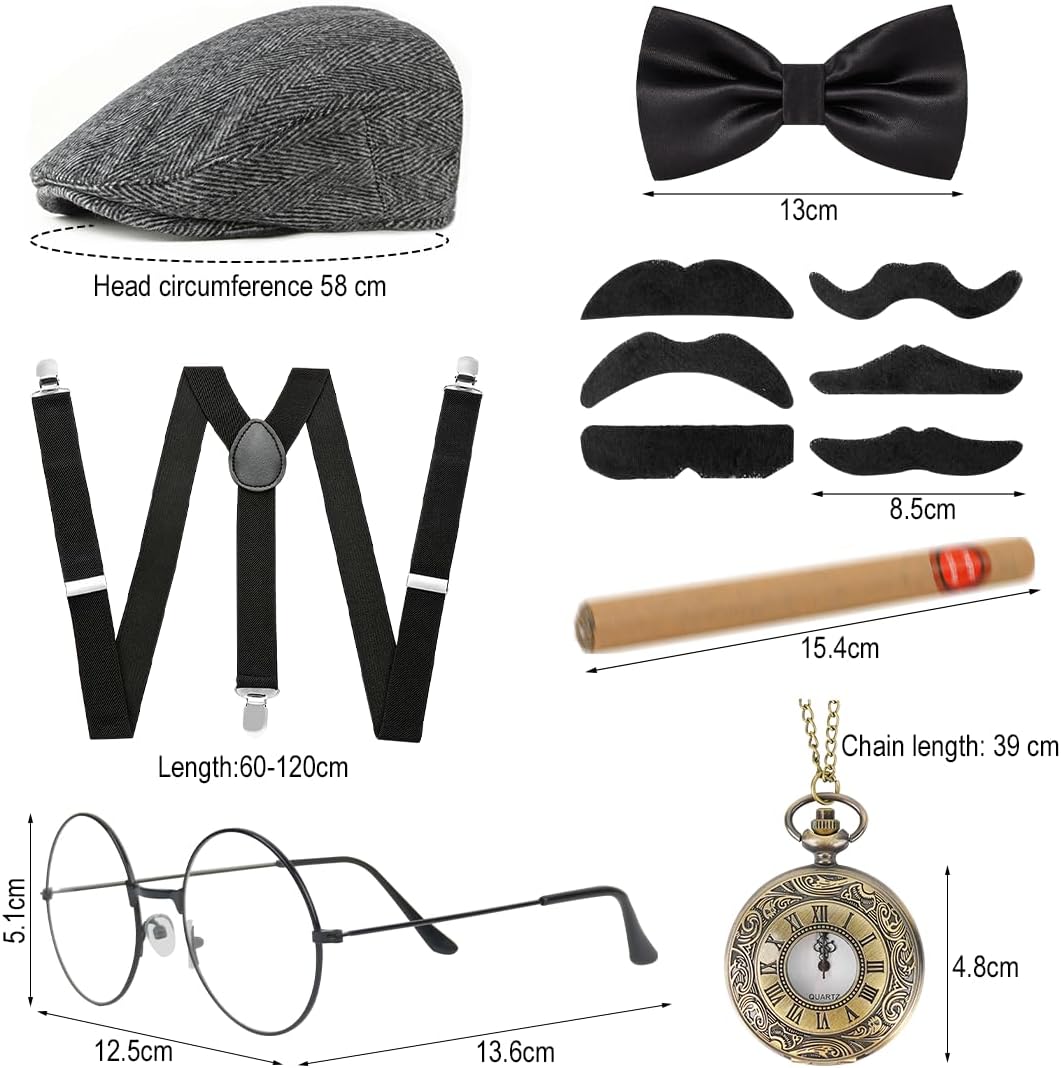 Set Accessori Uomo Anni '20: 1 cappello panama grigio, 1 papillon, 1 cravatta, 1 bretelle elastiche regolabili, 1 orologio da tasca vintage giocattolo, 6 baffi artificiali, 1 paio di occhiali, un oggetto di scena decorativo. Gli accessori per il costume di Carnevale sono realizzati in materiale di alta qualità, l'orologio da tasca vintage, il cappello panama e i baffi, rendono il tuo costume più interessante, le classiche bretelle elastiche regolabili e il papillon ti rendono più formale, abbinano il tuo costume per integrarsi completamente nella scena della festa. Gli accessori da uomo in stile gangster anni '20 sono realizzati in taglie adatte alla maggior parte degli uomini e si abbinano facilmente a vari outfit, conferendo un tocco vintage distintivo a qualsiasi look. Gli accessori da uomo degli anni '20 sono ideali per feste anni '20, gangster party, proms, cocktail party, feste in maschera, carnevali, matrimoni o per l'abbigliamento di tutti i giorni. Se avete domande sugli articoli ricevuti, non esitate a contattarci.