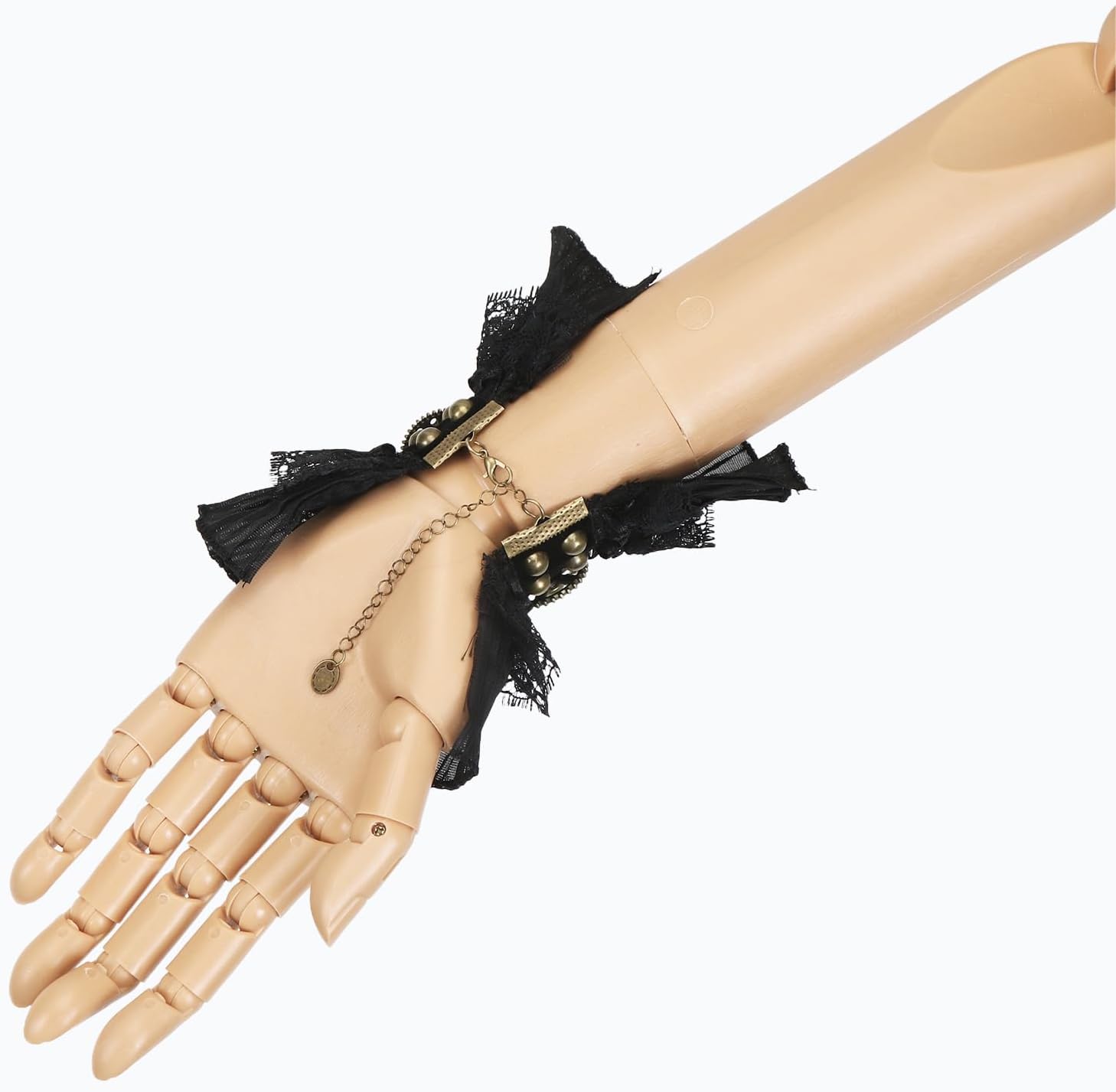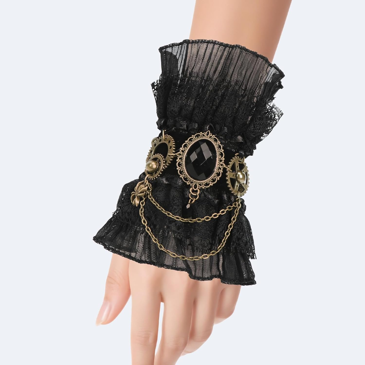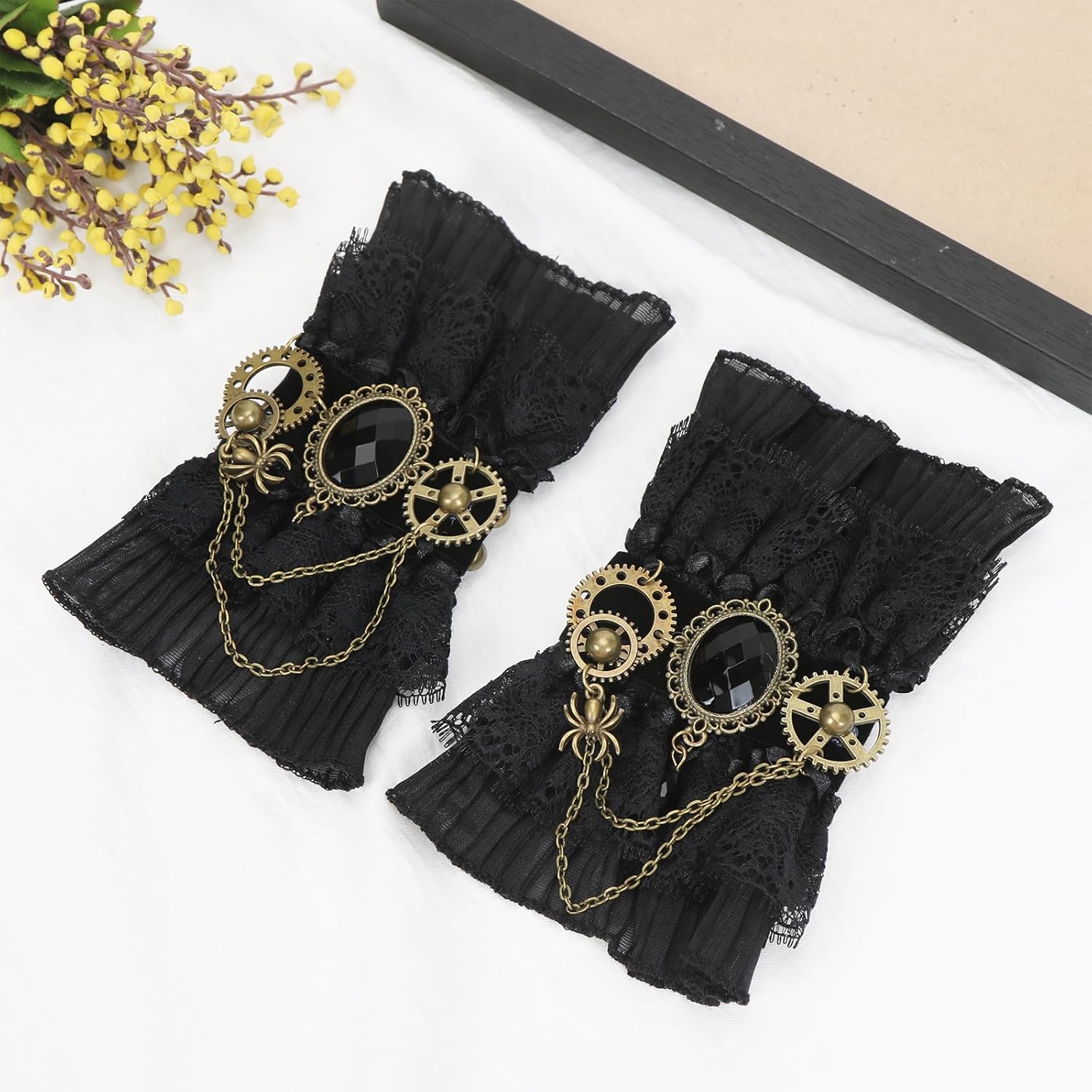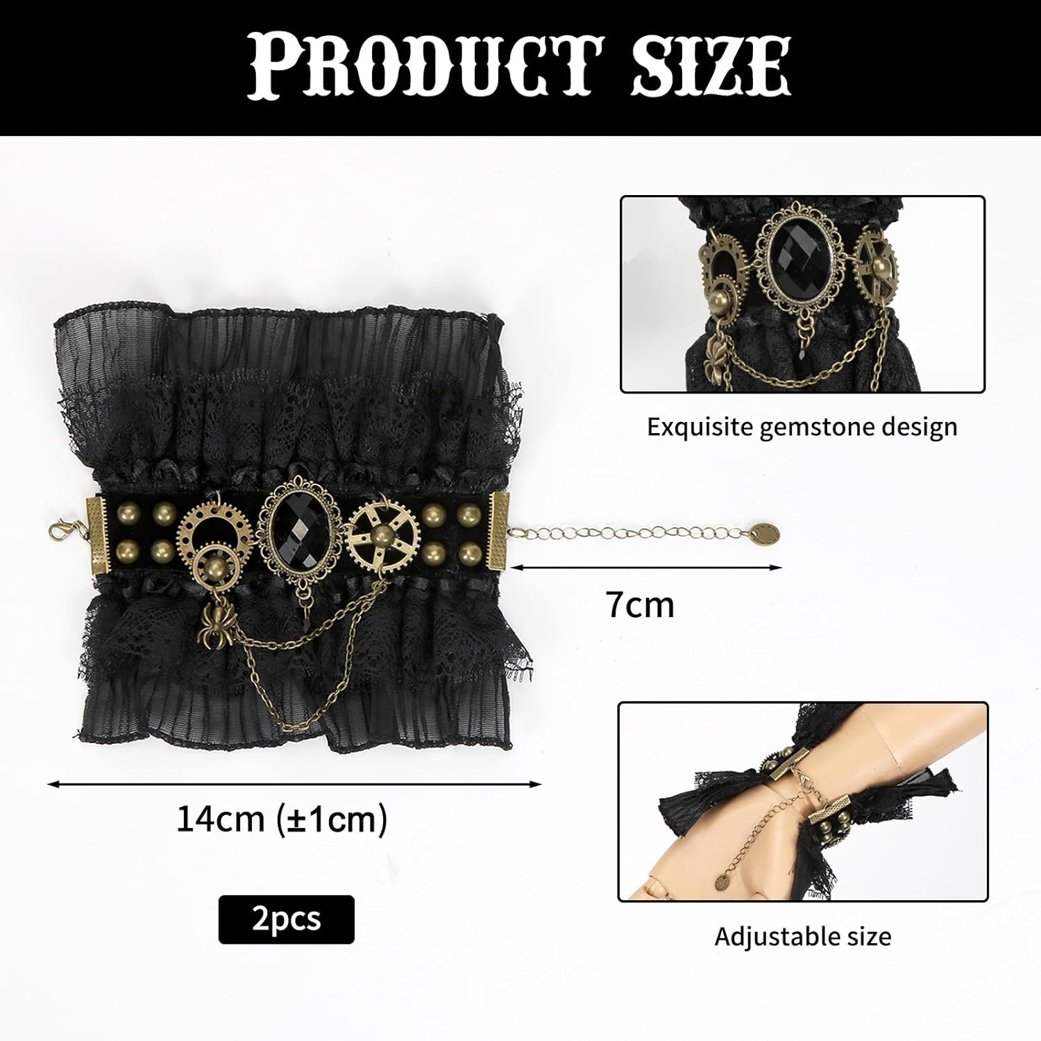 Die Spitzenstulpen sehen aus wie abgebildet. Der Stoff geht nicht ganz um das Handgelenk, innen werden sie mit einem Kettenverschluss verschlossen. Dadurch passen sie auf unterschieldich breite Handgelenke. Ich habe etwas breitere Handgelenke und bekam sie gut zu. Sie sind angnehm zu tragen und werten das jeweilige Kleidungsstück auf. Ich finde, sie sind auch jenseits von Fasching oder Events gut zu tragen.