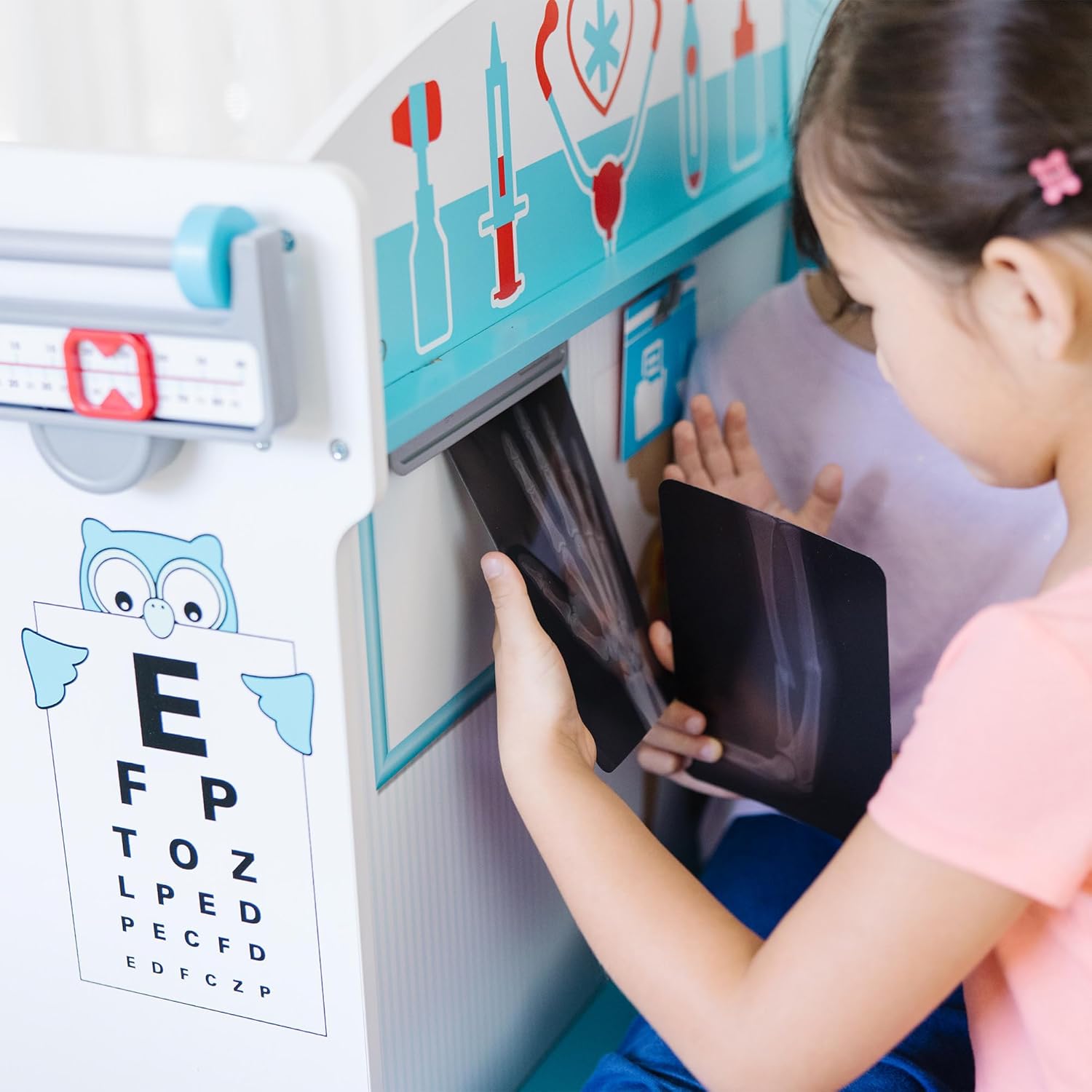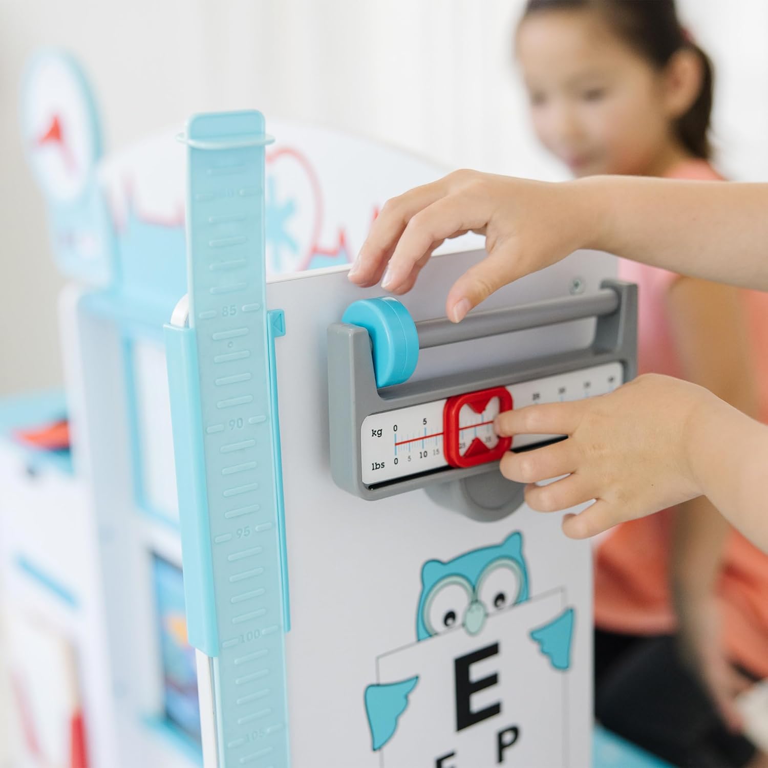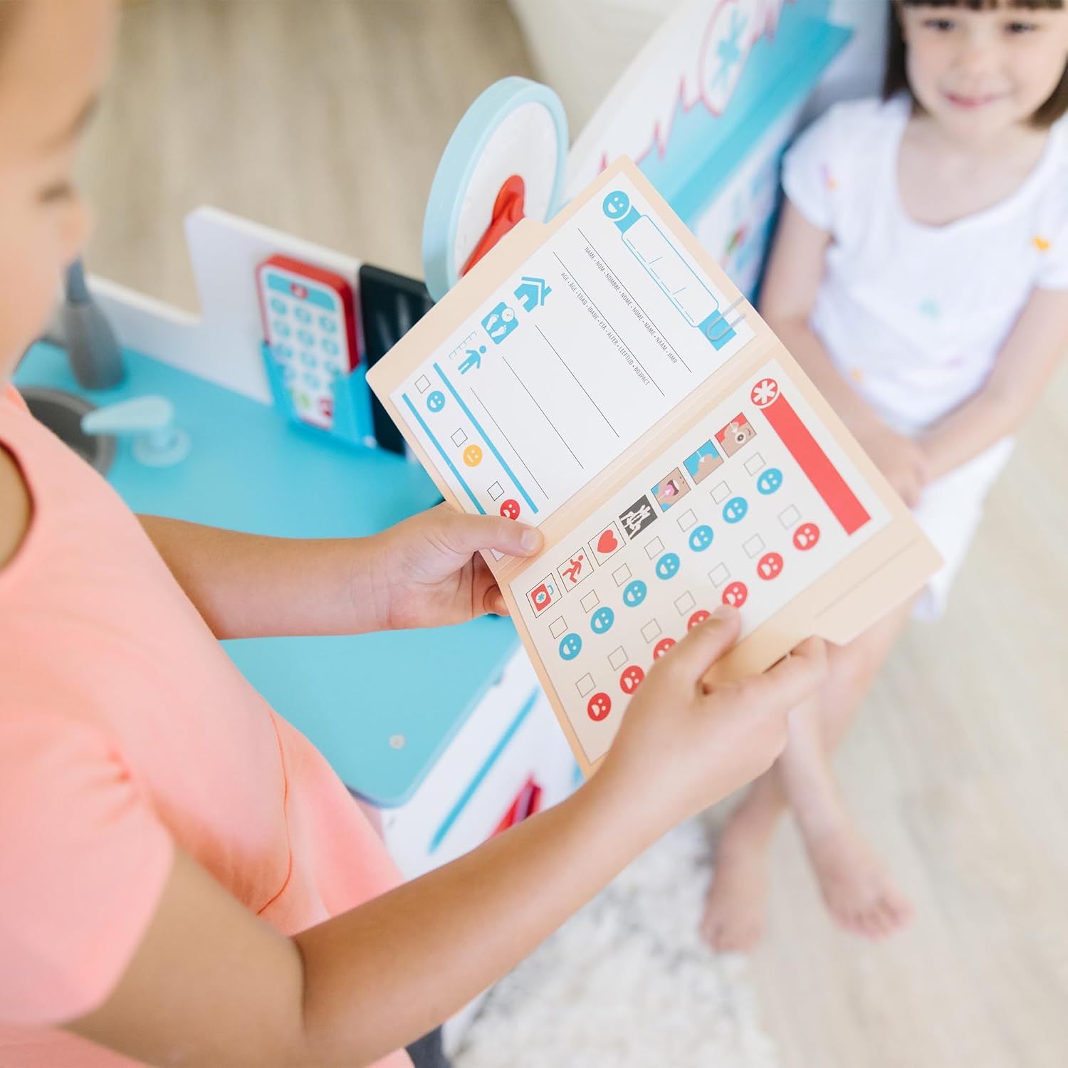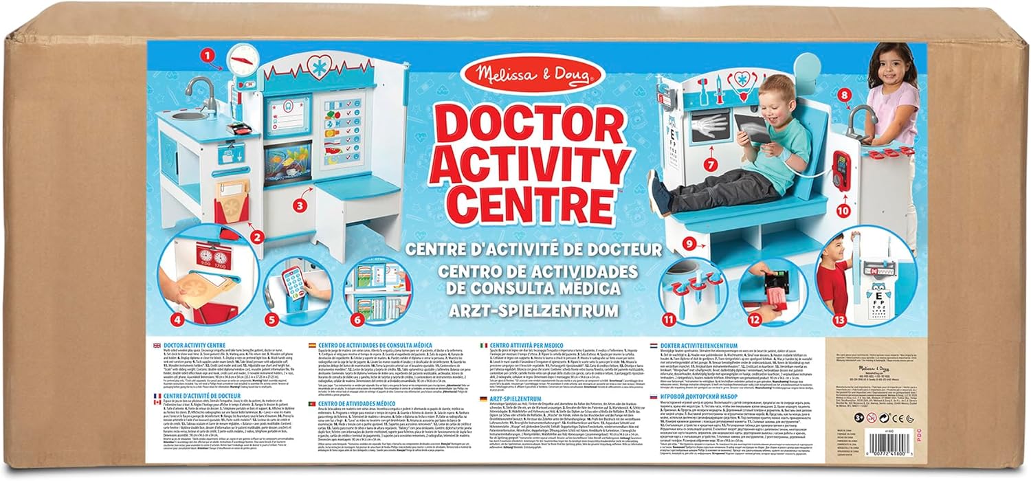 Spazio da gioco in legno con diversi lati a tema studio del medico con sala d’attesa, sala visite, lavandino e accettazione Spazio da gioco in legno con diversi lati a tema studio del medico con sala d’attesa, sala visite, lavandino e accettazione Tra gli altri dettagli realistici, lettore di carta di credito e carta, insegna fronte-retro, cartella del paziente riutilizzabile e porta-cartella, spazio per inserire la cartella, cellulare in legno con supporto Ideale per alleviare la paura delle visite dal medico; incoraggia il gioco immaginativo, empatico e di accudimento