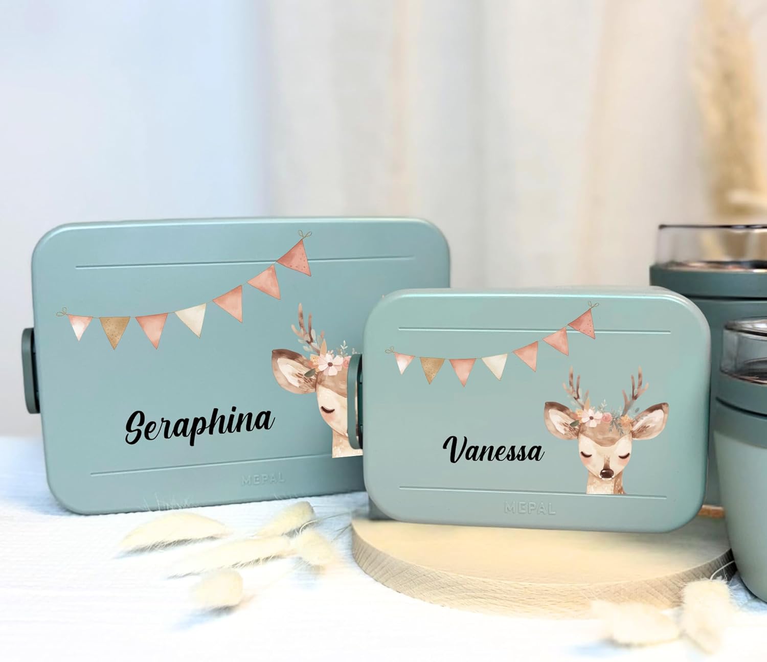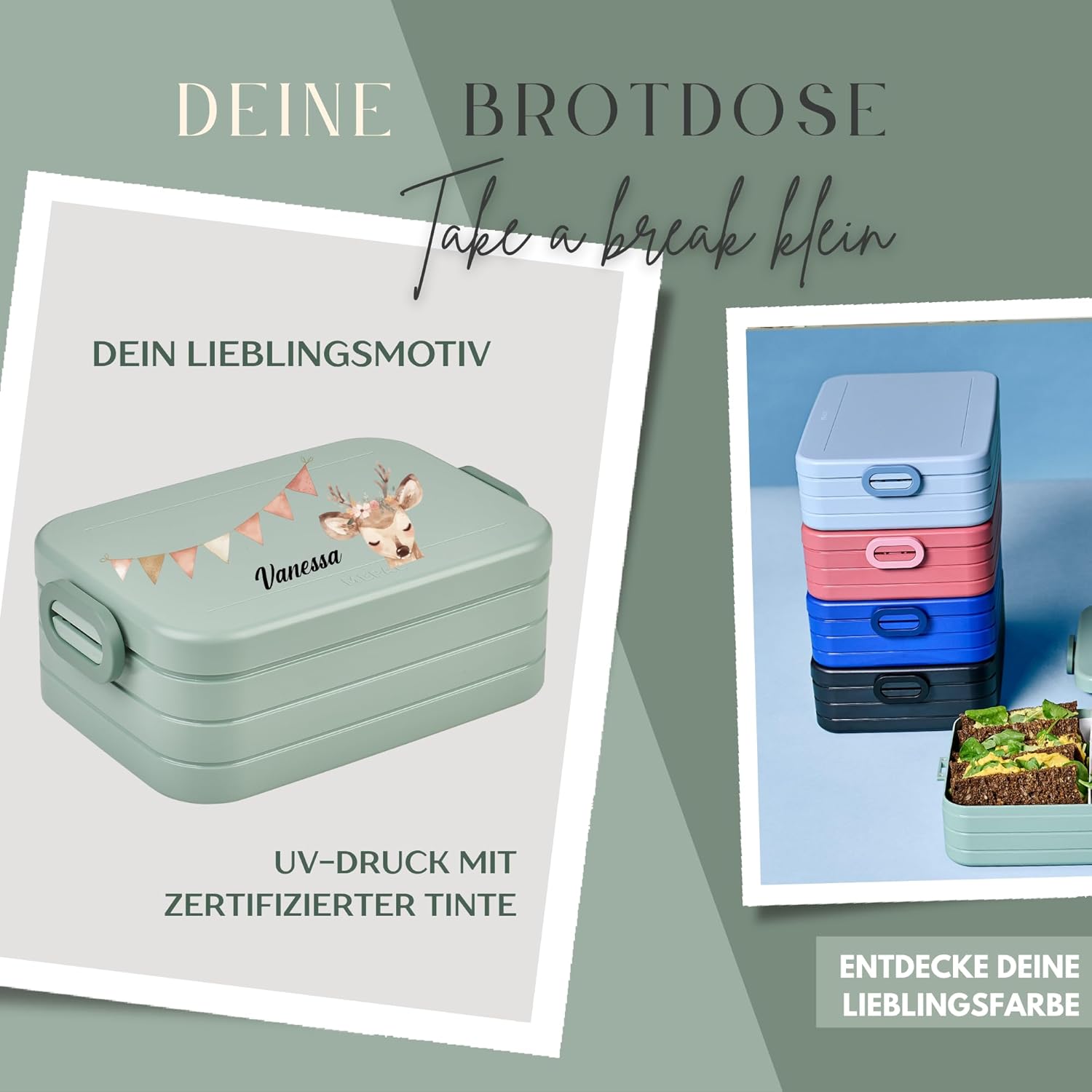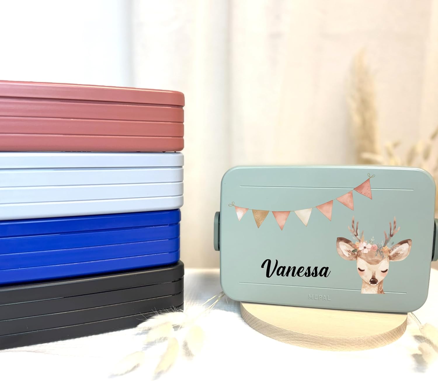 Contenitore per il pranzo personalizzato: Mepal contenitore per il pranzo con cervo colorato stampato e nome. Clicca sul pulsante giallo "Personalizza ora" e personalizza un vero pezzo unico. Design intelligente: contenitore per il pranzo per bambini con scomparti e inserto Bento con forchetta. Perfetto per porzionare diversi snack come yogurt, frutta, salse o caramelle. Chiusura a clip per bambini e facile da aprire. Pratico nella vita di tutti i giorni: perfetto per la scuola, l'asilo o per gite e viaggi. Il contenitore per il pranzo è a prova di perdite e può quindi essere trasportato in modo ideale nello zaino della scuola. Stampa certificata: la personalizzazione e il motivo colorato sono bambini e rispettosi dell'ambiente. Il corpo del contenitore è lavabile in lavastoviglie. Il regalo perfetto: sorprendi ragazze e ragazzi con un regalo inconfondibile per l'inizio della scuola, il compleanno e qualsiasi altra occasione. Un'idea regalo unica e personalizzata.