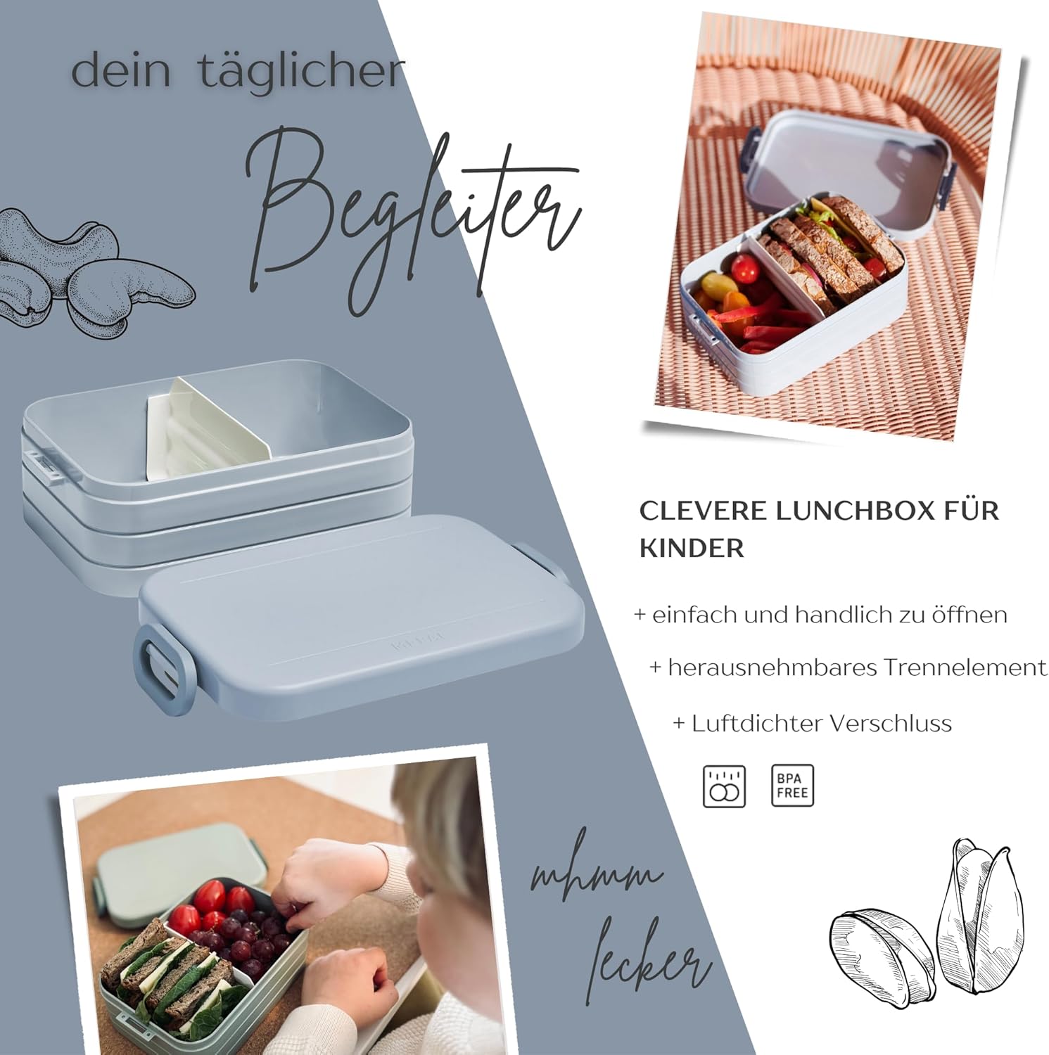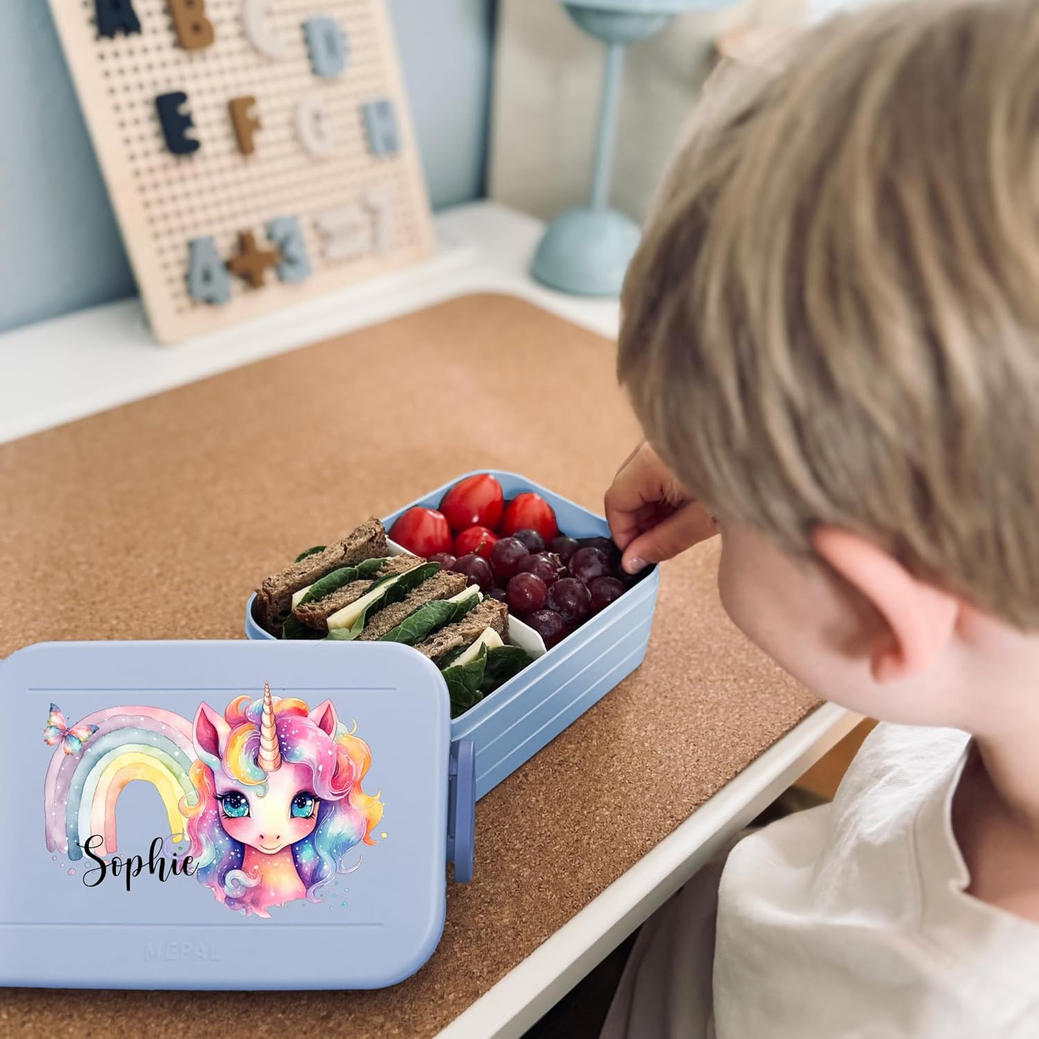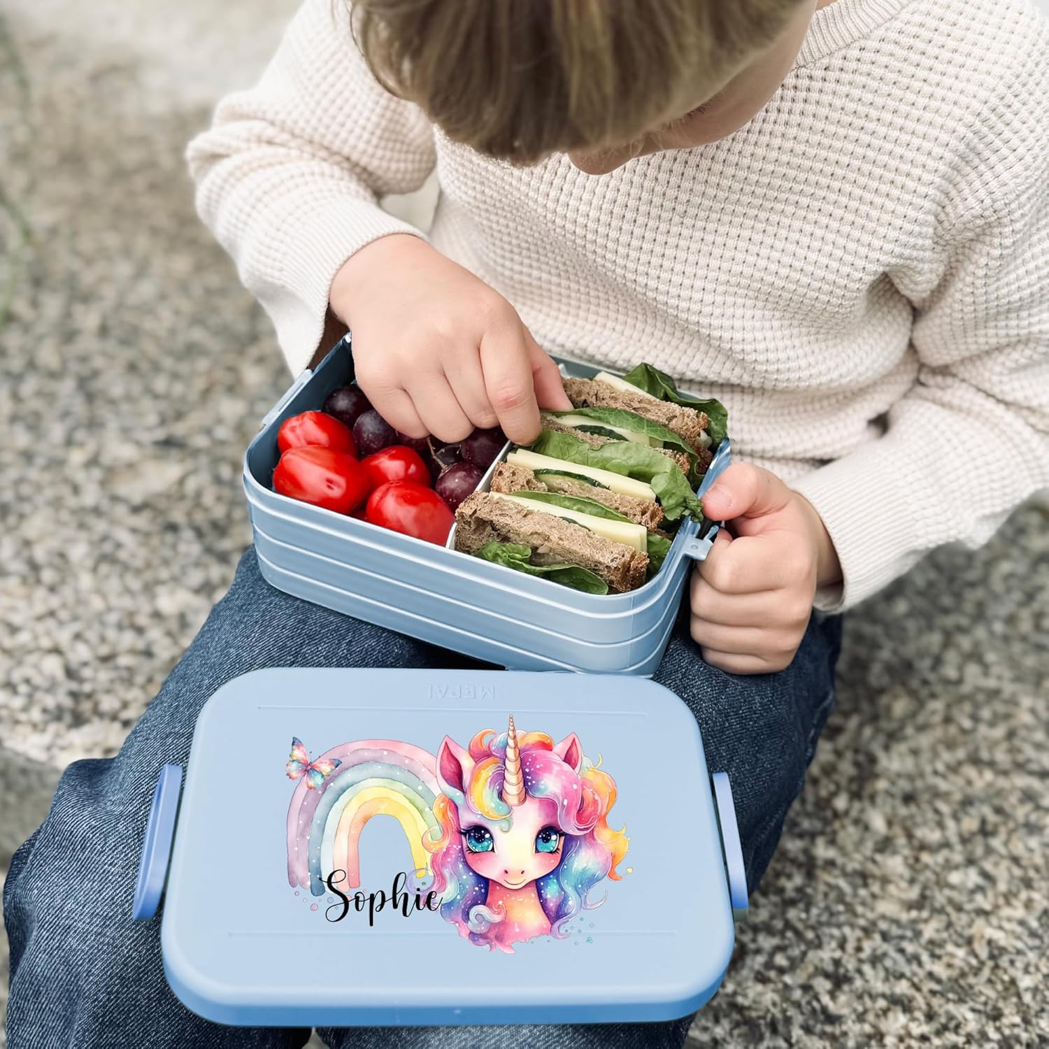 Contenitore per il pranzo personalizzato: Mepal contenitore per il pranzo con stampa di unicorno colorato, arcobaleno, farfalla e nome. Clicca sul pulsante giallo "Personalizza ora" e personalizza un vero pezzo unico. Design ben congegnato: contenitore per il pranzo per bambini con divisore per il trasporto. Perfetto per porzionare diversi snack come frutta, pane o caramelle. Chiusura a clip per bambini e facile da aprire. Pratico nella vita di tutti i giorni: perfetto per la scuola, l'asilo o per gite e viaggi. Il contenitore per il pranzo è a prova di perdite e può quindi essere trasportato in modo ideale nello zaino della scuola. Stampa certificata: la personalizzazione e il motivo colorato sono bambini e rispettosi dell'ambiente. Il corpo del contenitore è lavabile in lavastoviglie. Il regalo perfetto: sorprendi ragazze e ragazzi con un regalo inconfondibile per l'inizio della scuola, il compleanno e qualsiasi altra occasione. Un'idea regalo unica e personalizzata.