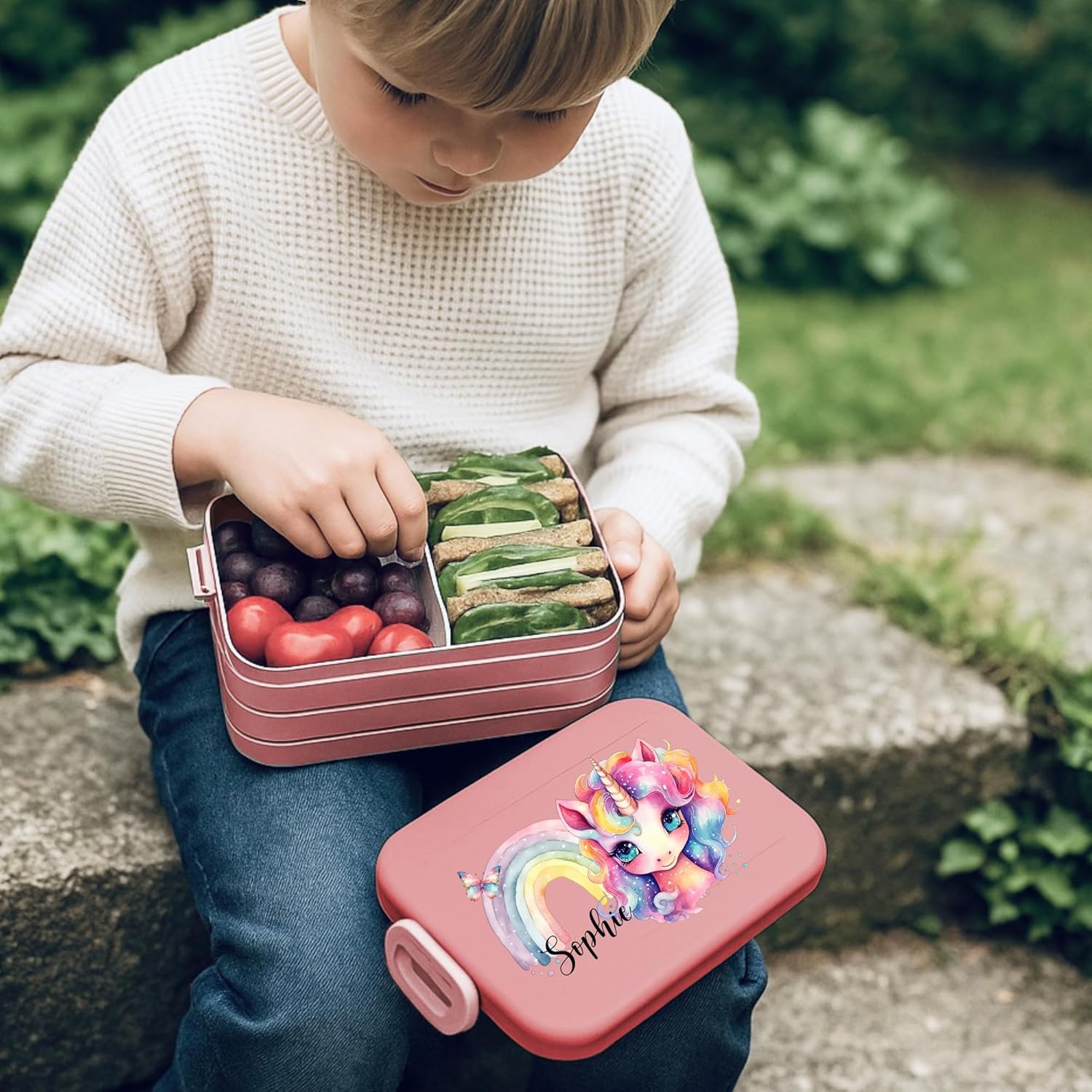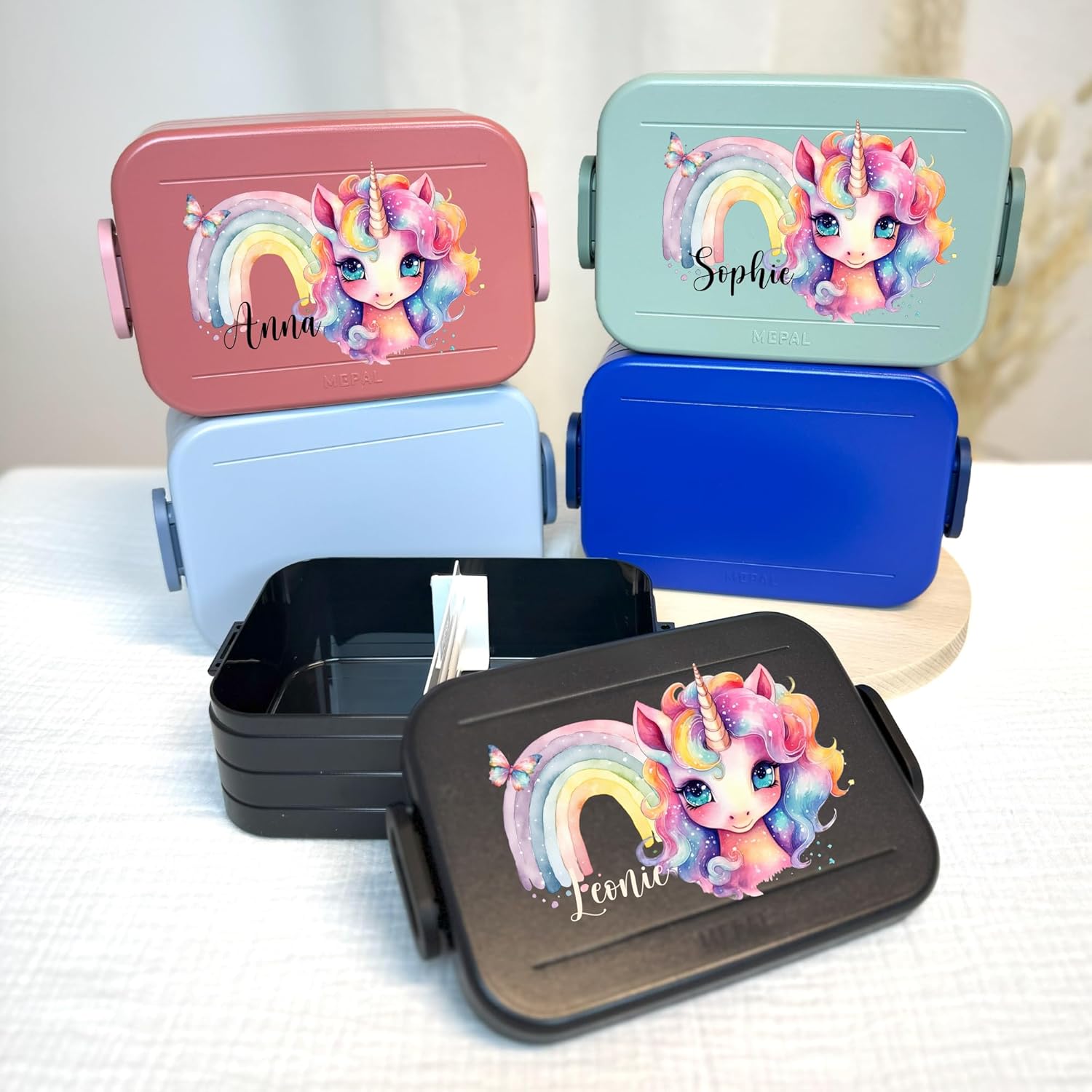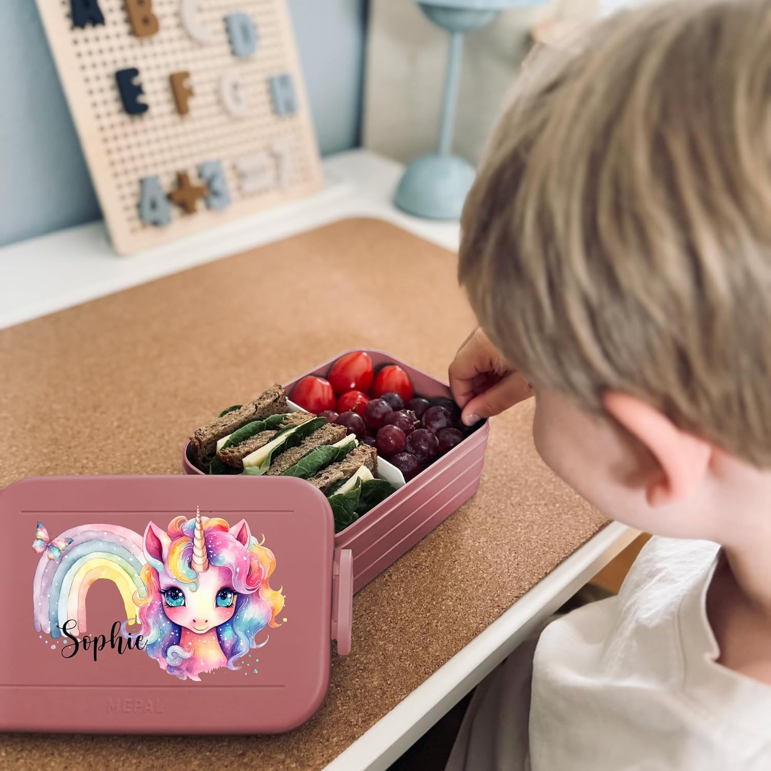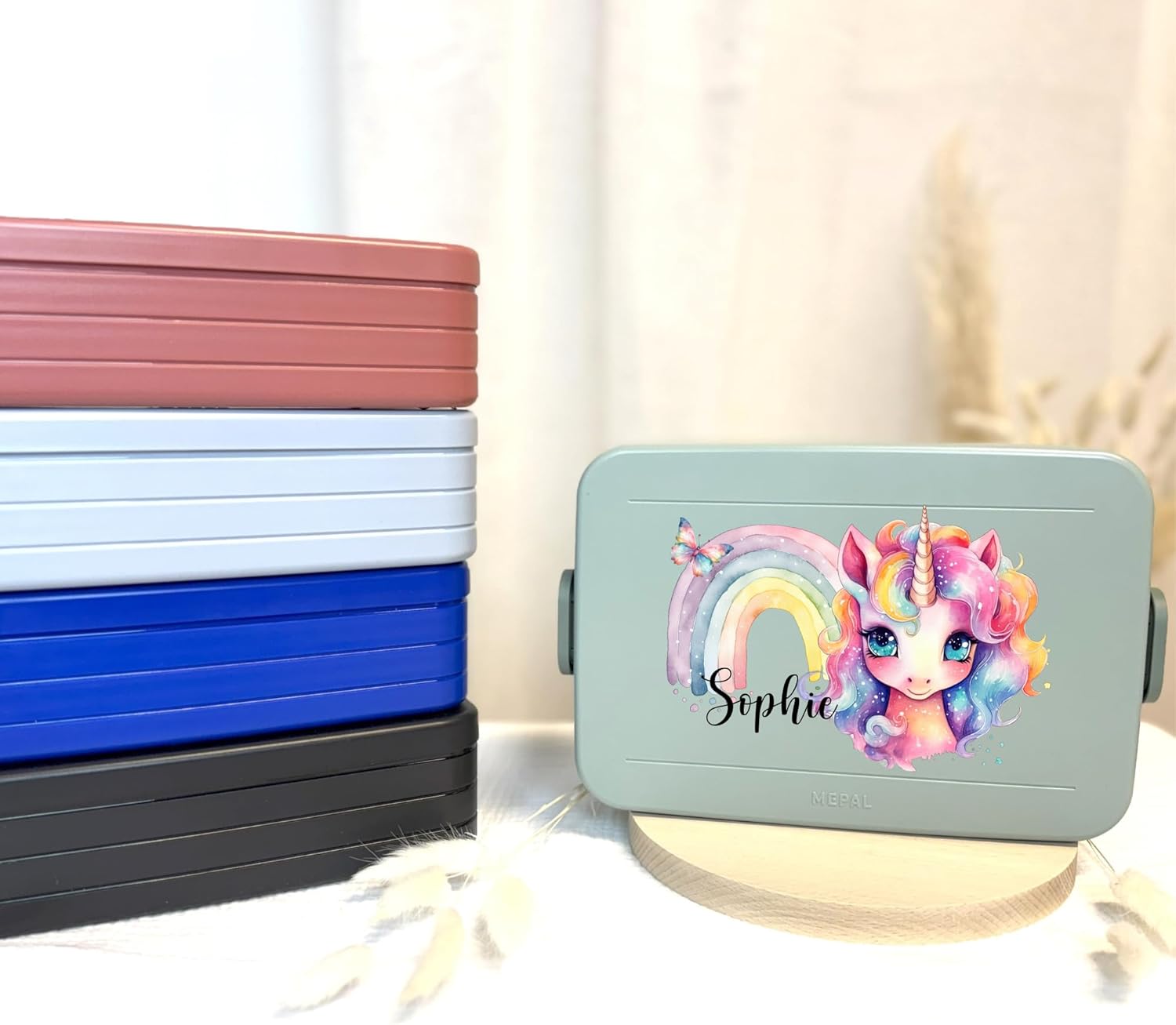 Contenitore per il pranzo personalizzato: Mepal contenitore per il pranzo con stampa di unicorno colorato, arcobaleno, farfalla e nome. Clicca sul pulsante giallo "Personalizza ora" e personalizza un vero pezzo unico. Design ben congegnato: contenitore per il pranzo per bambini con divisore per il trasporto. Perfetto per porzionare diversi snack come frutta, pane o caramelle. Chiusura a clip per bambini e facile da aprire. Pratico nella vita di tutti i giorni: perfetto per la scuola, l'asilo o per gite e viaggi. Il contenitore per il pranzo è a prova di perdite e può quindi essere trasportato in modo ideale nello zaino della scuola. Stampa certificata: la personalizzazione e il motivo colorato sono bambini e rispettosi dell'ambiente. Il corpo del contenitore è lavabile in lavastoviglie. Il regalo perfetto: sorprendi ragazze e ragazzi con un regalo inconfondibile per l'inizio della scuola, il compleanno e qualsiasi altra occasione. Un'idea regalo unica e personalizzata.