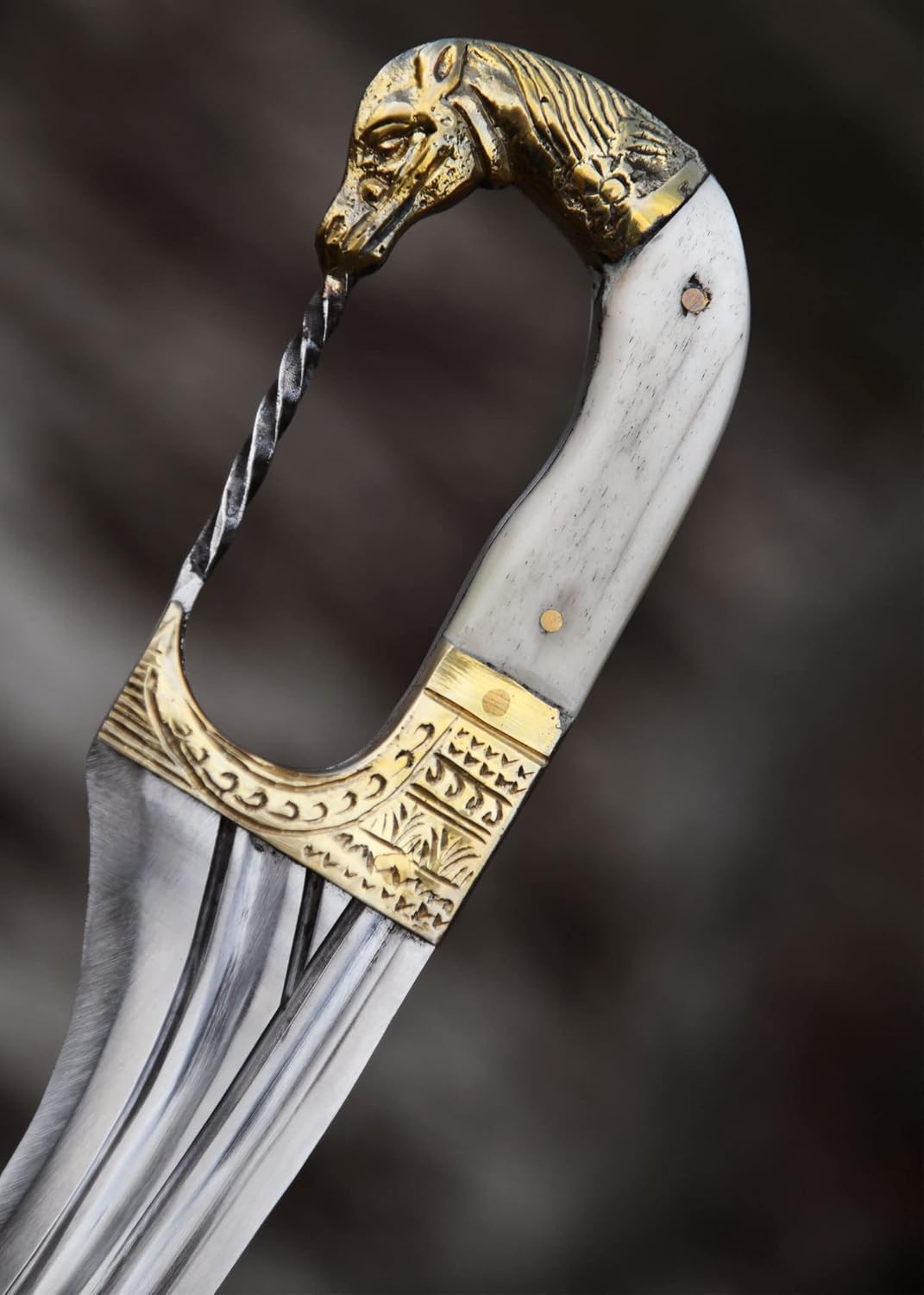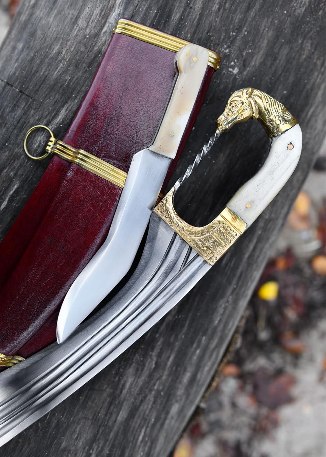 Replica storica: Replica di una Falcata del IV-III secolo. secolo a.C. aC, la tipica spada preromana dei Celtiberici, simile alla Kopis greca e alla Khukri nepalese, ideale per collezionisti e appassionati di rievocazione storica Materiali di alta qualità: lama in acciaio per molle EN45 con sgualci decorativi, gusci del manico in vero osso con rivetti in ottone e manico a forma di testa di cavallo in ottone decorato ad arte per un aspetto autentico Accessori inclusi: La consegna include un piccolo coltello con manico in osso e un fodero in legno con rivestimento in pelle rossa e raccordi in ottone, per un trasporto sicuro e una presentazione attraente Oggetto decorativo: spada non affilata (lunghezza totale: ca. 59 cm, lunghezza lama: ca. 47 cm, peso senza fodero: ca. 940 g) e coltello laterale, perfetto come oggetto da collezione o accessorio per costumi, non adatto per battaglie show Istruzioni per la cura: L'acciaio per molle non è inossidabile, si consiglia una cura regolare con olio universale; I manici in osso naturale possono variare nel colore e nella grana, ogni pezzo è unico