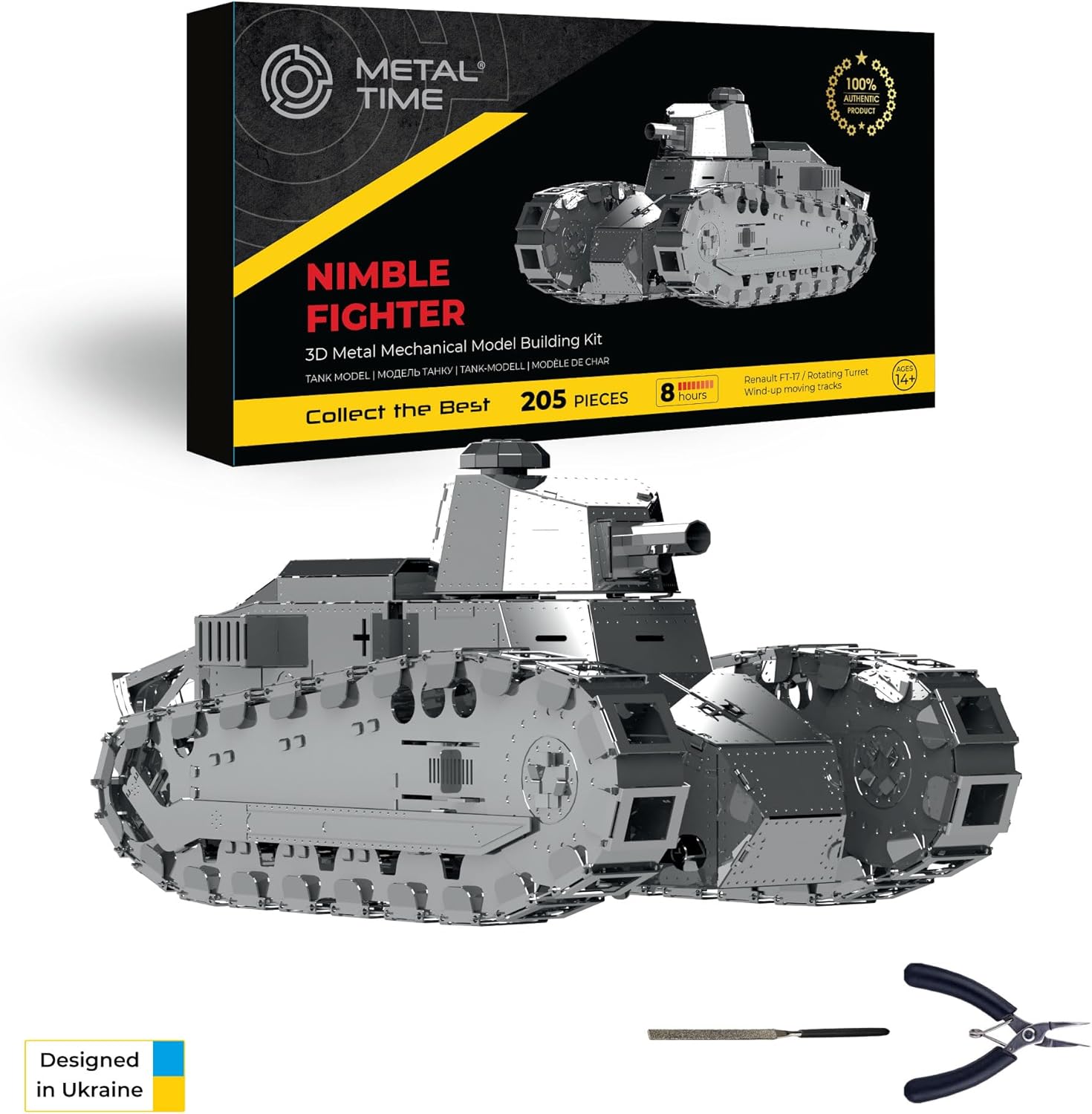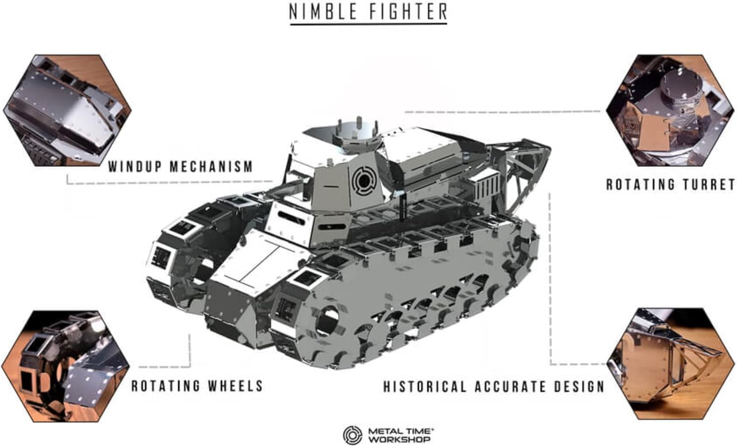 CARRO ARMATO FIGHTER - FT-17 è uno dei migliori carri armati della Prima Guerra Mondiale, il primo carro leggero francese seriale al mondo, il cui layout è chiamato classico (compartimento di controllo - davanti, combattimento con torre di rotazione circolare - al centro e trasmissione motore - nella parte posteriore). Progettato come carro armato di supporto immediato alla fanteria nel 1916-1917 dal famoso produttore di automobili Louis Renault. STORIA DEL PROTOTIPO - Uno dei carri armati più capaci ed efficaci della prima guerra mondiale fu il carro leggero francese FT-17. La casa automobilistica Louis Renault inizialmente era riluttante a costruire un carro armato. Tuttavia si lasciò convincere dal colonnello Jean-Baptiste Eugène Estienne. È così che ha progettato e costruito l'FT-17. I vantaggi dell'FT-17 furono immediati. DESIGN UNICO - Il nostro team di progettazione ha prestato grande attenzione ai dettagli dell'F-17. Garantire l'accuratezza storica. I numerosi componenti rendono l'assemblaggio di questo modello una costruzione interessante. Il “Nimble Fighter” è un’aggiunta iconica alla nostra serie di carri armati. Consenti ai modellisti di collezionare l'intera serie. MANI esperte ed ESERCIZIO DI PERCEZIONE SPAZIALE – Molte parti e progetti complessi richiederanno agli utenti un duro lavoro per assemblare questo modello. Di conseguenza, otterrai un modello funzionante e storicamente accurato del leggendario veicolo da combattimento. CARATTERISTICHE e VANTAGGI - Il modello Nimble Fighter conserva tutte le caratteristiche di design dell'FT-17 originale. Come un portello anteriore riconoscibile per il conducente, una torretta girevole e una struttura di coda per superare le trincee. Un meccanismo di avvolgimento caricato a molla aziona gli ingranaggi che fanno girare i cingoli, consentendo al carro armato di superare piccoli ostacoli.