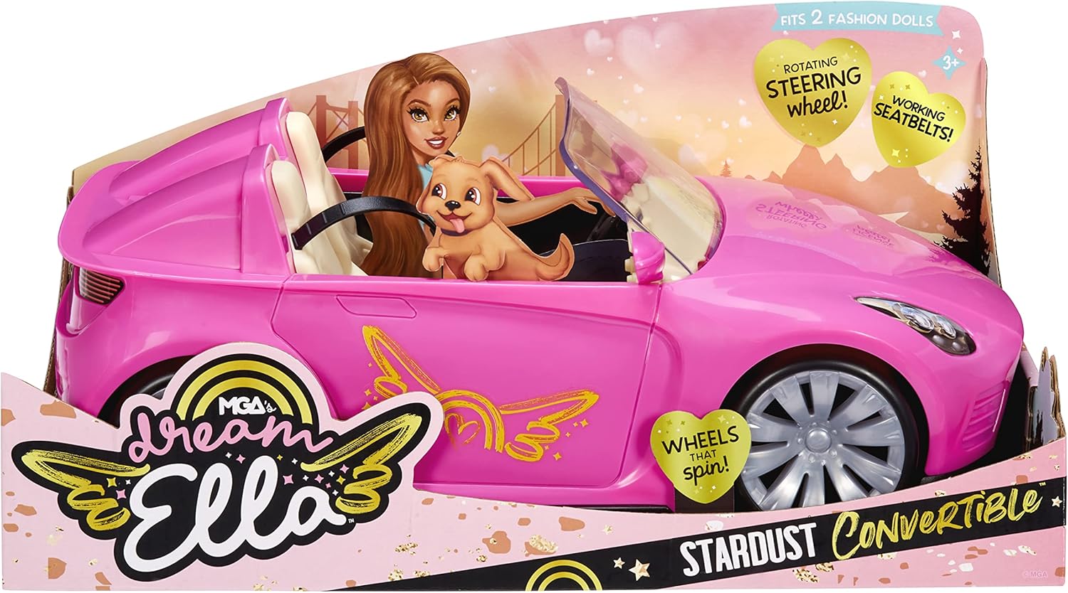 DECAPPOTABILE - L'auto Dream Ella di MGA ha un esterno rosa scintillante e interni moderni. Questa auto a due posti è decappotabile, ha cerchi argentati e fari con adesivi CINTURE DI SICUREZZA - L'auto ha specchietti laterali e sedili con cinture di sicurezza. Allaccia le cinture alle tue bambole prima di iniziare il viaggio verso la strada della fantasia RUOTE CHE GIRANO - Le ruote realistiche sono pronte per viaggiare verso la prossima destinazione ADATTA A 2 BAMBOLE ALLA MODA - L'auto può ospitare la maggior parte delle bambole alle moda da 29 cm. Bambole non incluse ETÀ - Regalo perfetto per stimolare la fantasia dei bambini dai 3 anni in su.