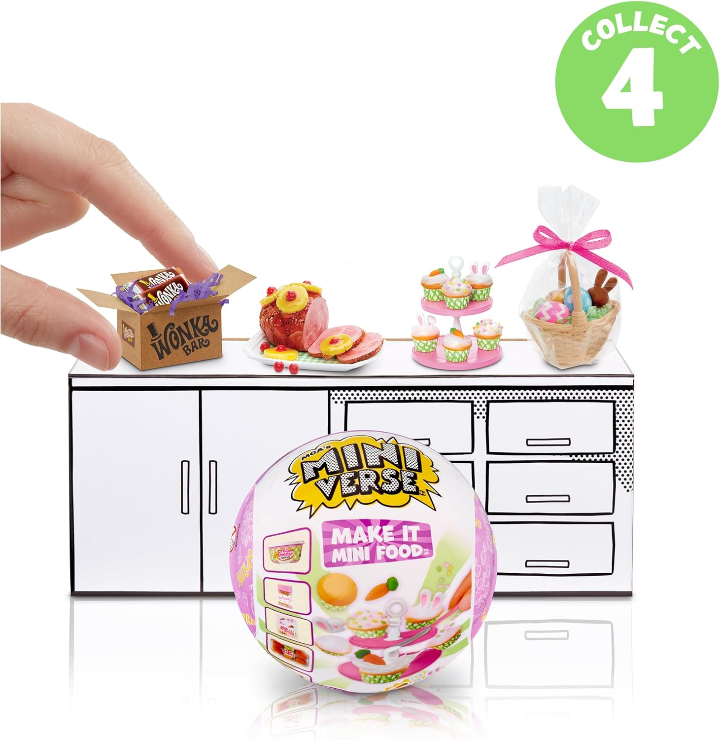 MAKE IT MINI FOOD TEMA PRIMAVERA: Mini cibi fai da te a tema primavera da realizzare, ambientare, esporre e collezionare; Miniverse è l'ORIGINALE mini oggetto da collezione che si può PREPARARE, ALLESTIRE ed ESPORRE. Costruisci la tua mini creazione SCOPRI: Ogni pallina viene fornita con mini ingredienti realistici e accessori a tema Primavera per creare mini repliche dei tuoi snack pasquali preferiti; ogni confezione è una sorpresa, quindi non saprai mai quale mini avrai finché non apri REALIZZA: Confronta il contenuto della confezione con la guida del collezionista inclusa, per vedere quale miniatura primaverile hai ricevuto, segui la ricetta sul retro per realizzare la tua mini replica da collezione SISTEMA: Dopo aver creato la mini creazione in resina, posiziona la replica sotto una qualsiasi luce UV, come il sole, fino a quando la resina non si sarà indurita; poi, avrai un oggetto da collezione primaverile pronto da esporre TINGI: Per la prima volta nel Miniverso, puoi cambiare colore alle tue miniature - il Cestino delle Uova include uova che puoi tingere per rivelare motivi unici e divertenti; nessun uovo è fatto allo stesso modo ESPONI: Ogni confezione viene fornita con UOVA speciali e un mini tavolo viola unico nel suo genere, disponibile solo in queste confezioni primaverili TROVA IL RARO BIGLIETTO D'ORO: Cerca le rarissime mini barrette Wonka di questa stagione primaverile - solo 20.000 pezzi disponibili in tutto il mondo