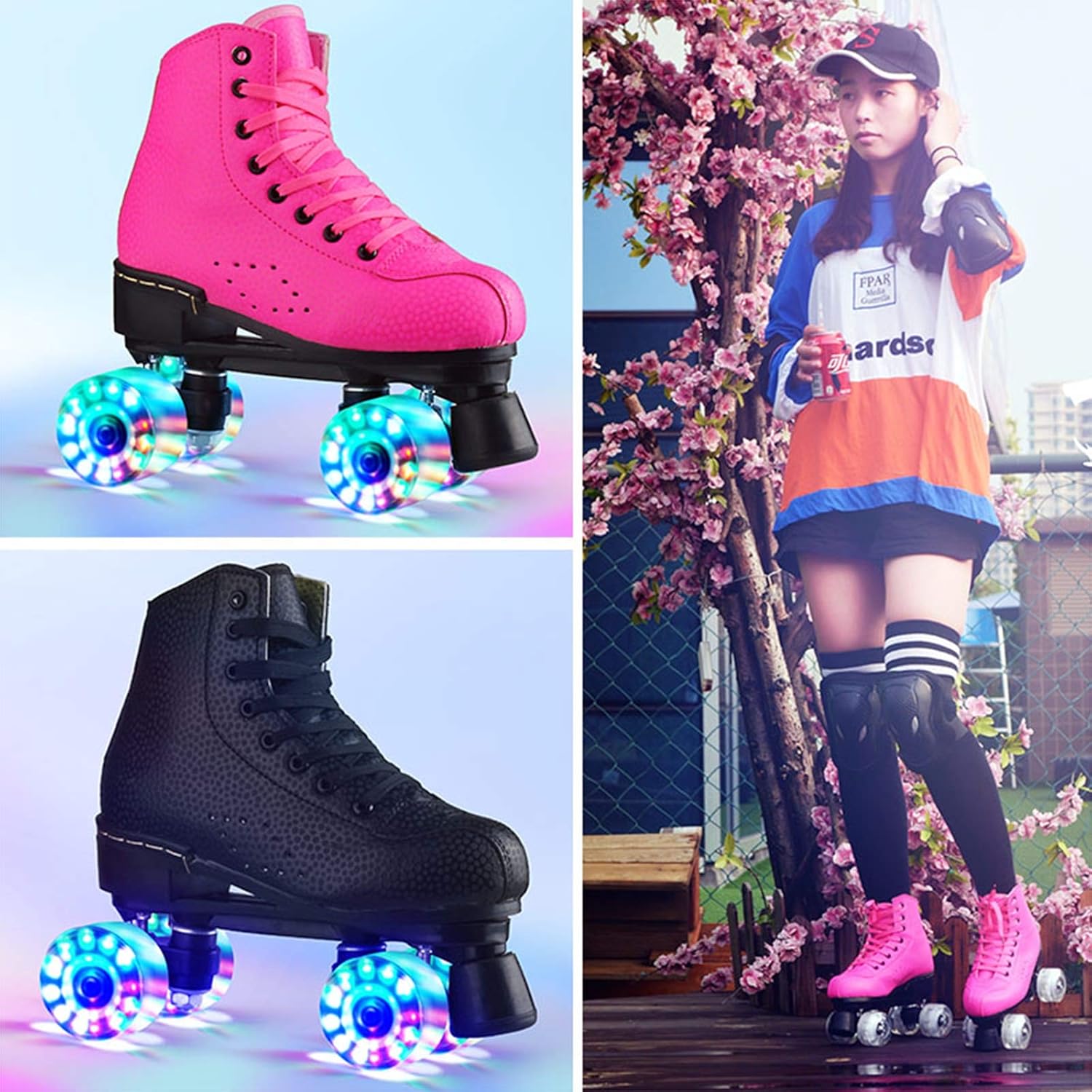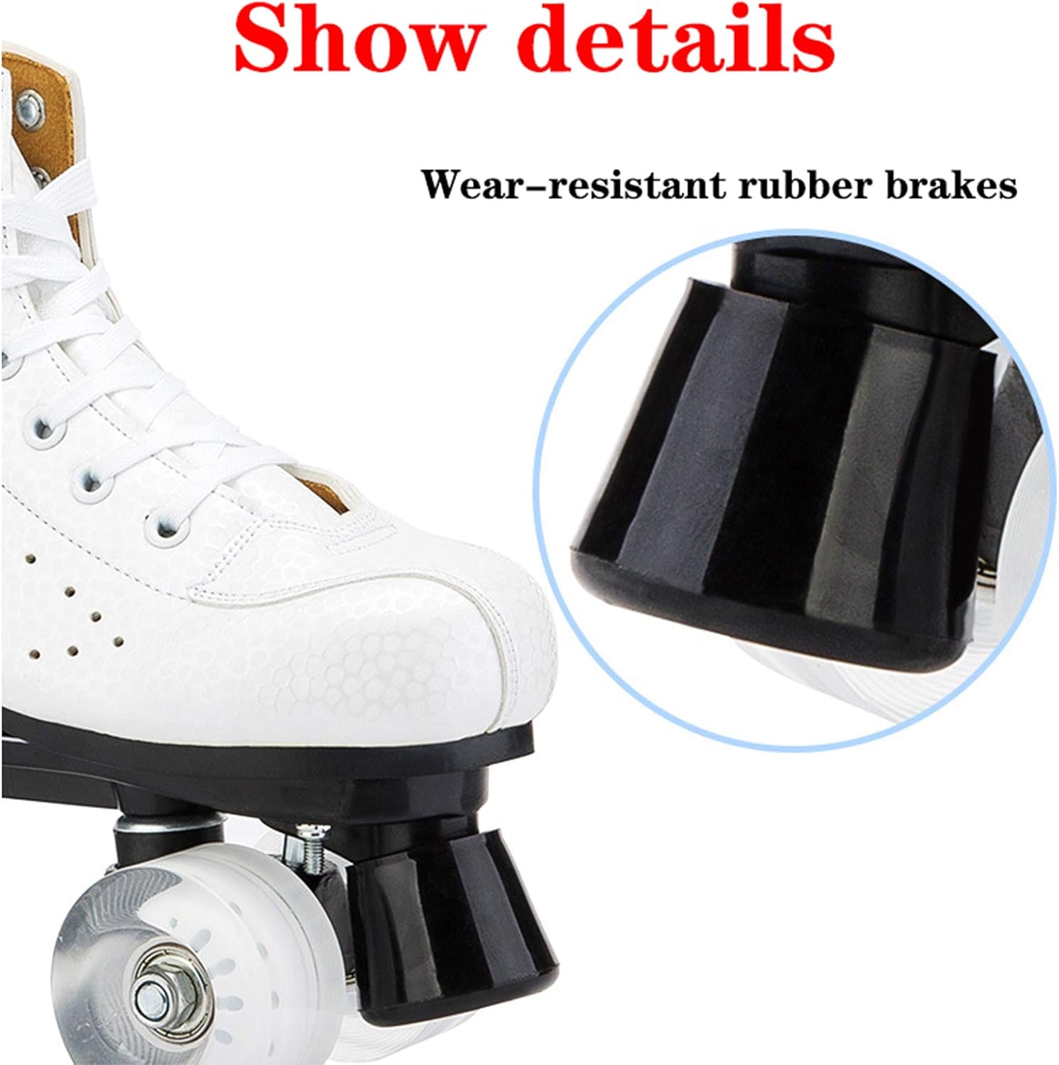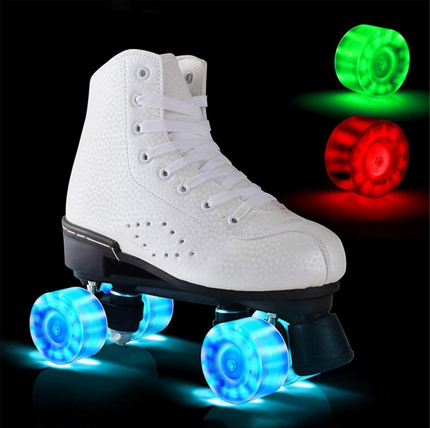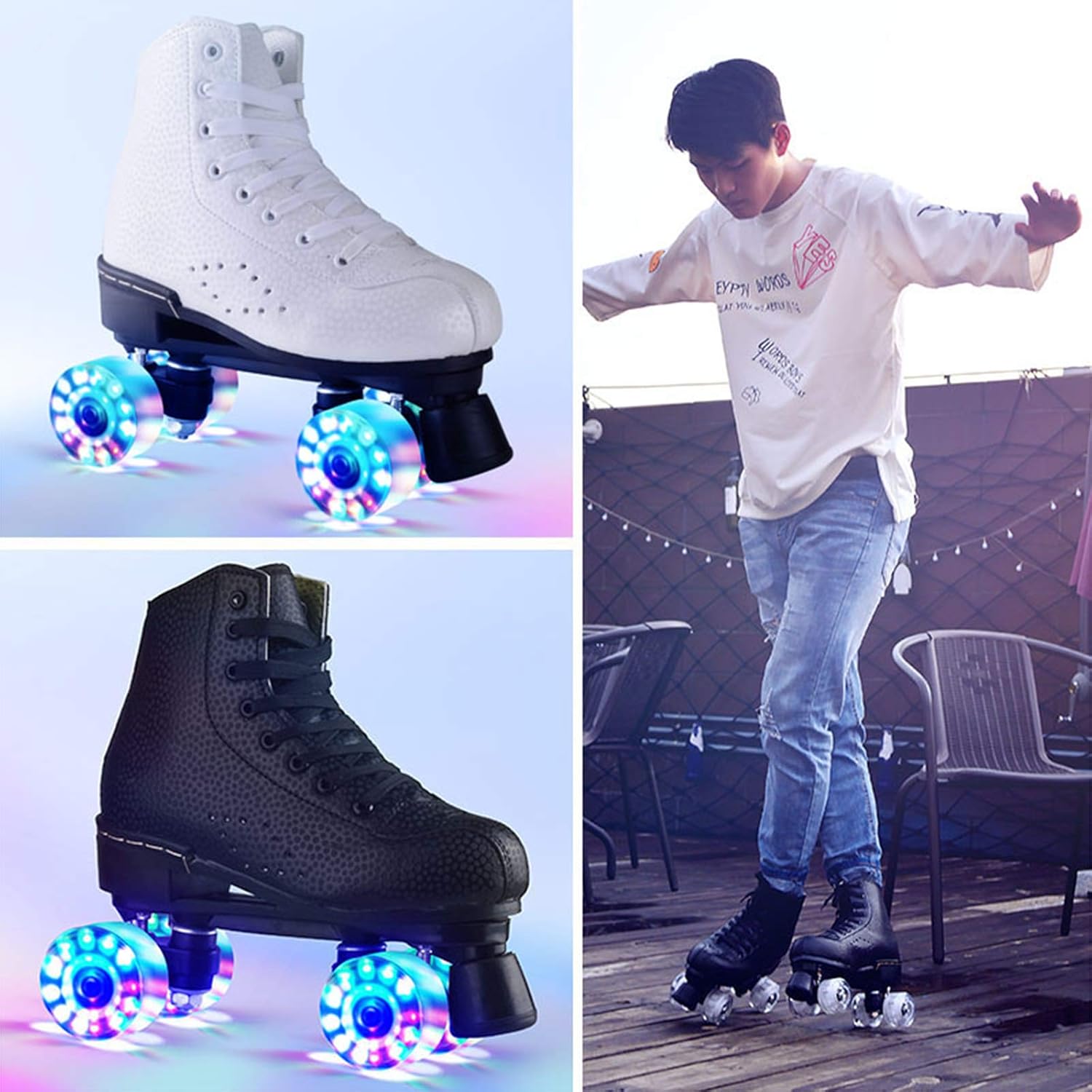 1: Ruota lampeggiante a LED: pattini a rotelle Flash Wheel, ruote a doppia fila in materiale poliuretanico, con luci a LED colorate. Basta stringere e far scorrere. Il fresco flash ti rende il centro della folla, 2: I pattini a rotelle sono perfetti per donne e uomini, look classici, ruote da skate, realizzati in materiale poliuretanico (PU) resistente e modellato, per prestazioni di pattinaggio sicure e affidabili, 3: Sistema di fissaggio rapido: chiusura con fibbia appositamente progettata, fibbia di sicurezza, cintura robusta con chiusura a strappo e laccio per garantire una vestibilità sicura, 4: Pedale robusto: facile da legare, comodo e traspirante, con un robusto pannello in punta che garantisce una migliore stabilità e presa senza lasciare segni sul pavimento, 5: Pattini a rotelle casual e ultra resistenti - Questi pattini a rotelle a quattro ruote sono rivestiti con morbida imbottitura per creare stivali da skateboard comodi e durevoli,