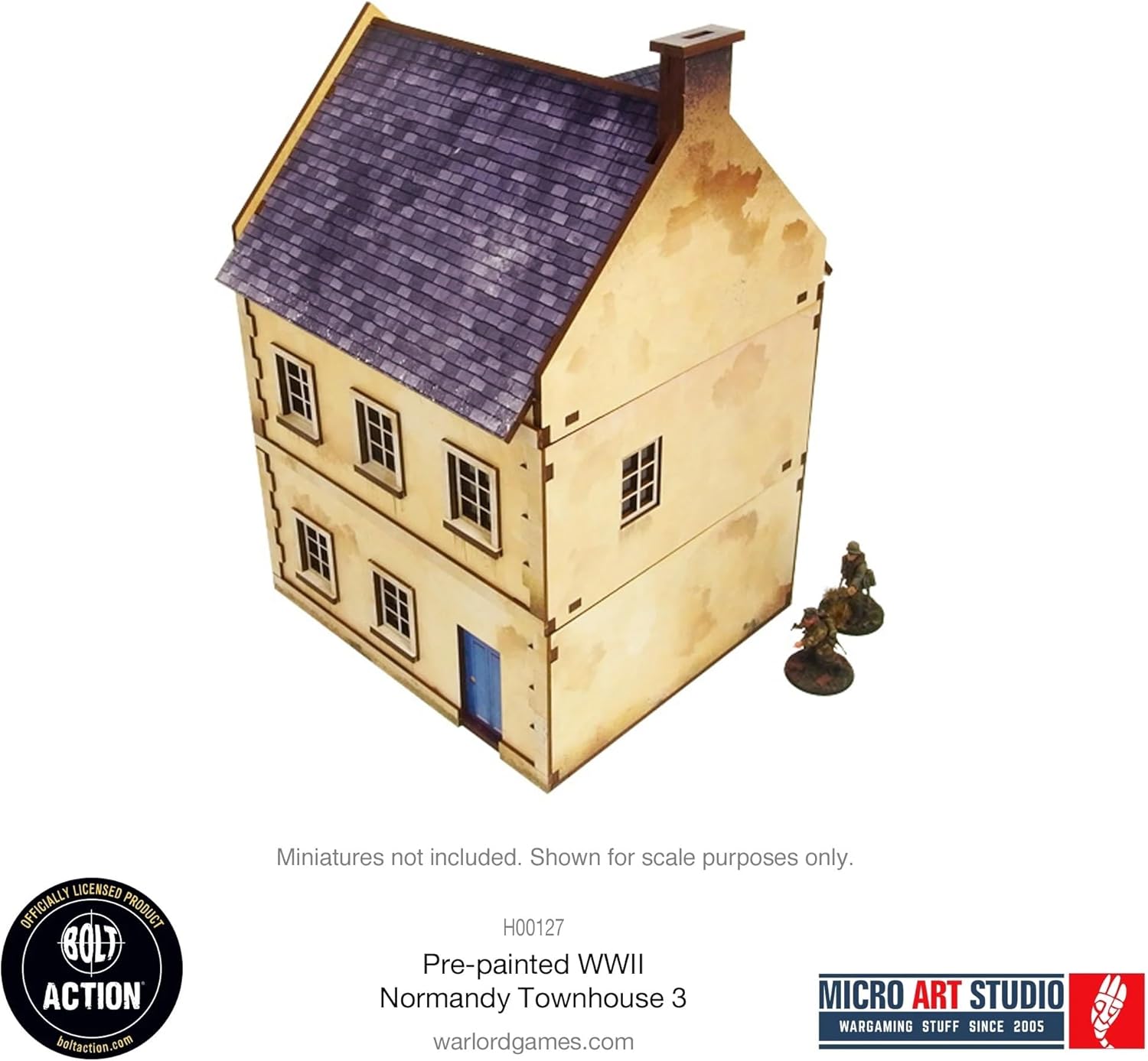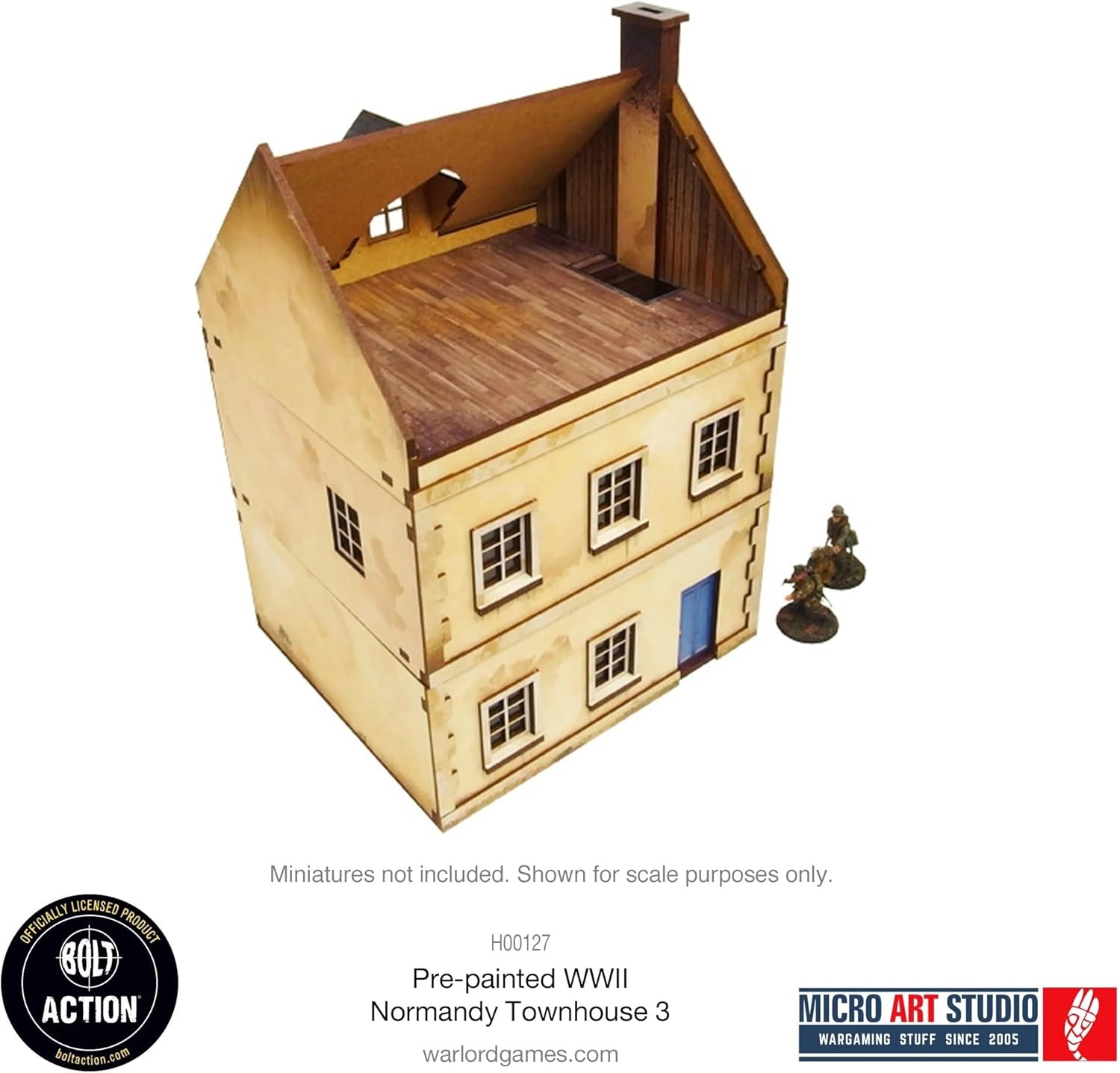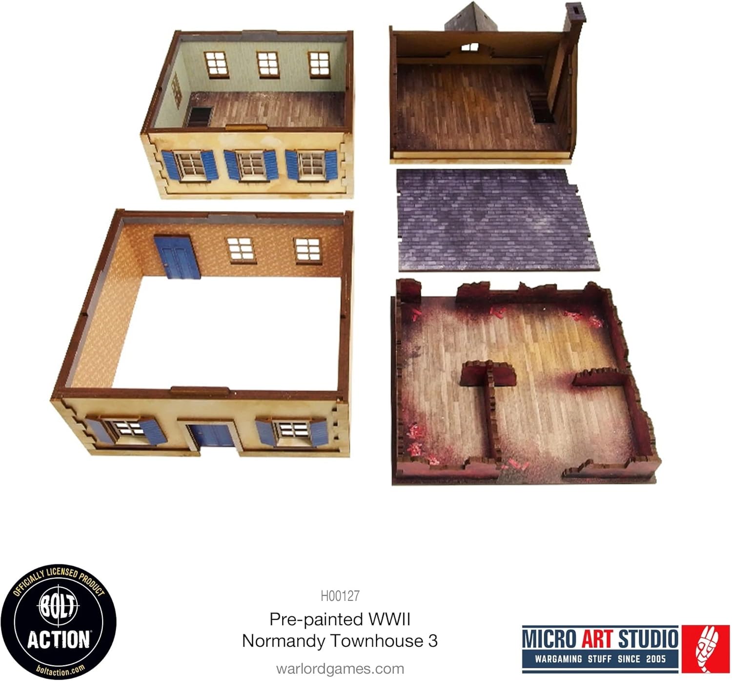 Edificio multicolore preverniciato (stampa UV) 3 livelli WW2 Normandy Townhouse 3 con interni colorati accessibili, livelli rimovibili e piano terra in rovina rimovibile. Questo modello viene consegnato in confezione, smontato e preverniciato. Ogni modello è tagliato da uno o più pannelli di HDF (HDF di fibra ad alta densità) di 3 mm e/o 1,5 mm di spessore. Lo scenario della serie WW2 potrebbe rivelarsi impegnativo da assemblare, parti a secco prima di applicare la colla per evitare errori. Si consiglia la colla PVA (bianca). Scala: 28-30 mm