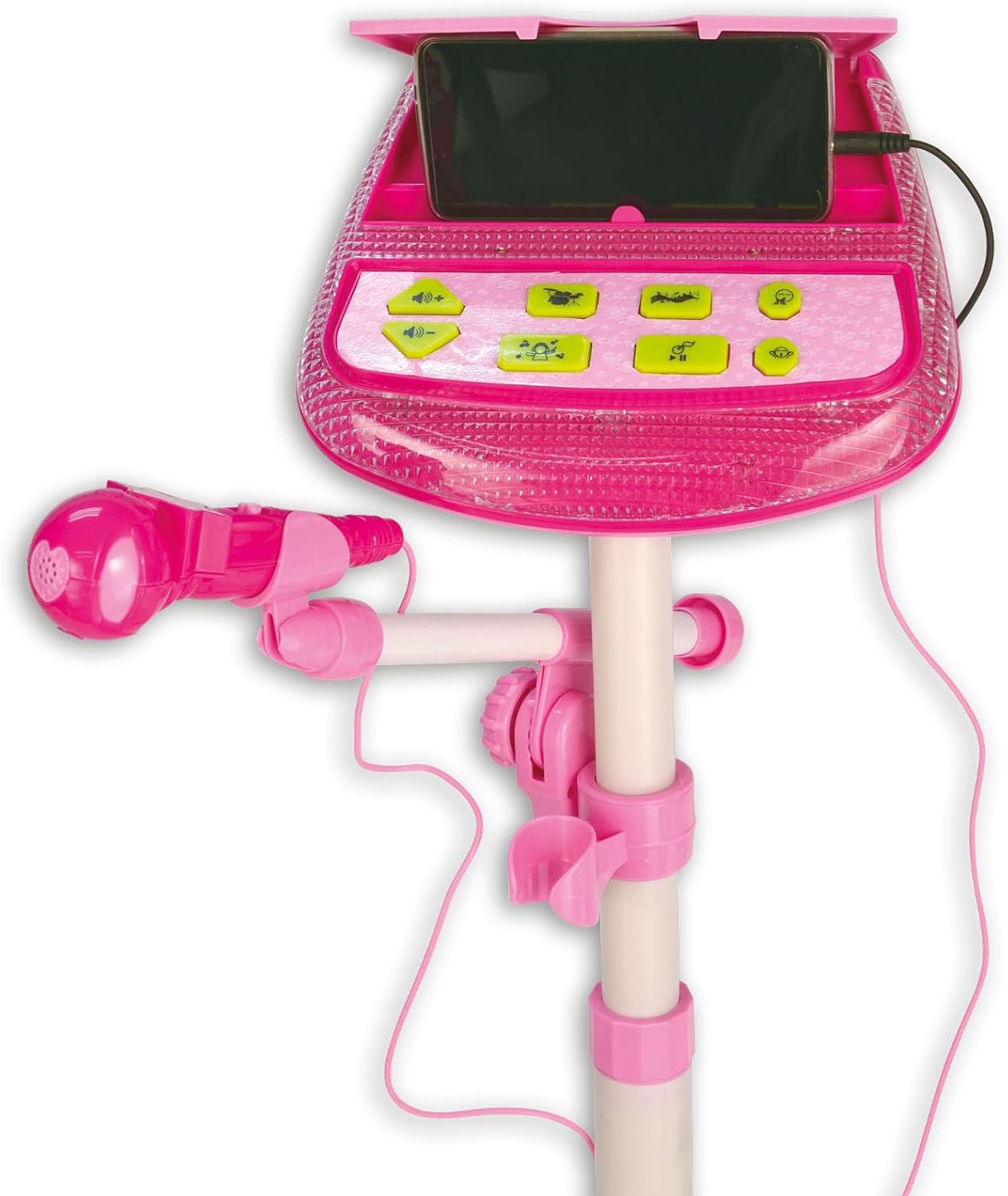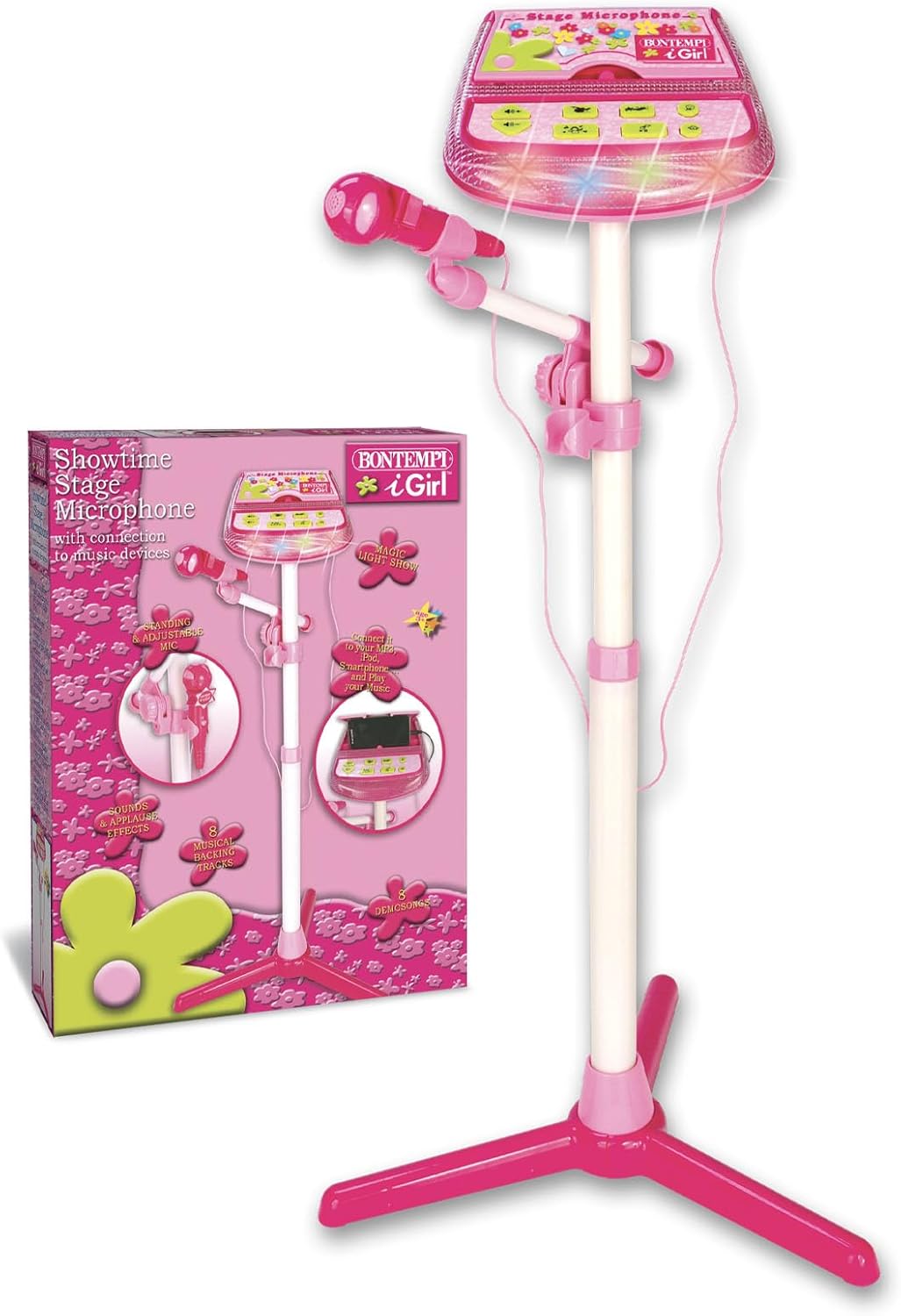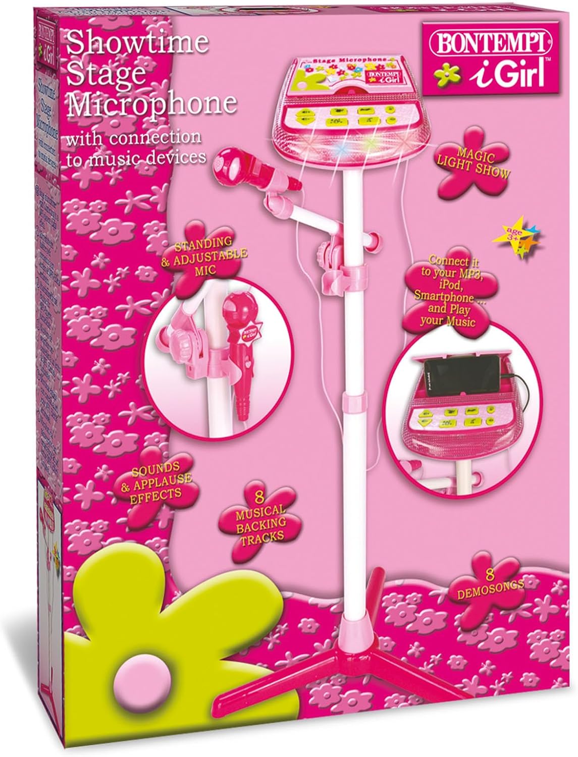 Trasforma la tua casa in un palcoscenico con questo fantastico microfono da palco Showtime Supporto per microfono regolabile Effetti sonori per applausi e folla 8 brani demo, 8 basi musicali, suoni di batteria ed effetti di luce Collegalo al tuo lettore MP3, CD e riproduci la tua musica