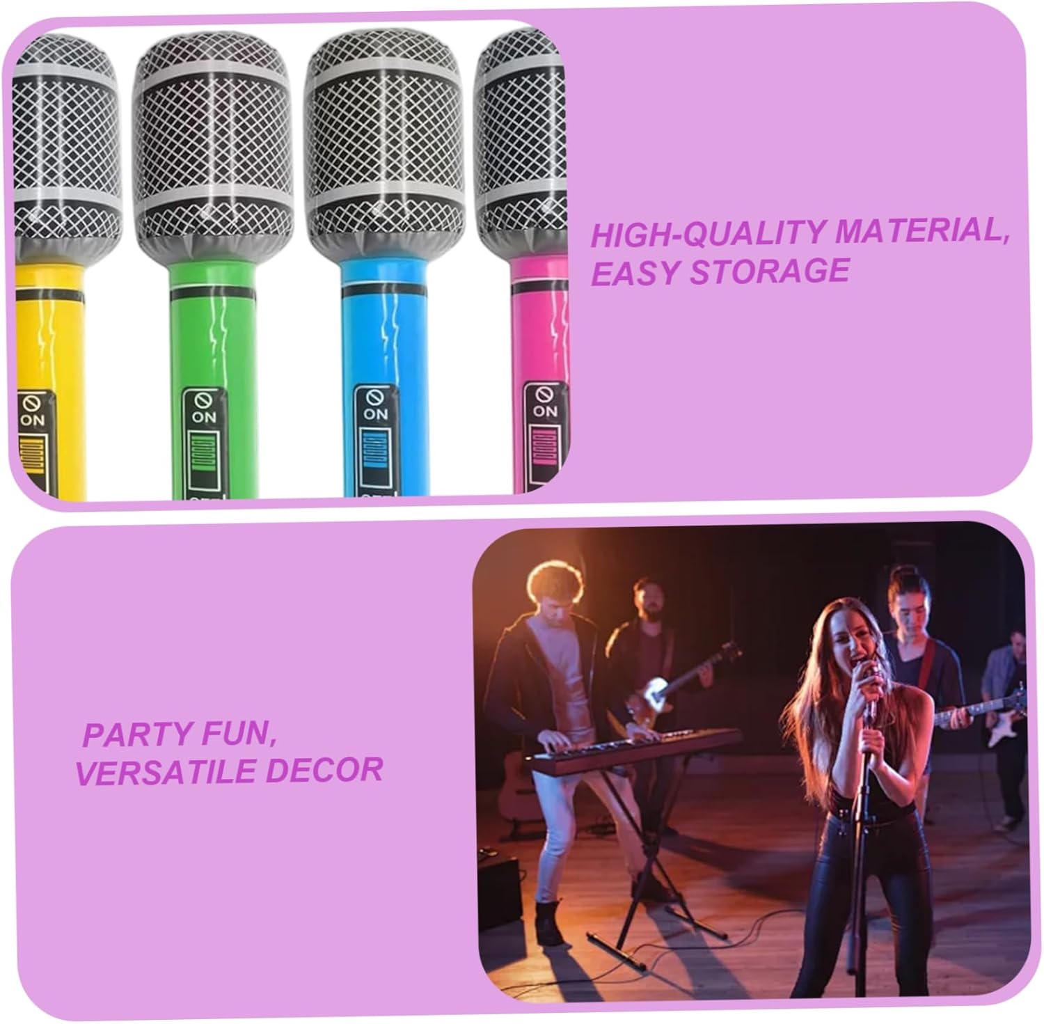 Accattivante e divertente: i colori vivaci e il design realistico di questi microfoni gonfiabili attireranno sicuramente l'attenzione e aggiungeranno un tocco giocoso alle decorazioni della tua festa. Fanno ottimi spunti di conversazione e migliorano l'atmosfera generale delle feste. Microfono gonfiabile per feste Facile da gonfiare e riporre: ogni microfono si gonfia rapidamente con pochi respiri, rendendo l'installazione un gioco da ragazzi. Quando non in uso, si sgonfiano facilmente e possono essere conservati in modo compatto, risparmiando spazio nella tua collezione di forniture per feste. Blow up Microfono Microfono Prop Accessori versatili per feste: che tu stia organizzando una serata karaoke, una festa di compleanno a tema musicale o un evento in stile concerto, questi microfoni gonfiabili sono accessori versatili che si adattano a vari temi e attività di festa. Microfoni gonfiabili per feste Strumenti gonfiabili Perfetto per le feste: questi 6 microfoni gonfiabili in PVC da 33 cm sono ideali per feste a tema concerti musicali, aggiungendo un elemento divertente e interattivo a qualsiasi celebrazione. Il design vivace e la forma realistica li rendono perfetti per foto o spettacoli teatrali. Microfono Prop Microfoni gonfiabili per feste Robusti e leggeri: realizzati in PVC, questi microfoni gonfiabili sono leggeri ma leggeri. Possono resistere a molteplici usi senza strappare o perdere forma, garantendo un divertimento duraturo per i tuoi ospiti della festa. Strumenti gonfiabili Microfono Prop