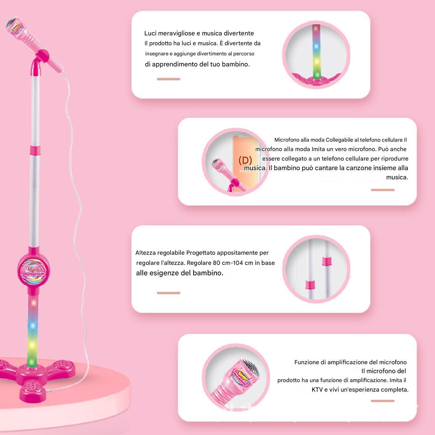 Build robusta: con una base in di resistere all'energia dei giovani artisti, questo microfono per bambini è costruito con materiale PP robusto e progettato con colori vivaci da aggiungere all'esperienza divertente. Il suo design accattivante assicura ogni volta un supporto per le prestazioni costanti Giorvio delle celebrazioni: progettato magnificamente per una facile configurazione, assicurando ore di gioco, cantare e ballare con gli amici, rendendo memorabile ogni raduno. per chi ama cantare e ballare Funzione di collegamento: si collega al cellulare per espandere la selezione delle canzoni, consentendo ai bambini di cantare con canzoni preferite mentre una musica deliziosa senza limiti. connesso e canta all'aperto con la funzione di connettività del microfono Stand, perfetta per il viaggio e il gioco all'aperto Senza l'applicazione di seccatura: l'utilizzo di questo supporto per il microfono per i bambini trasformerà il canto in una performance simile a un palcoscenico, aggiungendo una nuova dimensione di divertimento alla loro esperienza di canto. Sia tenuto in mano o rimossa dallo stand, la semplice azione migliora il canto, rendendo facile da usare Presente pratico: stimola l'immaginazione di tuo figlio con un supporto per microfono sonoro colorato e realistico, rendendolo un regalo per vacanze, Halloween, Natale e compleanni. Ideale per il gioco creativo, facile da usare e sicuro di sorprendere le bambine, è un ottimo modo per intrattenere i tuoi piccoli artisti