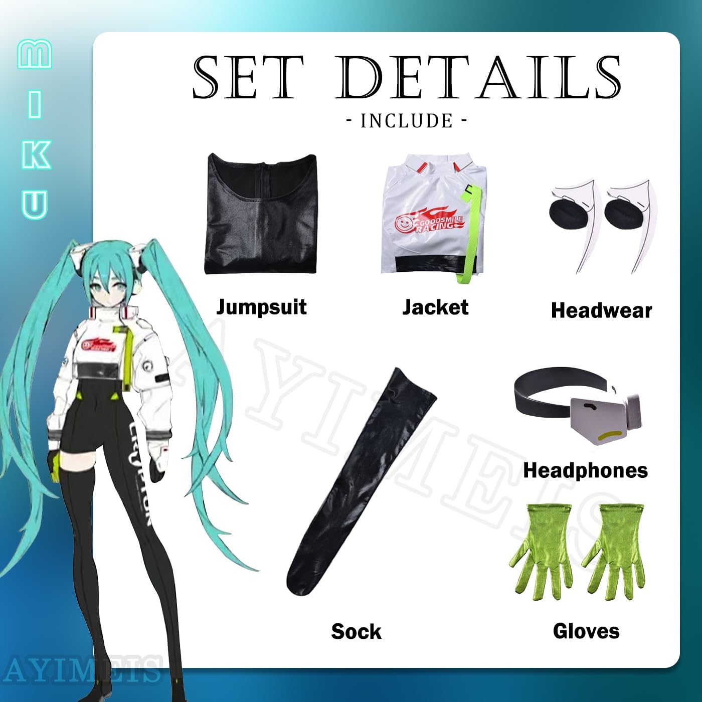 【Il pacchetto include】 - Tuta *1, Giacca *1, Accessori per capelli *2, Calzini *1, Auricolari *1, Guanti *2, Parrucca *1 (come mostra l'immagine). 【Materiale principale】 - Poliestere. Realizzato in materiale di alta qualità, morbido, comodo da indossare e abbastanza resistente. 【Caratteristiche dell'abbigliamento】 - Costume Cosplay di Cantante Virtuale Miku, Ripristinando i dettagli dell'abbigliamento di un personaggio animato, con un set completo di accessori, consente di completare facilmente il gioco di ruolo. 【Ampia applicazione】 - Perfetto per feste in costume a tema, festival, Natale, Halloween, carnevali, feste, performance sul palco, fotografia, Comic Con, Cosplay ecc. 【Riferimento taglia】 - Per assicurarti di ottenere una taglia adatta a te, fare riferimento alla nostra tabella delle taglie prima dell'acquisto (ultima foto).