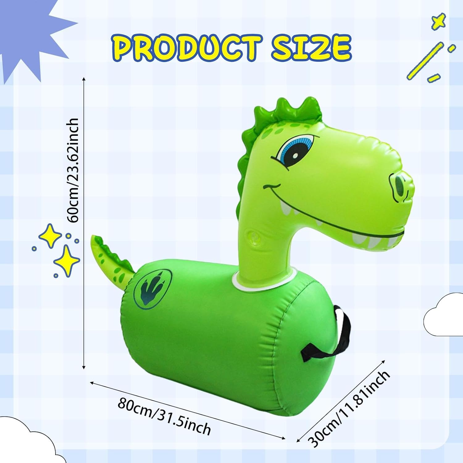 【Ottimo regalo】: giocattolo gonfiabile a forma di dinosauro con adorabile design a cartoni animati, è un ottimo regalo di compleanno e di Capodanno per bambini, ragazzi e ragazze. 【Dimensioni】: il giocattolo gonfiabile per bambini misura 80 cm x 30 cm x 60 cm / 31,50 pollici x 11,81 pollici x 23,62 pollici, offrendo ampio spazio ai bambini per sedersi comodamente mentre rimbalzano 【Materiale】: Realizzato in materiale PVC di qualità, questo giocattolo gonfiabile per bambini garantisce durata e utilizzo prolungato. 【Gioco divertente all'aperto e al chiuso】: ideale sia per pavimenti interni che per esterni, patii, cortili o qualsiasi superficie liscia, questo giocattolo gonfiabile da equitazione offre infinite opportunità di divertimento ed esercizio per i bambini in ambienti esterni 【Portatile】: Il design gonfiabile lo rende facile da installare e riporre quando non in uso, facile da trasportare. I genitori possono unirsi al divertimento rimbalzante con i loro figli, rafforzando le relazioni e creando ricordi gioiosi .