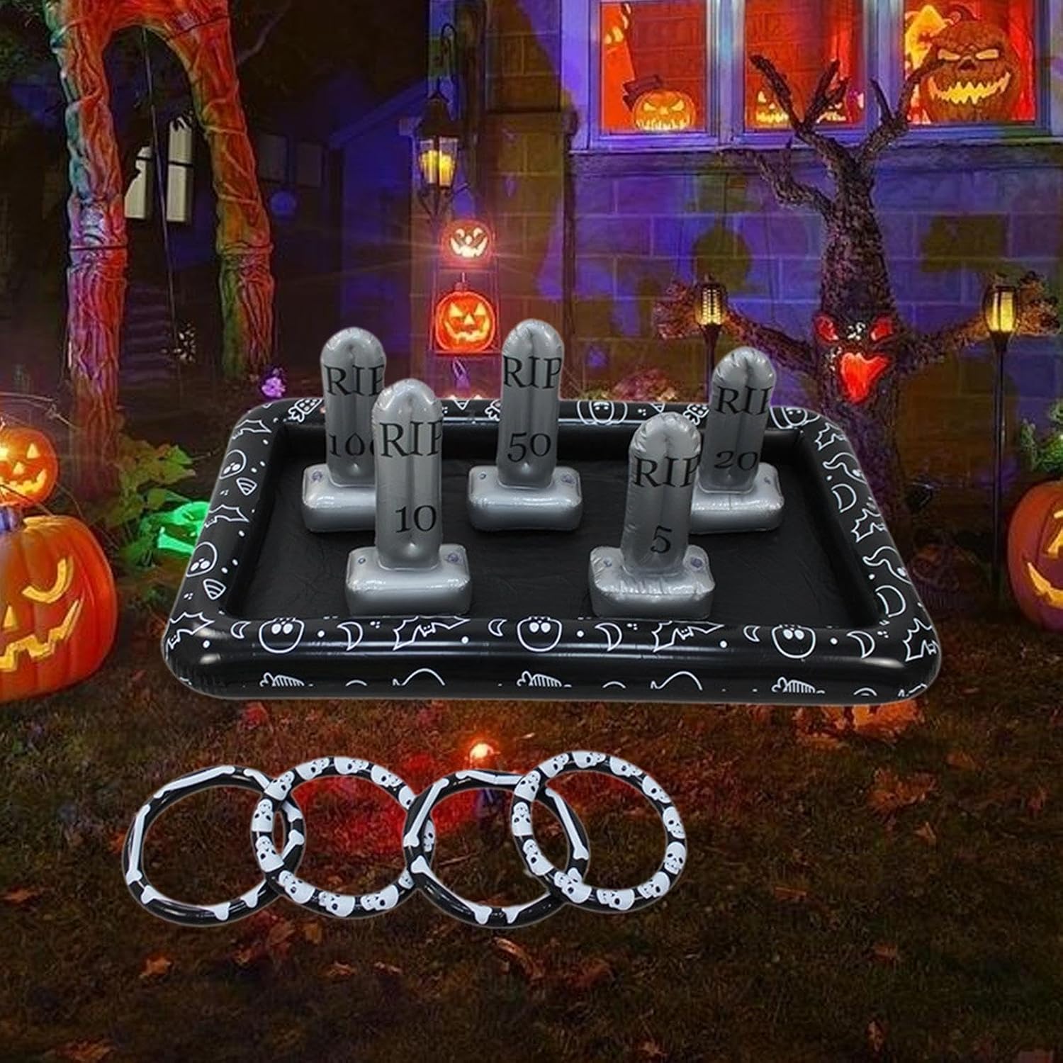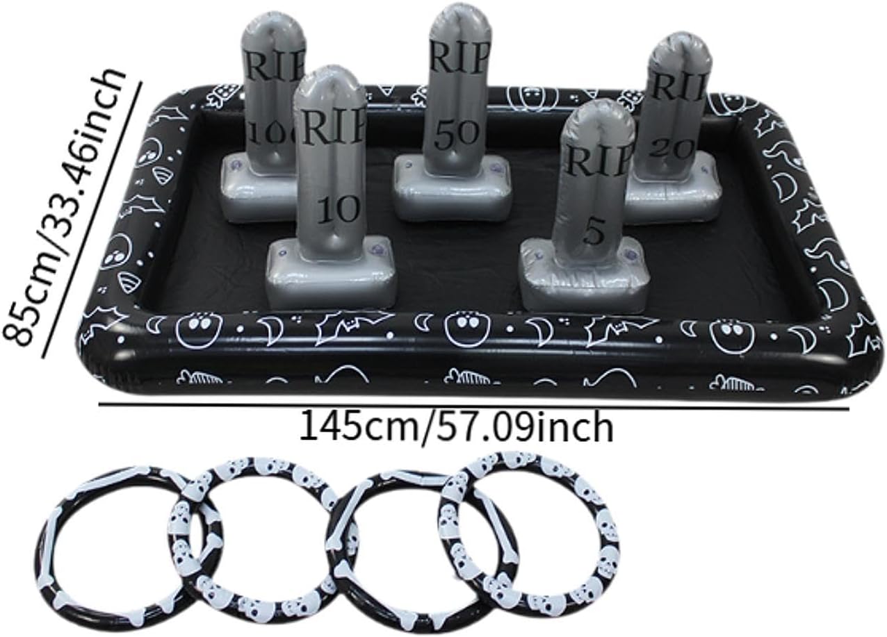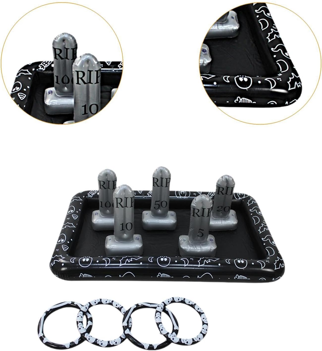 【Divertente gioco da giardino per feste 】: posiziona questi anelli gonfiabili a forma di lapide nel tuo giardino, prato e all'aperto. Questa è un'ottima festa di Halloween. La tua famiglia e i tuoi amici lo adoreranno! Questo è un gioco da aggiungere al tuo . 【Facile da gonfiare e sgonfiare】: basta gonfiare e posizionare la lapide gonfiabile sulla base, quindi riempirla d'acqua per renderla stabile sull'erba o sul pavimento. Gioca con questi anelli per ottenere punti. Aggiungi divertimento alla tua famiglia con questo gioco di lancio degli anelli. 【Giochi di Halloween per bambini】: Crea una divertente festa sportiva o un carnevale scolastico con il gioco del lancio de anelli. Gioca a questi giochi per aiutare a sviluppare la coordinazione occhio-mano del bambino; contare anelli durante il gioco può allenare le capacità matematiche. 【Robusto e facile da riporre】: puoi usarlo molte volte, gioca a questo divertente gioco di lancio con i tuoi amici durante Halloween che ti durerà per tutta la stagione 【Ottime dimensioni per i giochi di carnevale】: Gioco di lancio di anelli con lapide gonfiabile di grandi dimensioni 145 cm x 85 cm / 57,09 pollici x 33,46 pollici. 10 in 1, questo set include 1 base gonfiabile, 5 lapidi mobili e 4 anelli di lancio. Ci sono 5, 10, 20, 50, 100 punti, puoi iniziare una competizione.