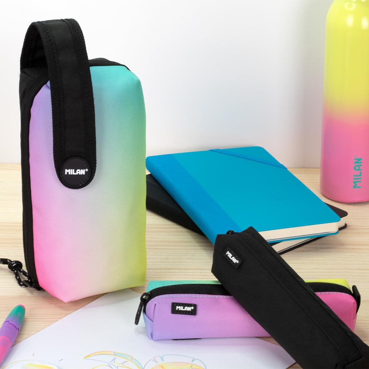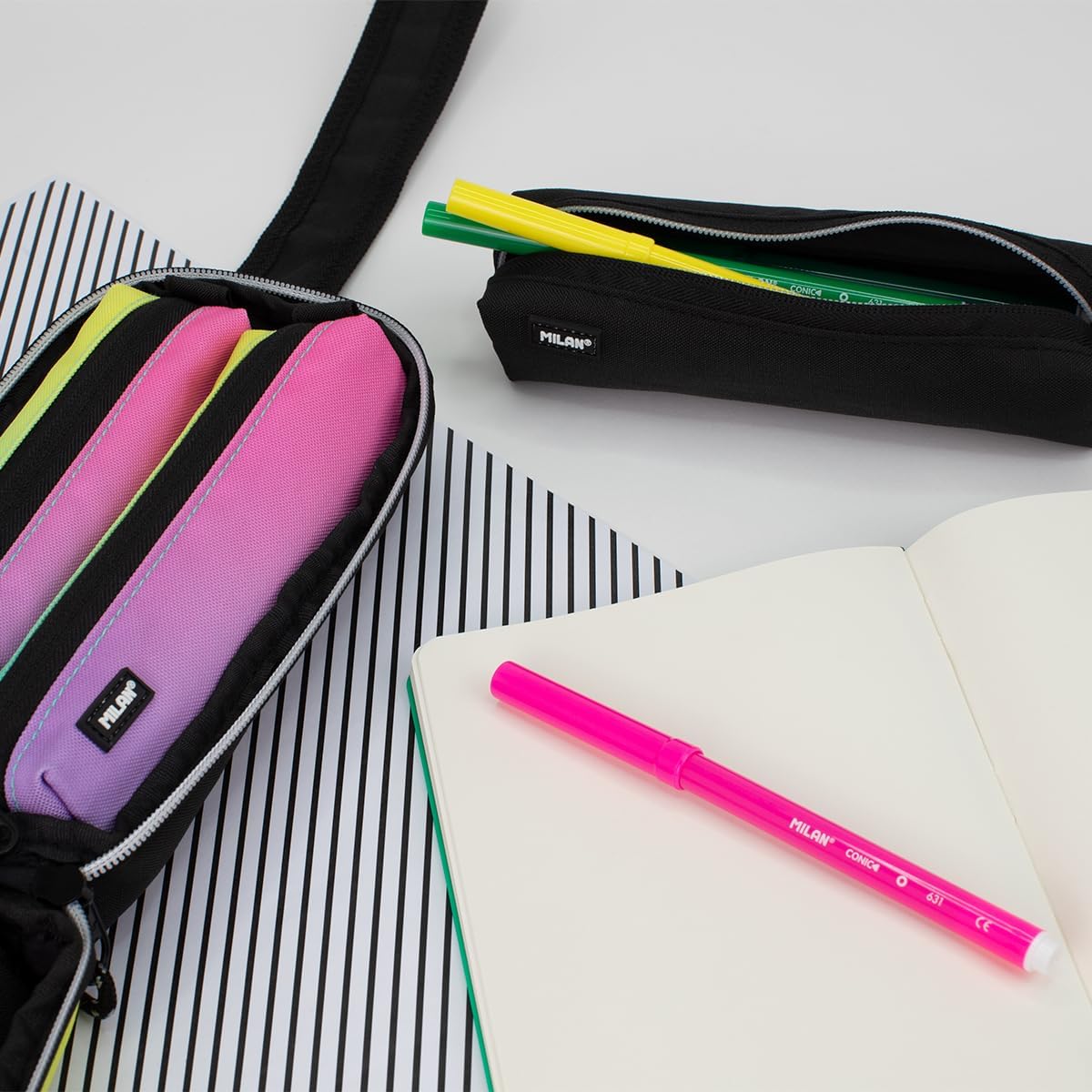 Set di 4 astucci con contenuto per mantenere il materiale scolastico ordinato e facilmente accessibile. Le 4 tasche interne possono essere rimosse e riposizionate grazie al velcro. Serie Sunset, nero Una combinazione di colori sfumati ispirati al tramonto, accompagnati da dettagli in bianco e nero. Cerniere con coulisse. Con 2 tasche interne rosa e 2 colori sfumati. Materiale scolastico incluso: 1 gomma color crema 320 Giallo tramonto, 1 temperamatite AFILA, 1 matita in grafite HB, 3 penne a sfera CAPSULE (blu, nera e rossa), 1 righello da 15 cm, 12 matite colorate e 12 punte coniche. Tessuto Ripstop: leggero e resistente agli strappi. Utilizza una tecnica speciale che intreccia spessi fili di rinforzo a intervalli regolari secondo uno schema a forma di croce. Composizione del materiale: fodera esterna e interna in poliestere. Dimensioni: 22,5x11,5x11 cm.