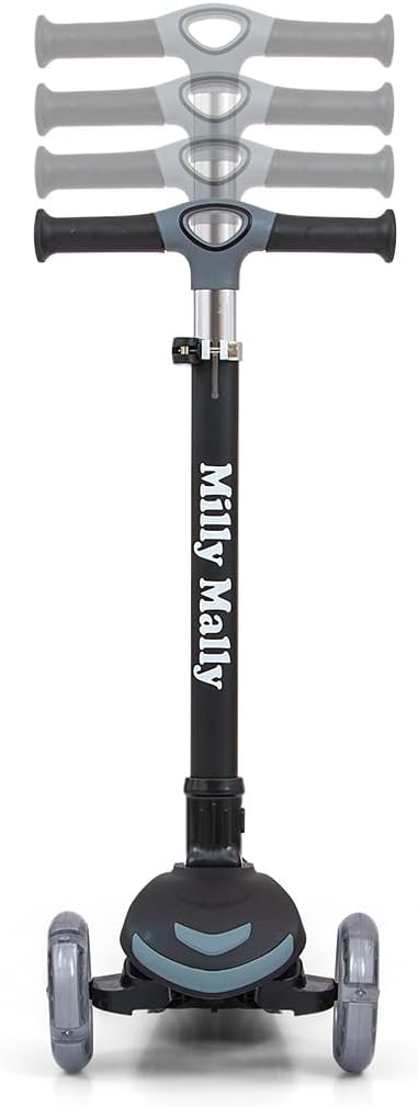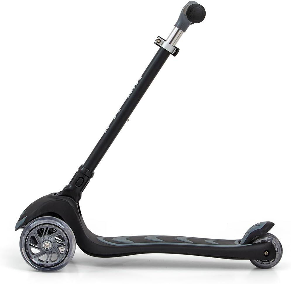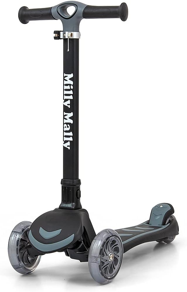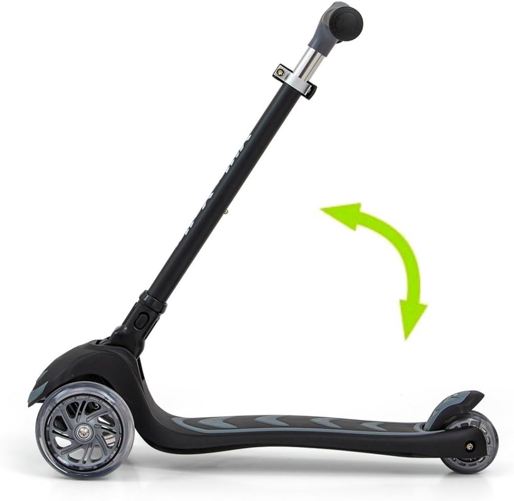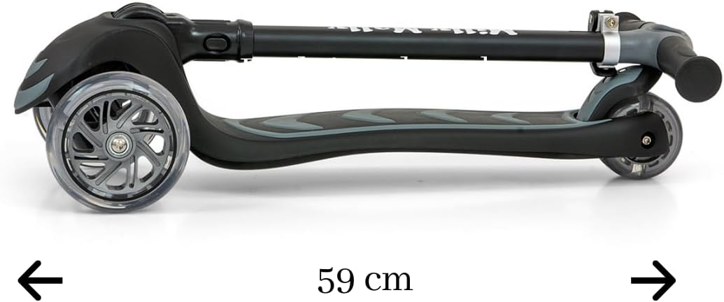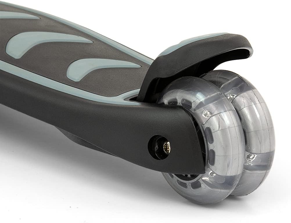 Costruzione leggera e robusta (alluminio, plastica rinforzata). Un design impressionante ed elegante. Lo scooter è perfettamente bilanciato e stabile, quindi è sicuro da usare. Ulteriore stabilità e sicurezza sono garantite dalla formula a tre ruote dello scooter. L'impugnatura del manubrio è realizzata in un materiale morbido e piacevole che impedisce alla mano di scivolare. Regolazione altezza manubrio in 3 posizioni tramite morsetto aggiuntivo. Inoltre, la possibilità di ripiegare il manico (senza attrezzi e in pochi secondi utilizzando un solo pulsante) rende lo scooter molto pratico da trasportare e trasportare. Controllo: la rotazione funziona secondo il principio dell'equilibrio del corpo, consentendo una guida completamente intuitiva. Piattaforma antiscivolo. Ruote in gomma per una guida silenziosa, realizzate con materiali di alta qualità per una guida silenziosa e una buona presa. Le ruote anteriori brillano: PU 120 * 30 mm. Una doppia ruota posteriore innovativa e luminosa: PU 80 * 24,5 mm. Luci LED colorate e luminose illuminano il viaggio e aumentano il piacere di guida. Cuscinetto: ABEC-7. Lo scooter è dotato di freno – parafango posteriore. Carico massimo fino a 50 kg. Fascia d'età 3+.