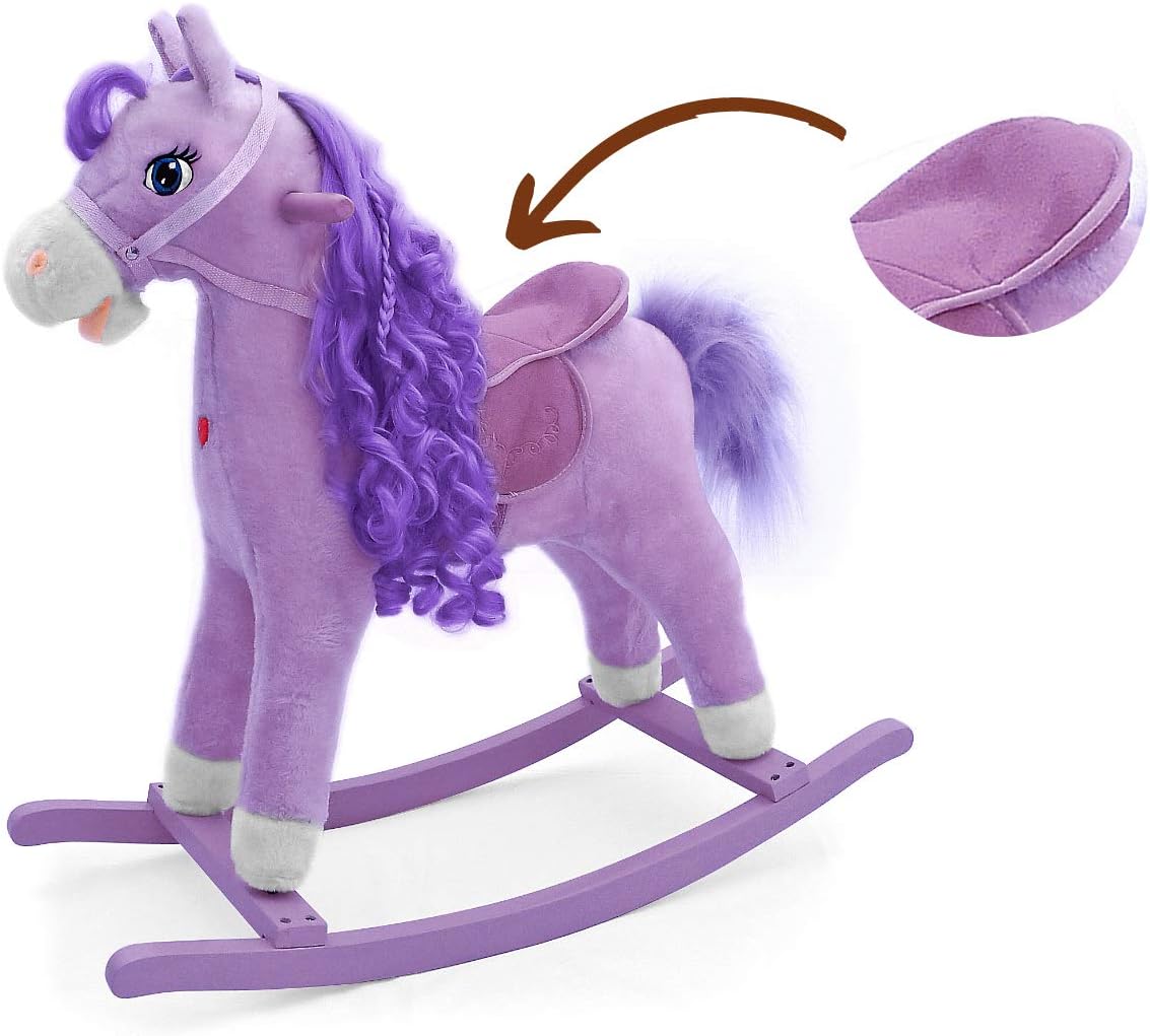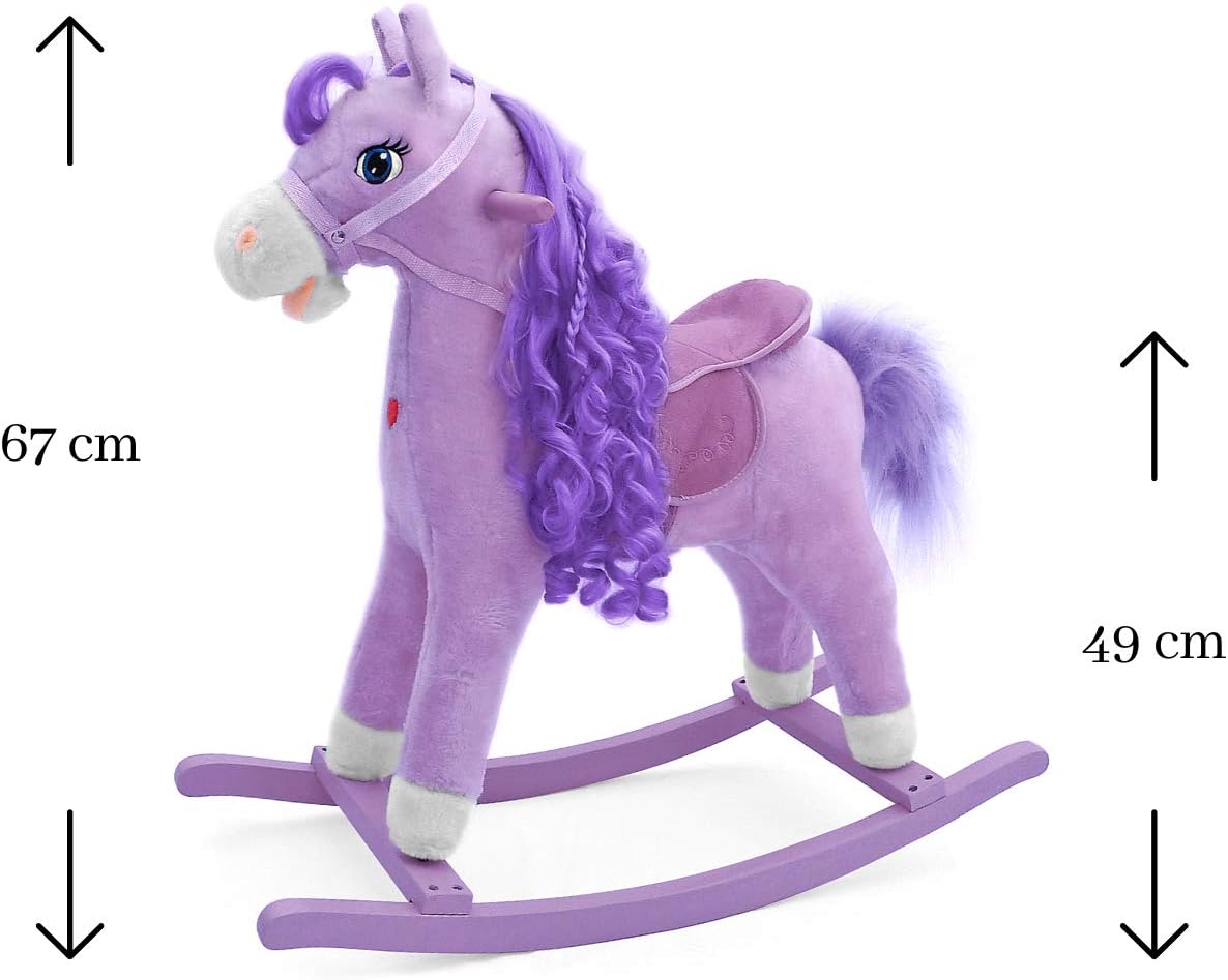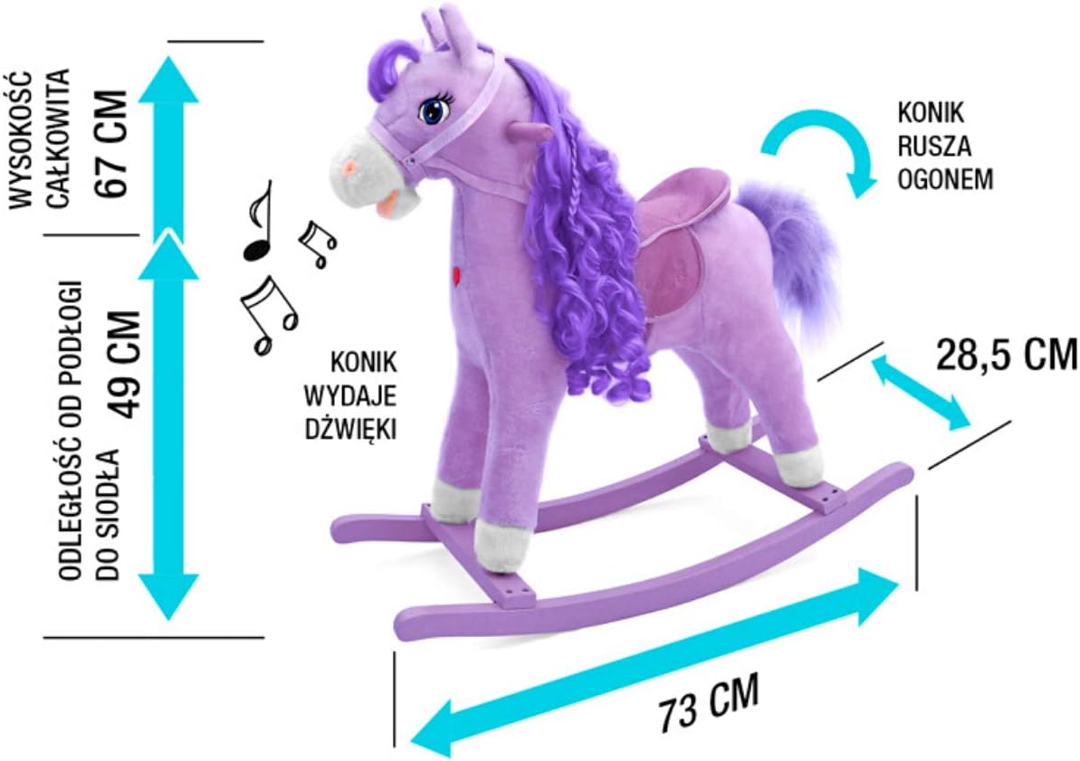 The rocking horse is made of soft plush, every child dreams of such a toy. Apart from the traditional rocking function, it has a number of attractive options that will make the play more pleasant and attractive: it moves its tail and snout, makes noises and has a glowing heart. The horse has a saddle, wooden rockers and wooden handles.