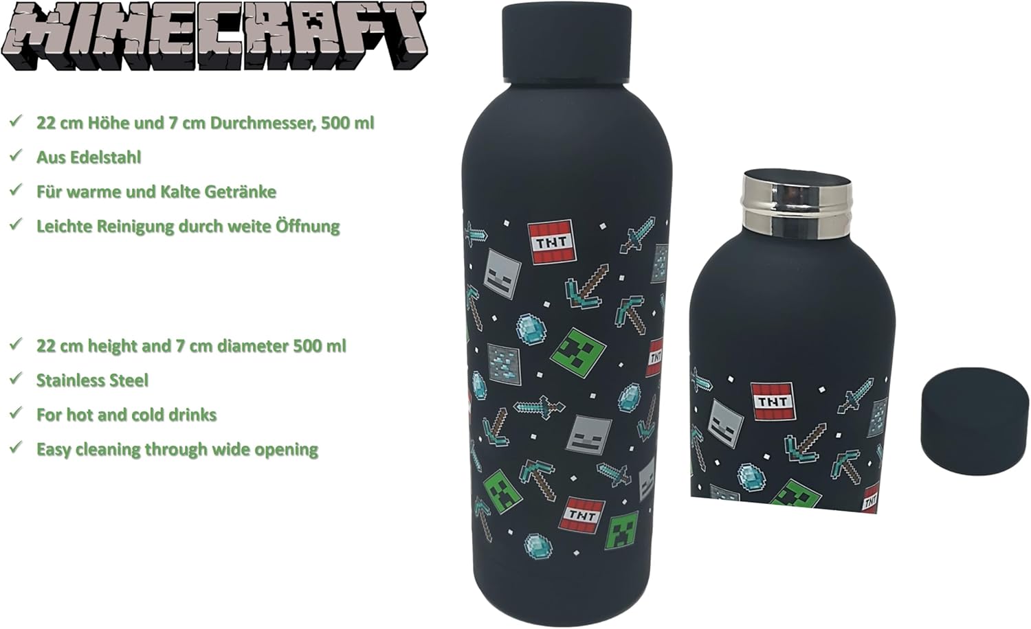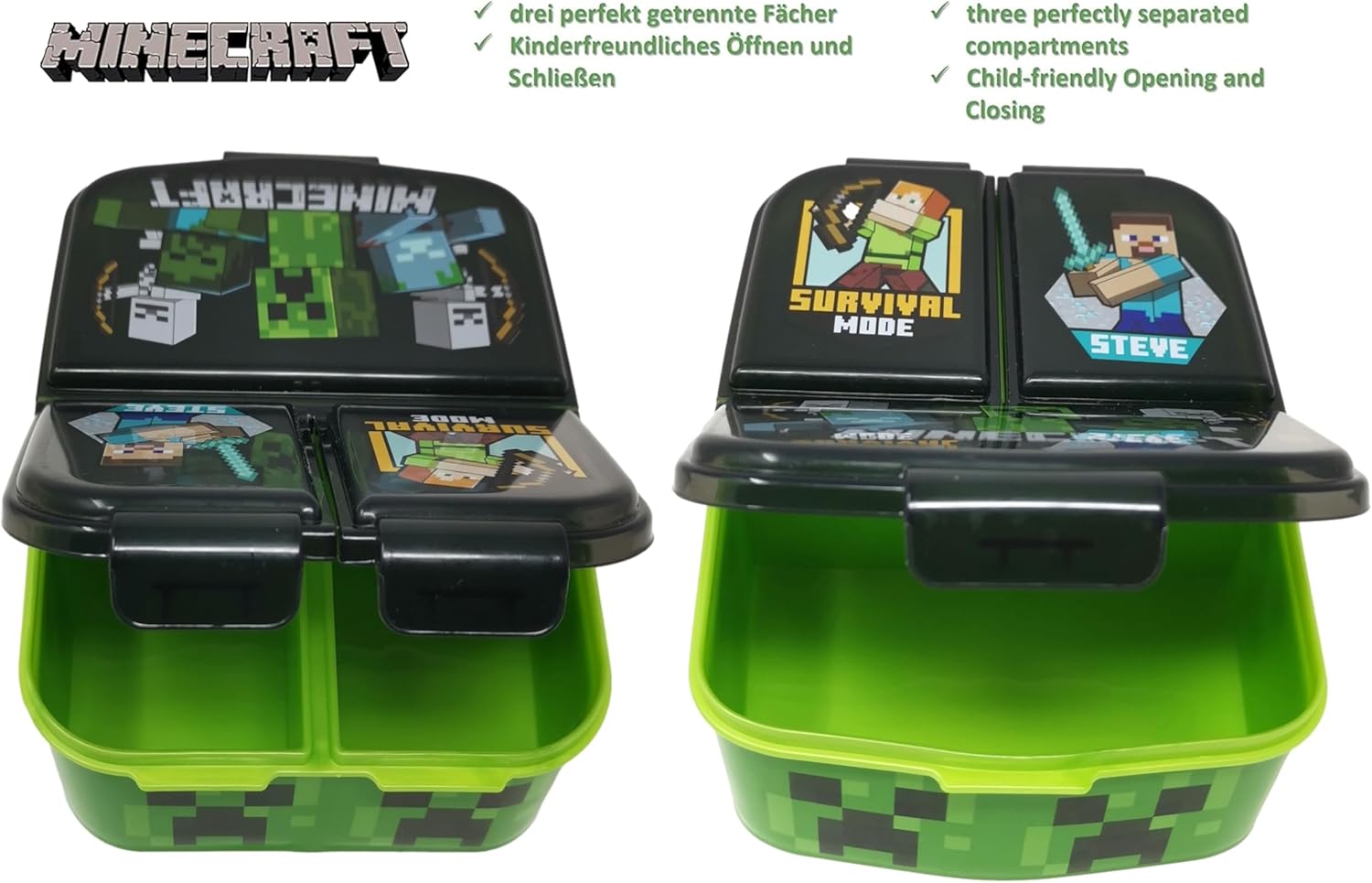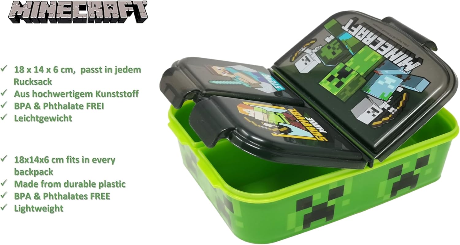 Il nostro set composto da 1 contenitore per il pranzo + 1 borraccia della collezione ufficiale Minecraft Merchandise è il regalo perfetto per i fan di Minecraft e Creepers! Stampato di alta qualità con un colorato motivo Creeper, questo set è l'attrazione a scuola, durante lo sport o in viaggio per bambini e adolescenti. Il contenitore per il pane ha tre scomparti perfettamente separati: non passa da uno scomparto all'altro, mantengono il cibo ordinato e protetto. Il coperchio della scatola per sandwich è adatto ai bambini e si apre e si chiude facilmente, può essere rimosso completamente al centro per rendere il contenitore più facile da pulire. Con una lunghezza di 18 cm, altezza: 6 cm, profondità: 14 cm in plastica di alta qualità, priva di sostanze nocive come BPA e ftalati, resistente e di qualità alimentare, la nostra scatola per il pranzo intelligente è ideale per il trasporto e si adatta a qualsiasi zaino. Nota: non adatto per lavastoviglie o microonde. Pulire prima del primo utilizzo. La borraccia a prova di perdite è realizzata in acciaio inox, priva di sostanze nocive e senza BPA, insapore, di qualità alimentare, resistente al calore, leggera, infrangibile e adatta per bevande fredde e calde. Con una capacità di 500 ml e dimensioni: da 22 cm di altezza e diametro: 7 cm, questa borraccia intelligente è ideale per il trasporto e si adatta a qualsiasi zaino. Nota: non adatto per lavastoviglie o microonde. Pulire prima del primo utilizzo