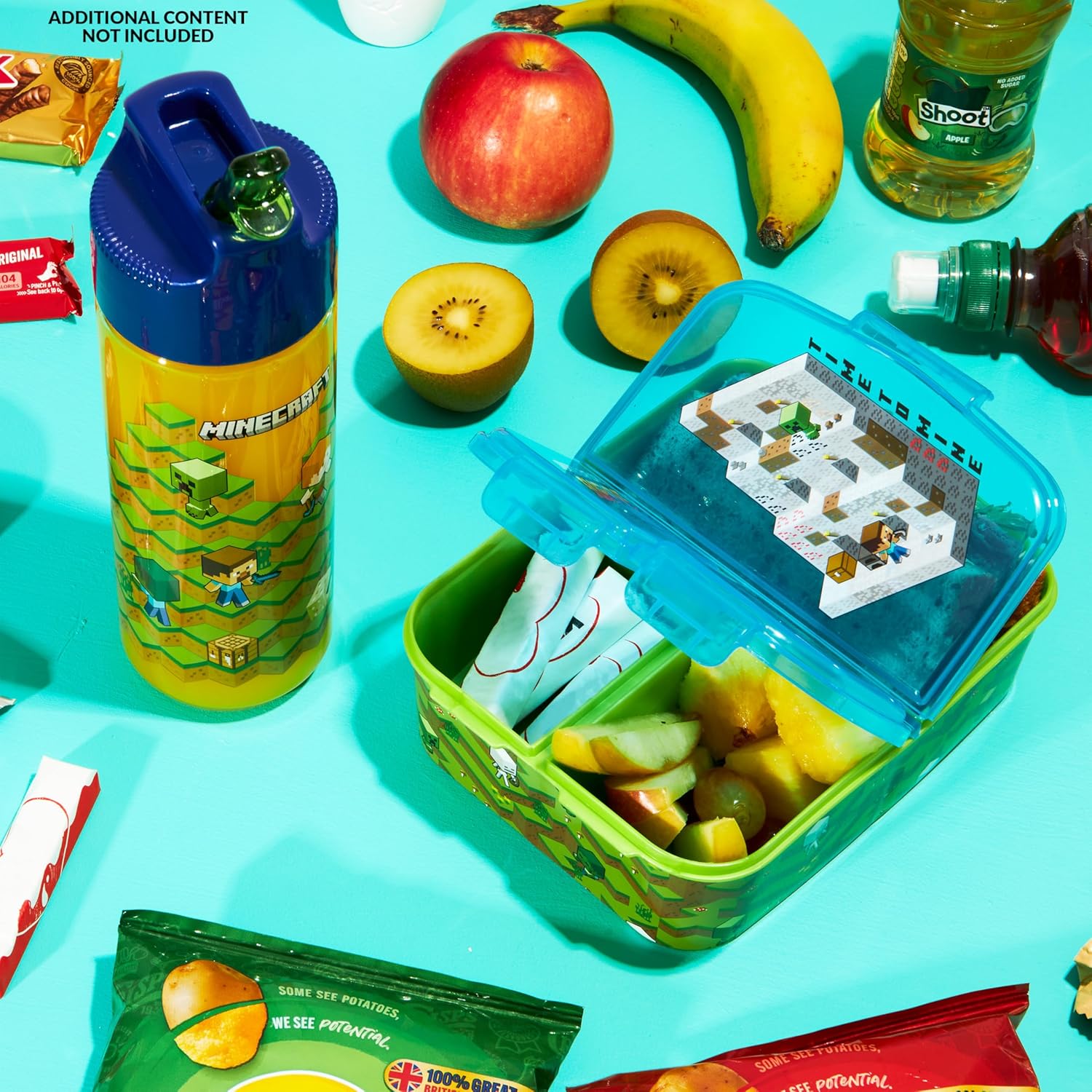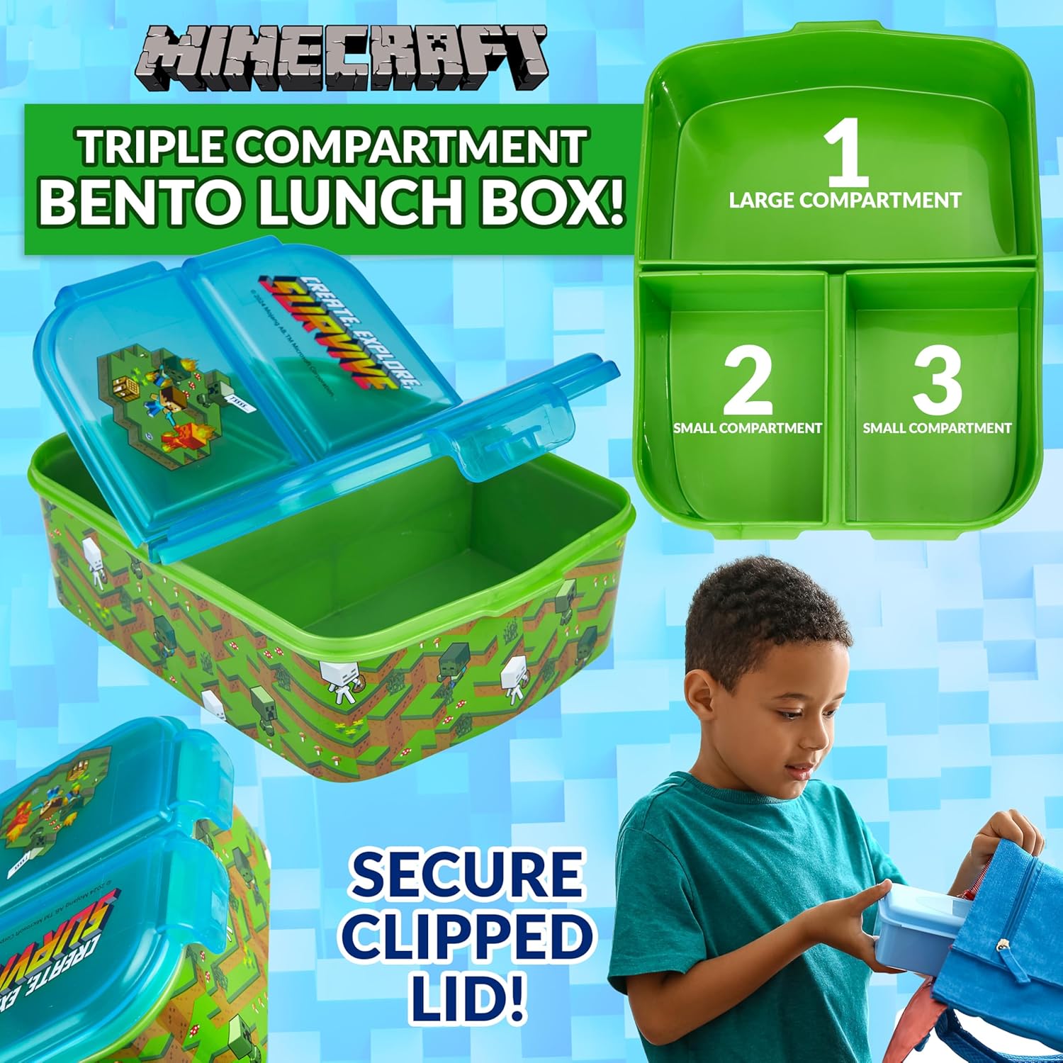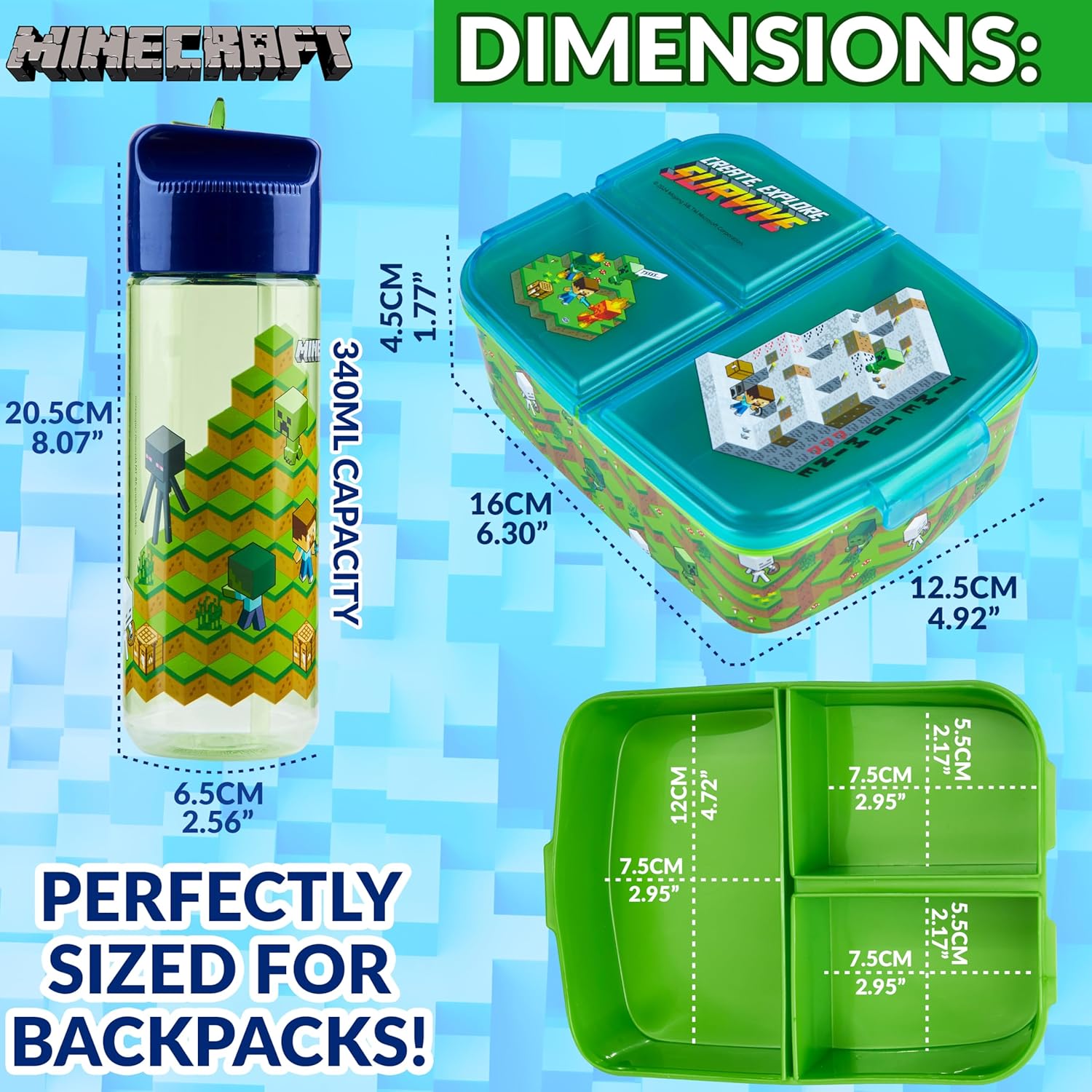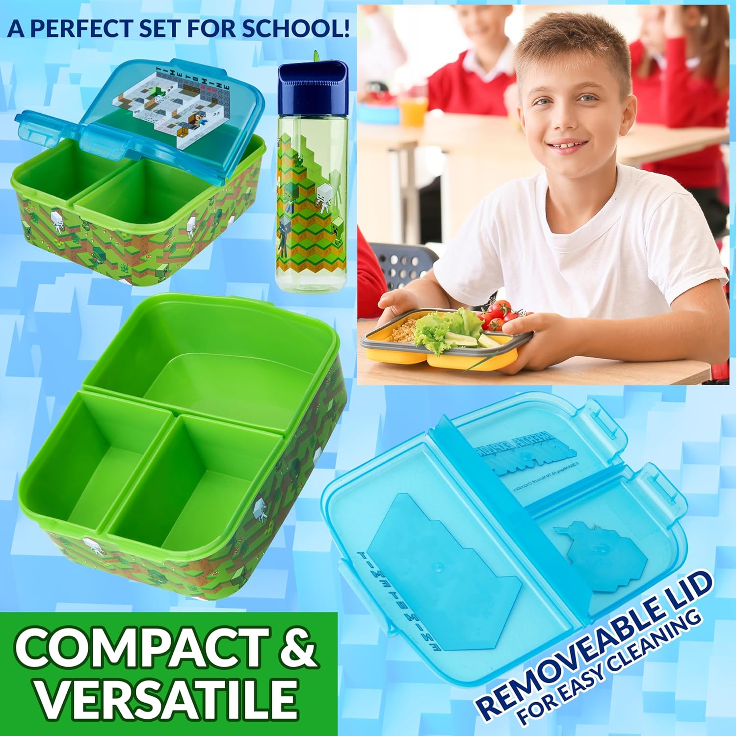 Set Portamerenda e Bottiglia Acqua Bambini - Questo set porta merenda scuola e borraccia Minecraft è ideali per i giovani fan. Con vivaci design dei personaggi, aggiunge divertimento a ogni pasto e rende l'ora di pranzo più piacevole. Lunch Box Bambini Bento - Il porta pranzo bambini presenta tre scomparti per un pasto equilibrato. La sezione più grande è ideale per i panini, mentre quelle più piccole sono ideale per frutta, verdura o spuntini. Minecraft Bottiglia Bambini - La borraccia plastica bambini inclusa ha un coperchio a ribalta e una cannuccia integrata, per garantire una bevanda senza fuoriuscite. Con una capacità di 340 ml, è ideale per rimanere idratati in movimento. Set Versatile - Ideale per la scuola o le gite, questo portamerenda Minecraft set compatto e leggero si adatta facilmente a zaini o borse per il pranzo. È una scelta comoda per pasti e idratazione in movimento. Ideale Minecraft Regali Bambino - Questo set, prodotto ufficiale accessori Minecraft, è un regalo fantastico per i giovani giocatori. È pratico e divertente, il che lo rende ideale per compleanni, ritorno a scuola o occasioni speciali.