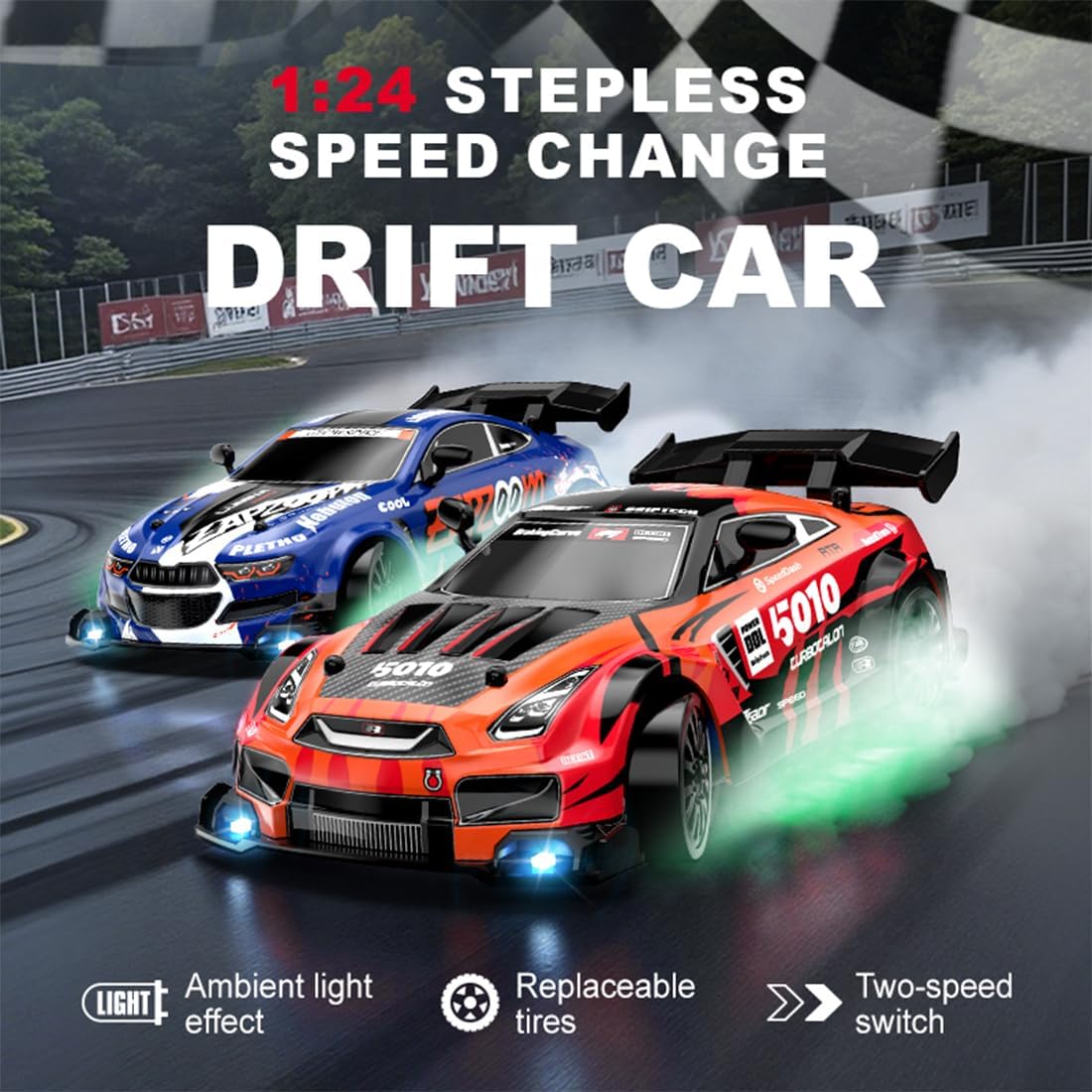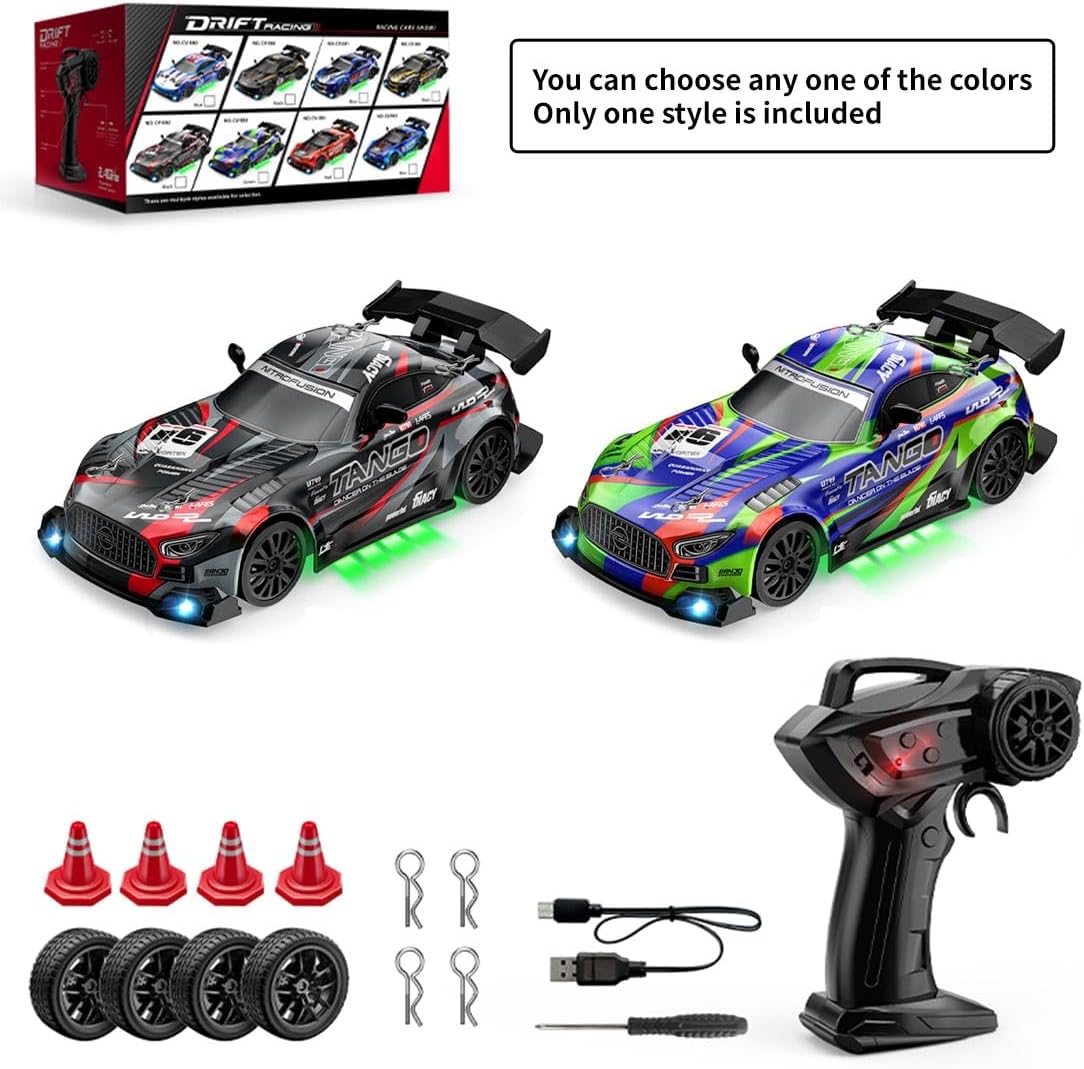Mini auto RC Drift Car, scala 1/24 2.4 G a velocità variabile Drift RC auto con ruote, pneumatici stradali e barriere al traffico, sistema di illuminazione a LED dinamico, regalo per adulti
